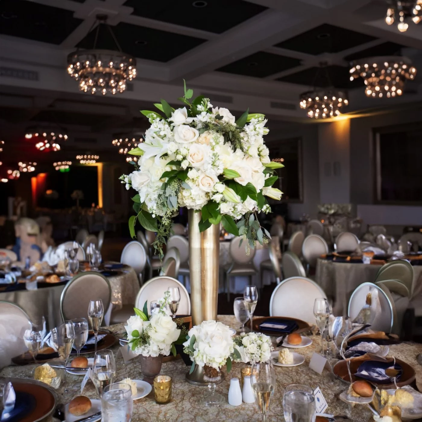 Большая настольная композиция для украшения мероприятий. Стильная, высокая золотая ваза прекрасно гармонирует с белыми цветами. В состав этой композиция входит ароматная лилия и маттиола. Украсьте свой праздник нашими композициями из цветов.