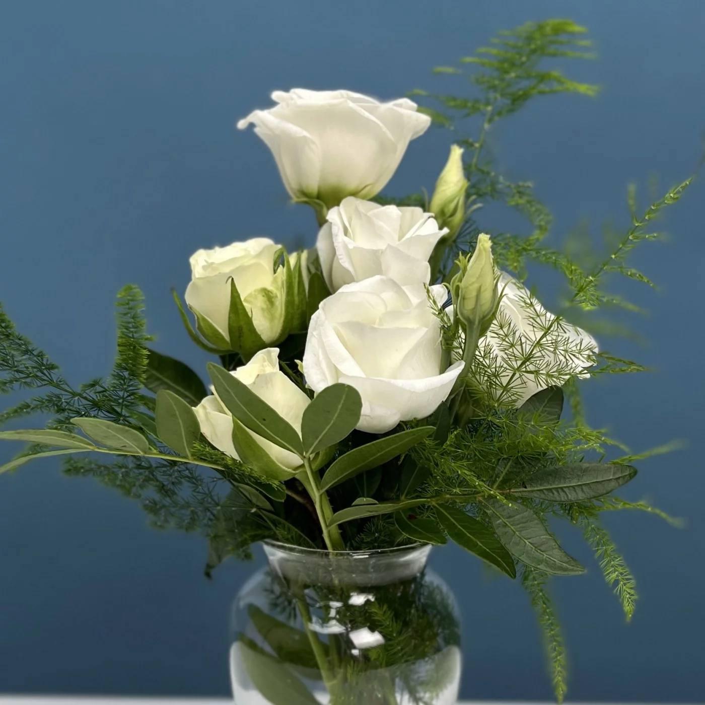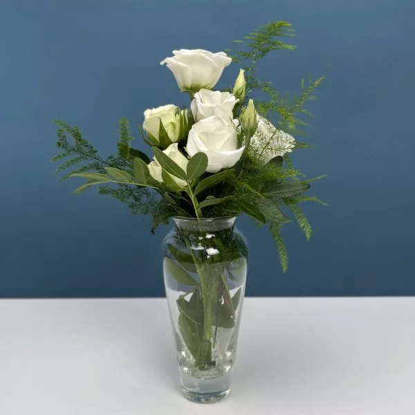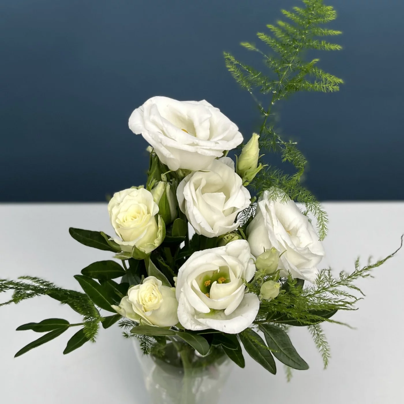 Композиция «Белый танец» с эустомой станет прекрасным акцентом в вашем доме, добавляя нотки нежности и утонченности. Она идеально подойдет для свадеб, романтических ужинов или просто для создания уютной атмосферы.