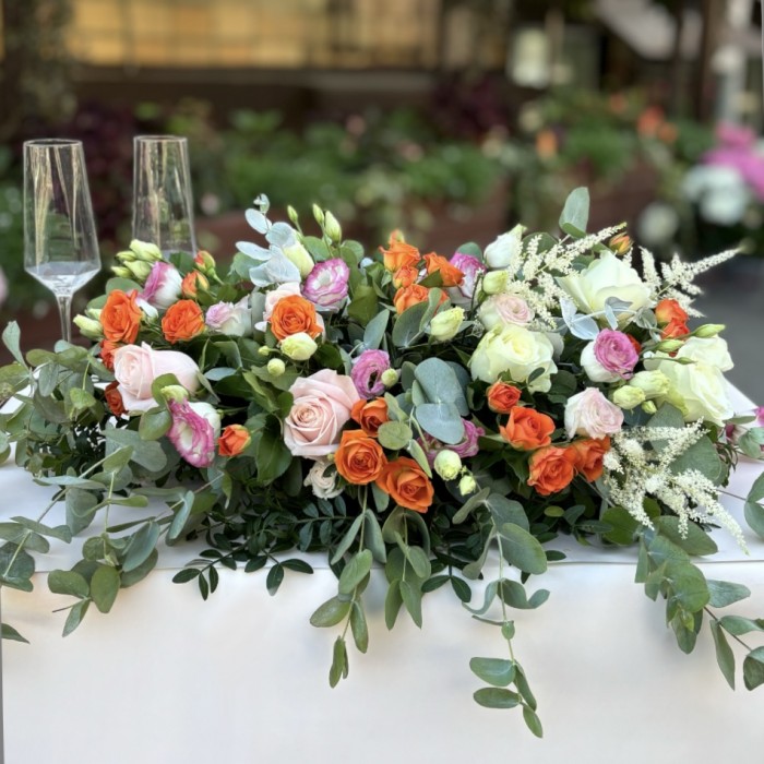Настольная композиция для украшения праздничного стола жениха и невесты, в составе которой присутствуют нежные розовые розы, эустомы и яркие кустовые розы. Композиция прекрасно подойдет для оформления свадьбы и других мероприятий.