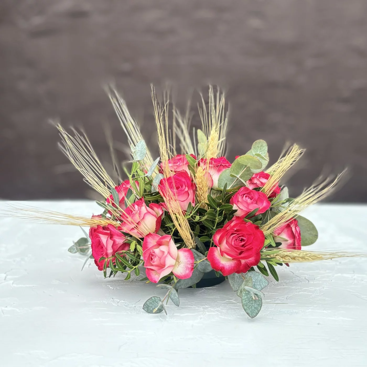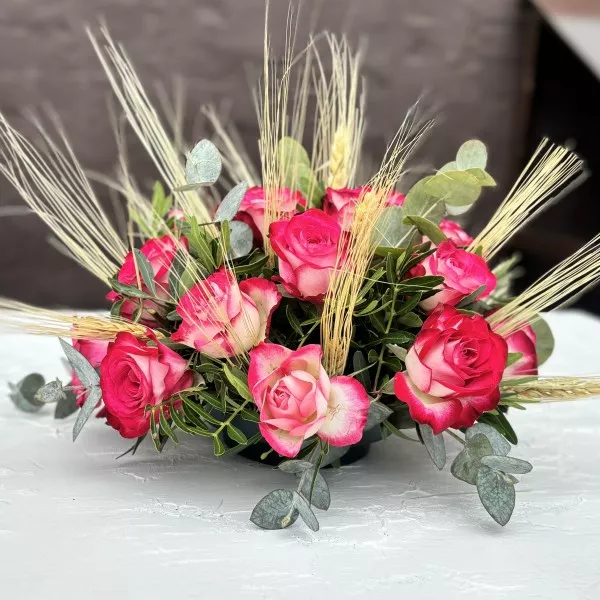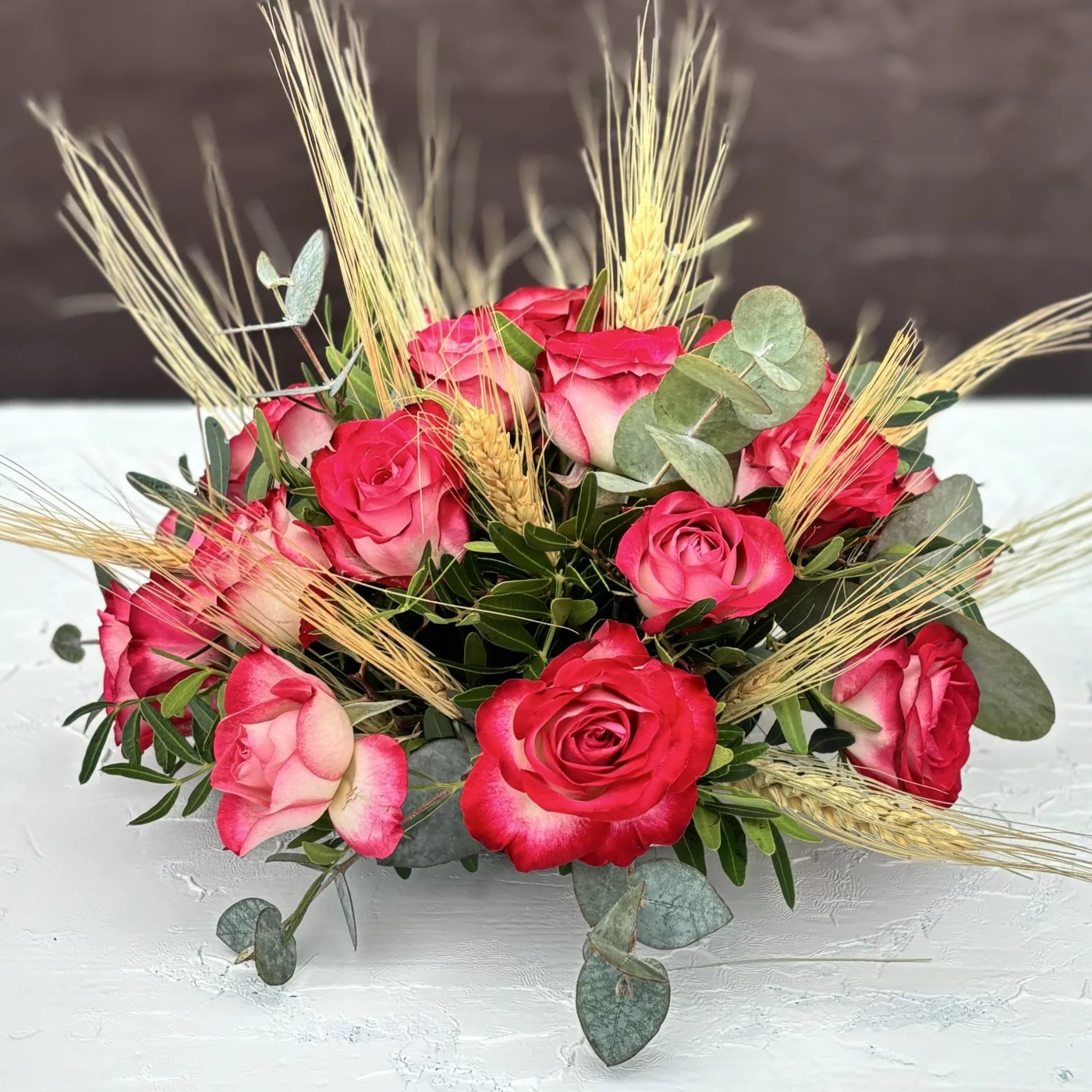 Настольная композиция для украшения праздничного стола жениха и невесты, в составе которой присутствуют кустовые розы малинового цвета и сухоцветы. Композиция прекрасно подойдет для оформления свадьбы и других мероприятий.