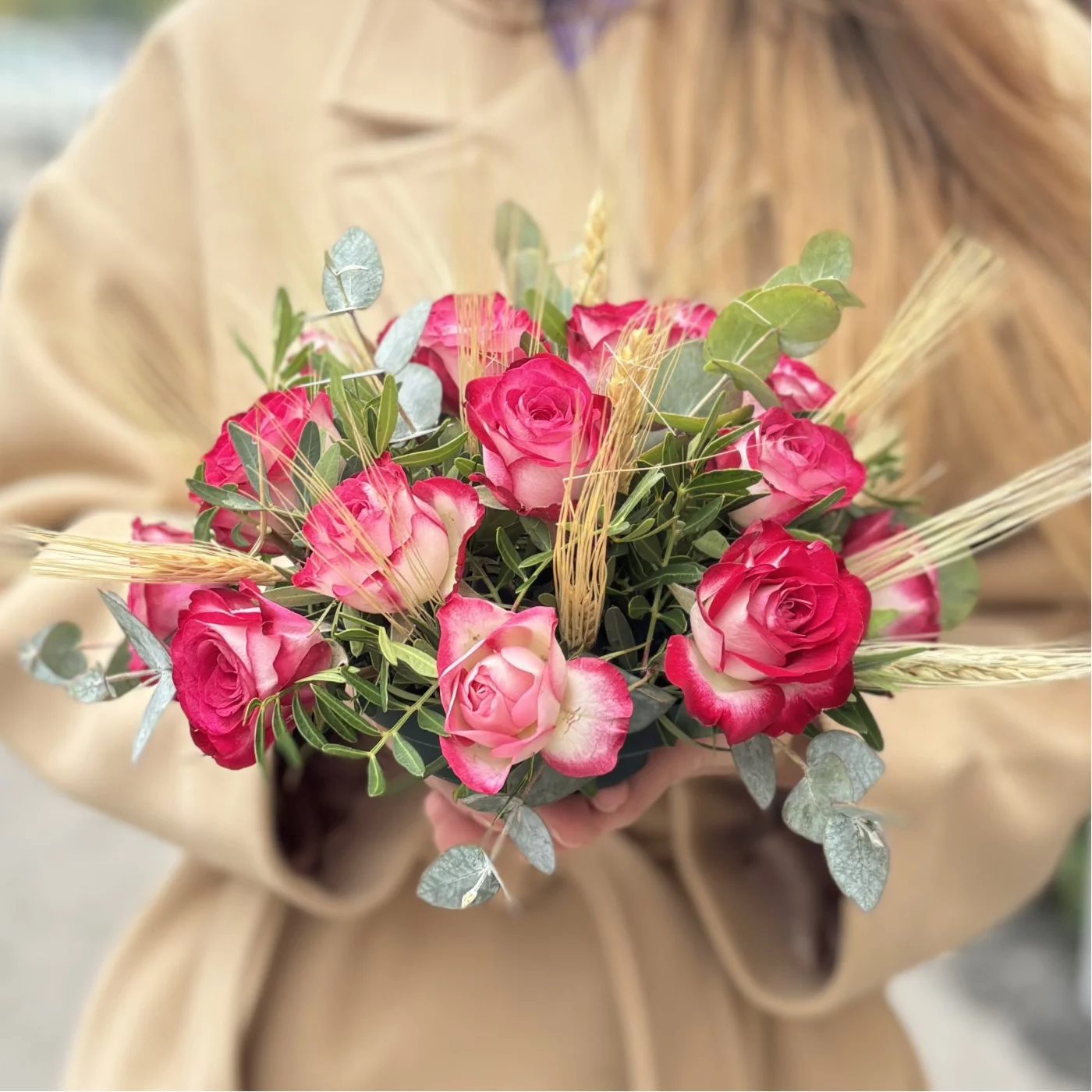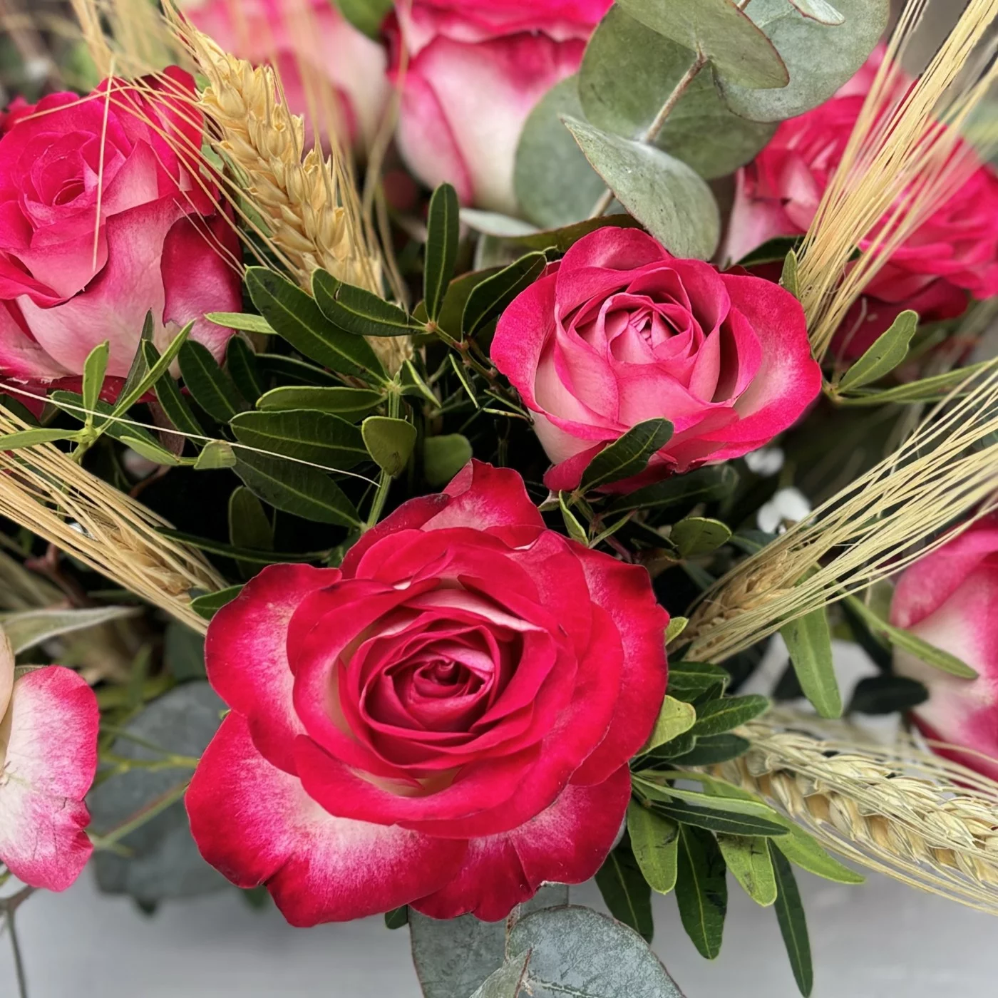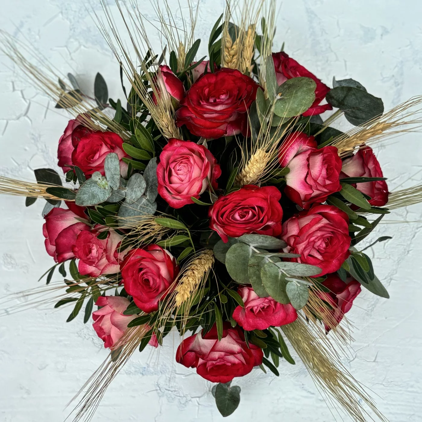Настольная композиция для украшения праздничного стола жениха и невесты, в составе которой присутствуют кустовые розы малинового цвета и сухоцветы. Композиция прекрасно подойдет для оформления свадьбы и других мероприятий.
