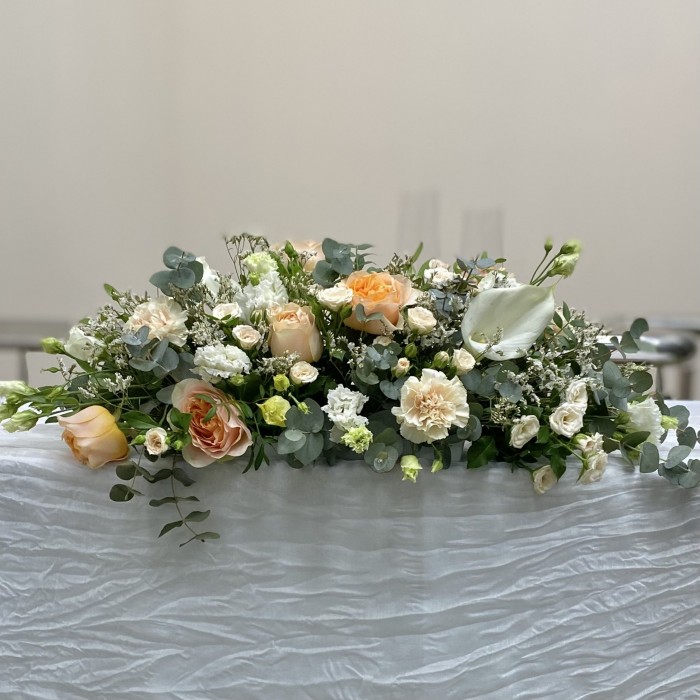 Настольная композиция для украшения праздничного стола жениха и невесты, в составе которой присутствуют нежные кремовые розы, эустомы и зелень. Композиция прекрасно подойдет для оформления свадьбы и других мероприятий.