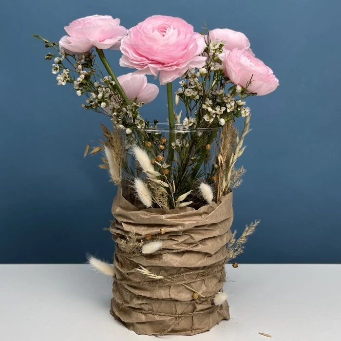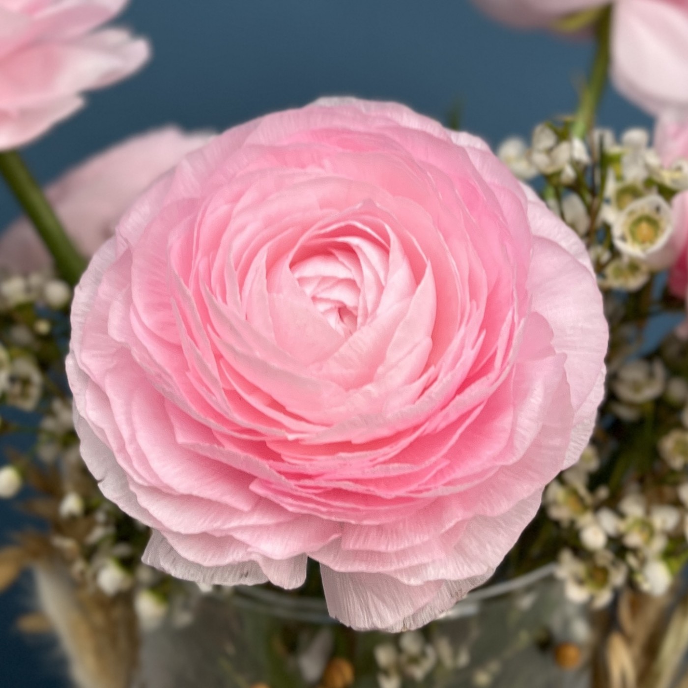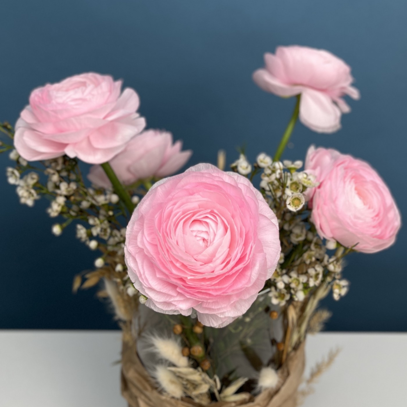 Настольная композиция на ресепшен с розовыми ранункулюсами