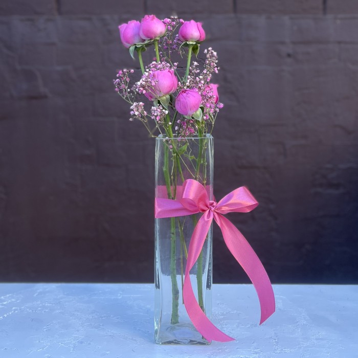 Настольная композиция для украшения праздничного стола жениха и невесты, в составе которой присутствуют малиновые кустовые розы и гипсофила. Композиция прекрасно подойдет для оформления свадьбы и других мероприятий.