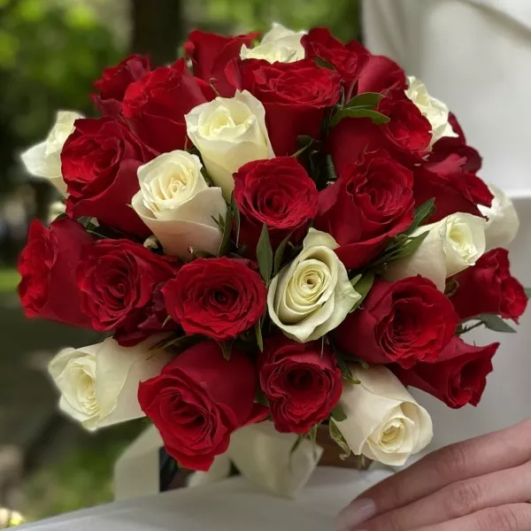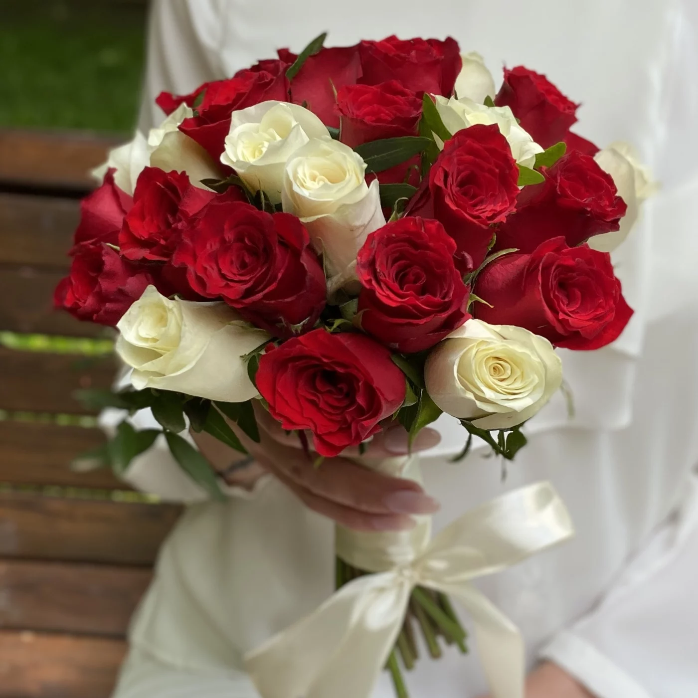 Букет невесты из белых и красных роз выглядит сдержанно и просто. Классическое сочетание этих роз прекрасно смотрятся в свадебном букете.