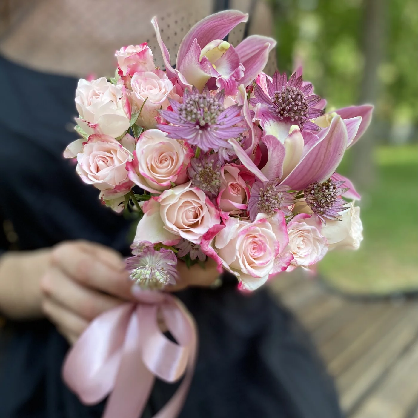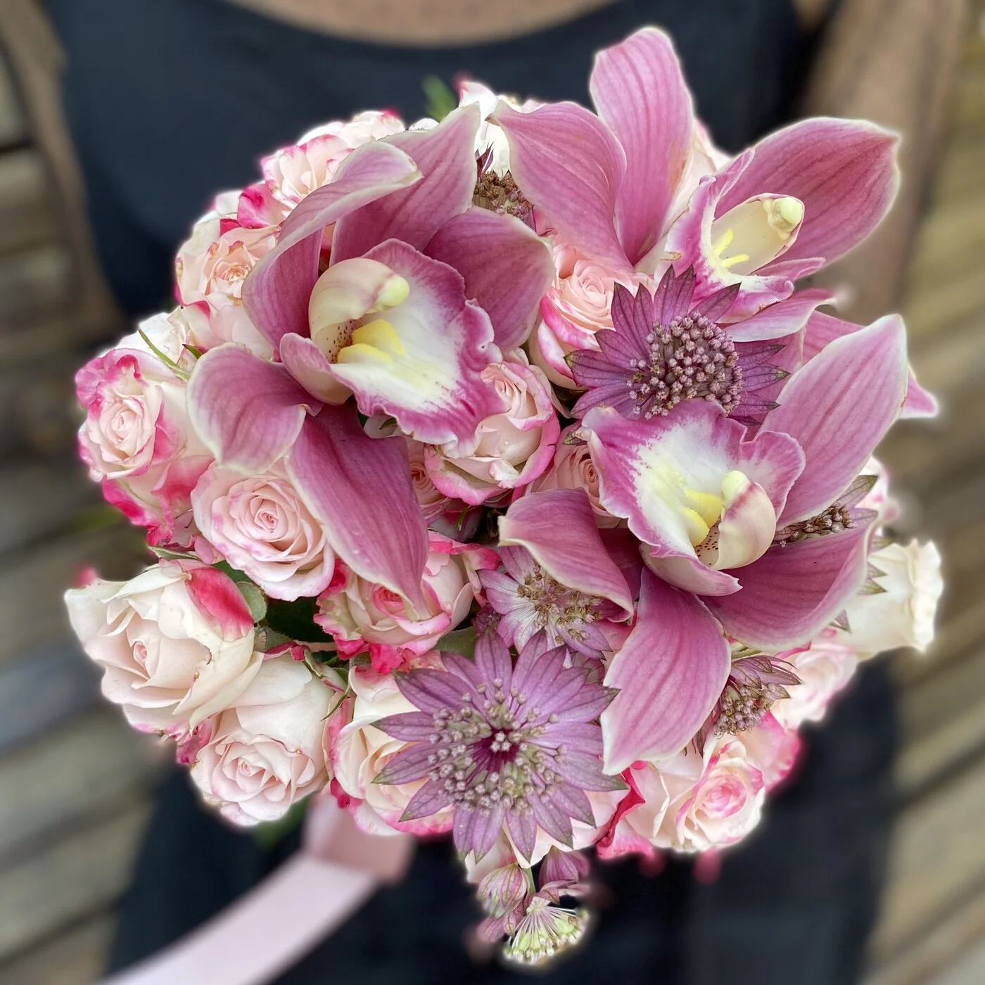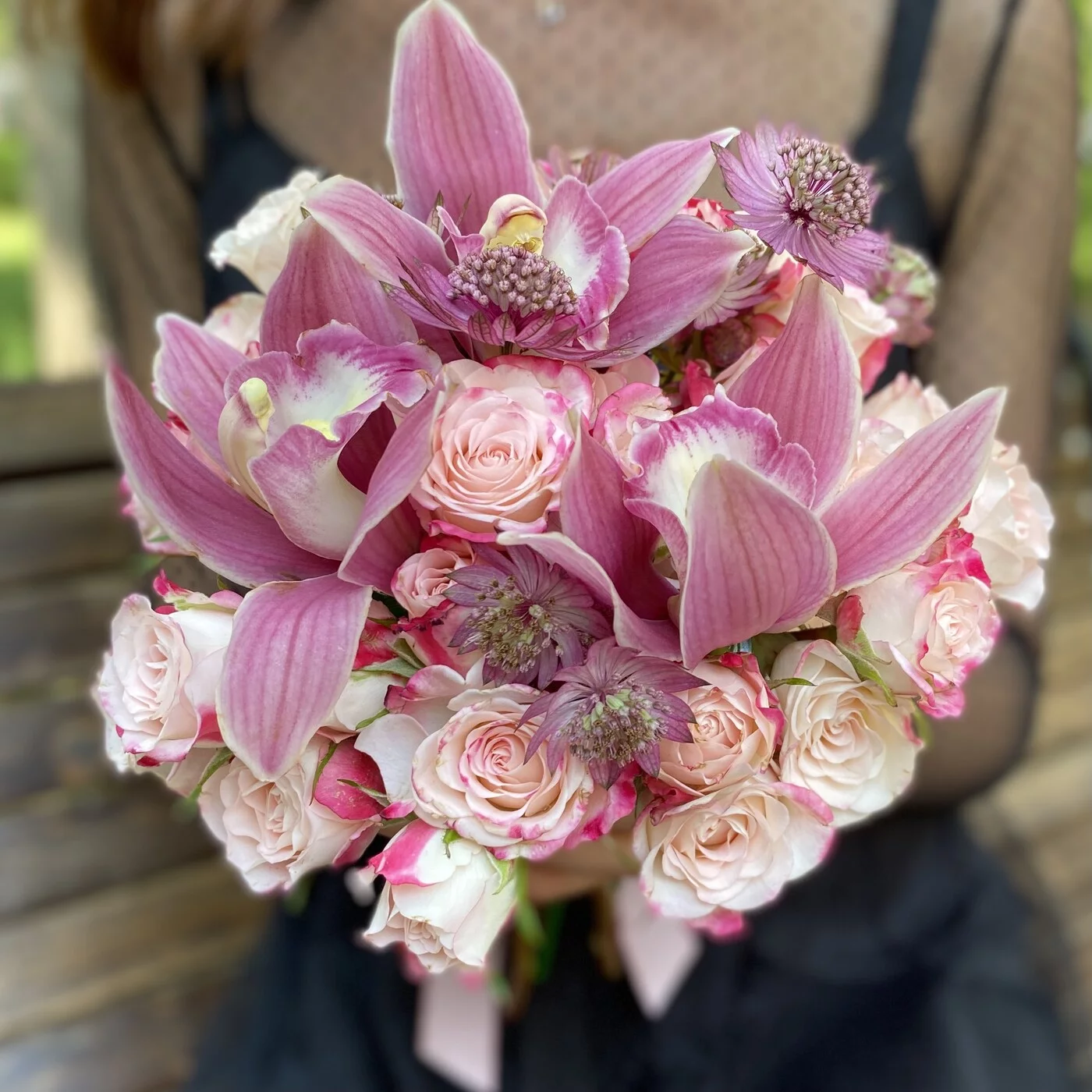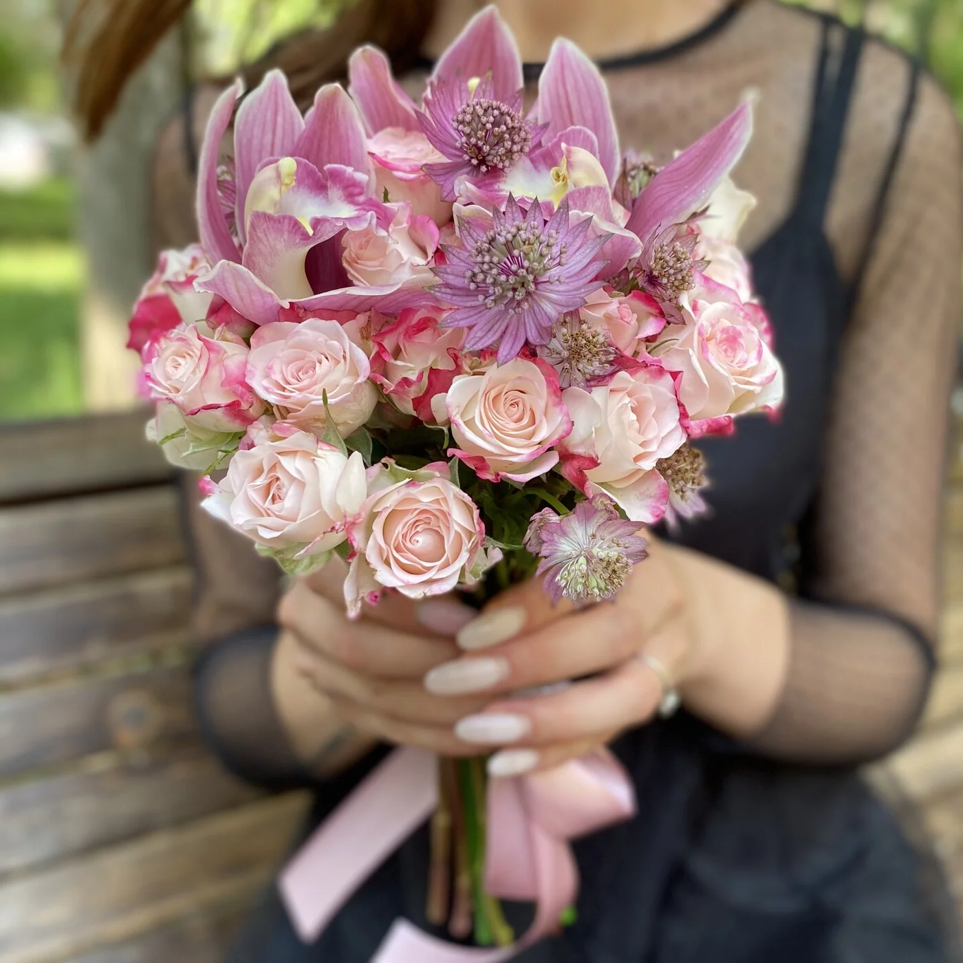 Нежно-розовый букет невесты из кустовых роз и орхидеи. Нежная и воздушная астранция придает этому букету легкость и нежность.