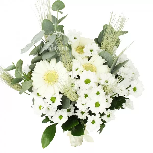 Если девушка хочет удачно выйти замуж, тогда не стоит пренебрегать советами наших предков, выходить замуж с букетом ромашек- символом любви и верности. Наши флористы придумали для Вас интересную историю миниатюрными сантини в форме маленьких ромашек и стильных мини гербер, добавили по русской традиции колоски пшеницы для привлечения богатства, и душистый эвкалипт, что бы отпугнуть не добрые помыслы и злых людей от Вашей семьи.