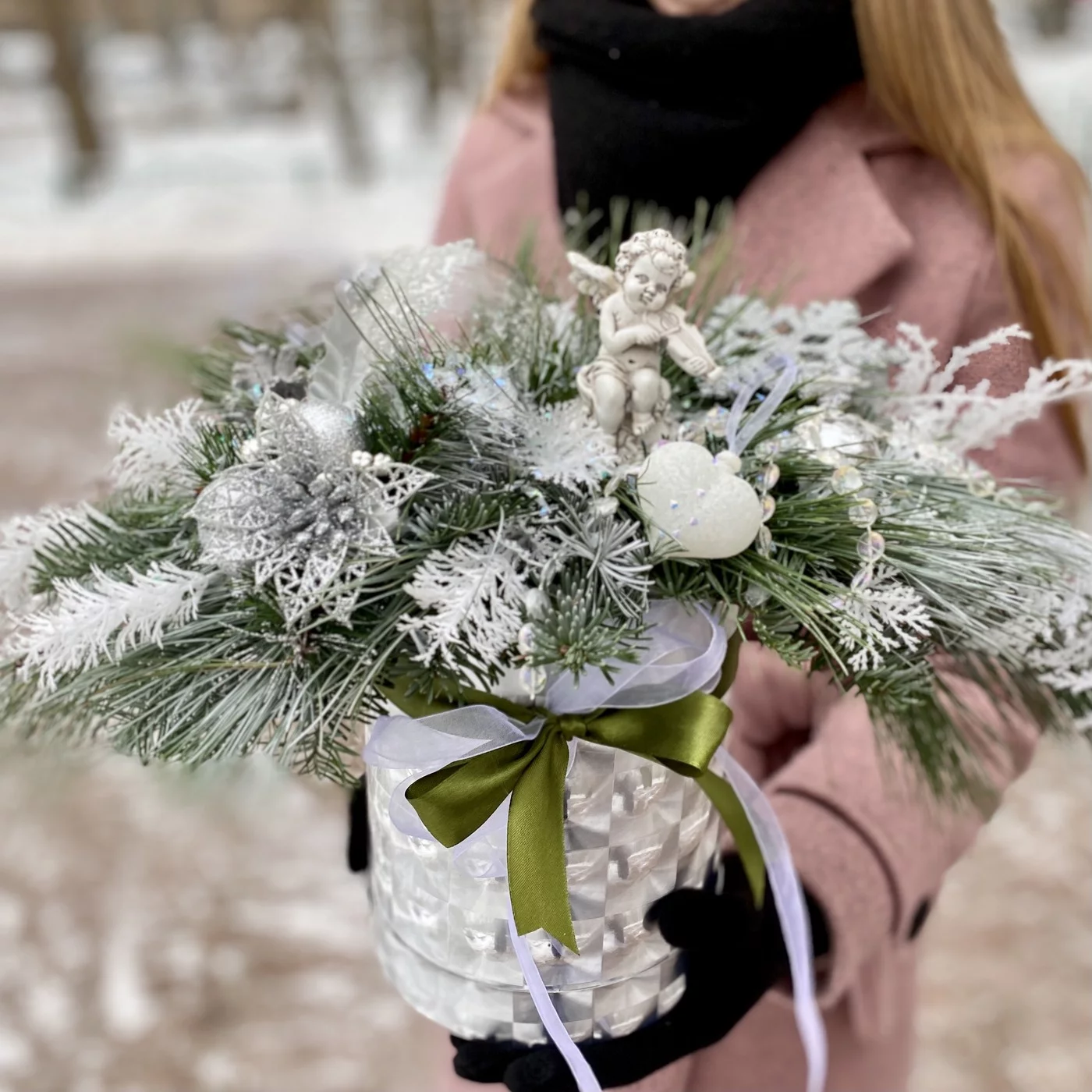 Новогодняя композиция в коробке из натурального нобилиса и веточек сосны. Прекрасный подарок к рождеству или к новому году.