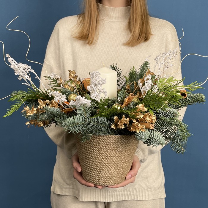 Новогодняя композиция в кашпо Тепло Праздника станет прекрасным элементом декора вашего дома, создавая уют и атмосферу праздника. Она может также стать замечательным подарком для друзей и близких.
