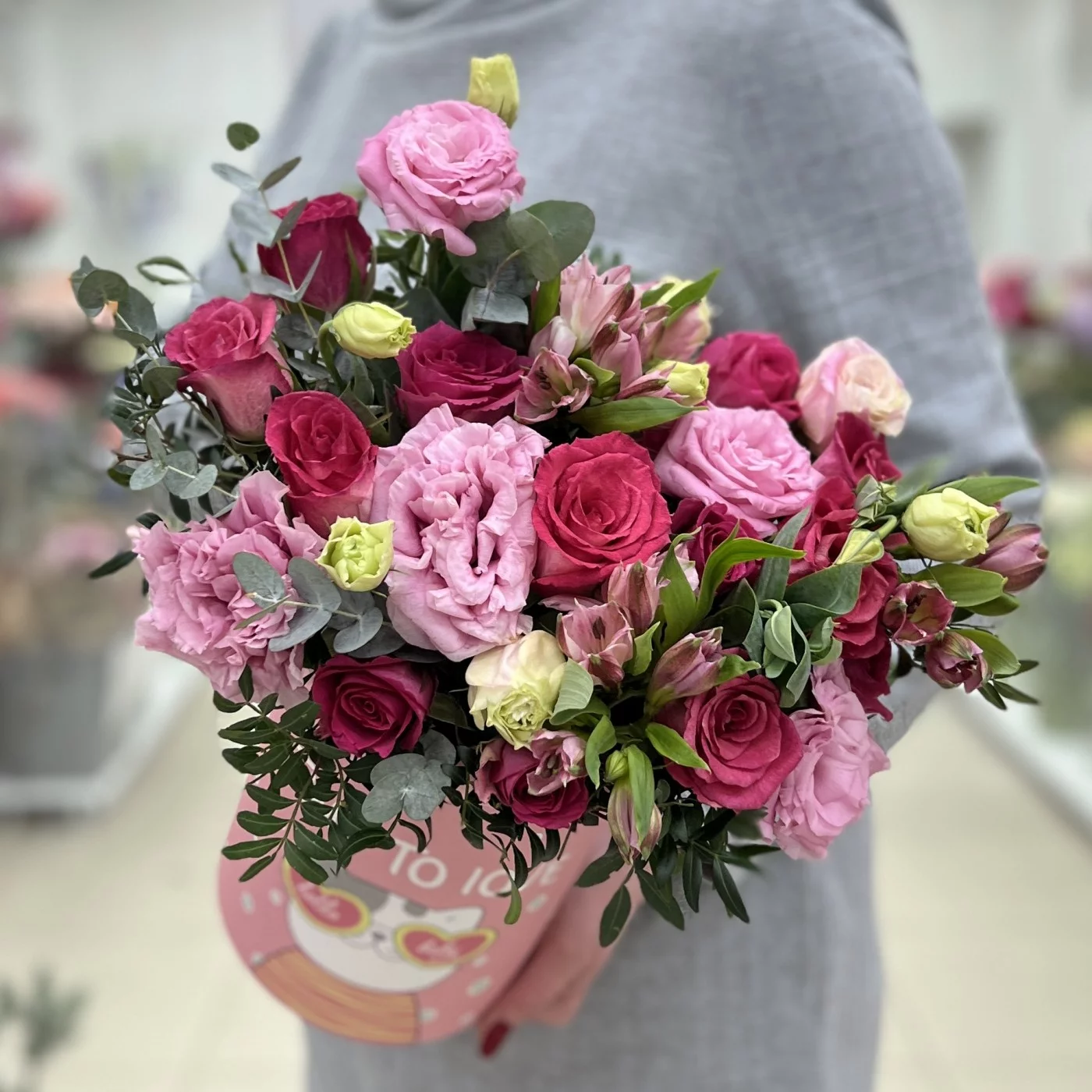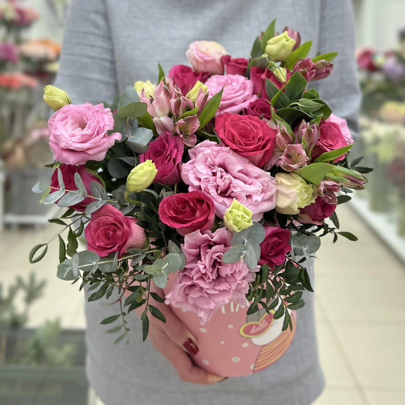Нежная эустома с розами в коробке
