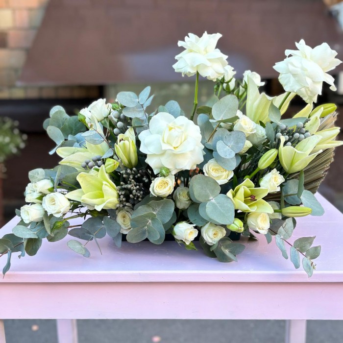 Настольная композиция для украшения праздничного стола жениха и невесты, в составе которой присутствуют розы, лилии и эвкалипт. Композиция прекрасно подойдет для оформления свадьбы и других мероприятий.