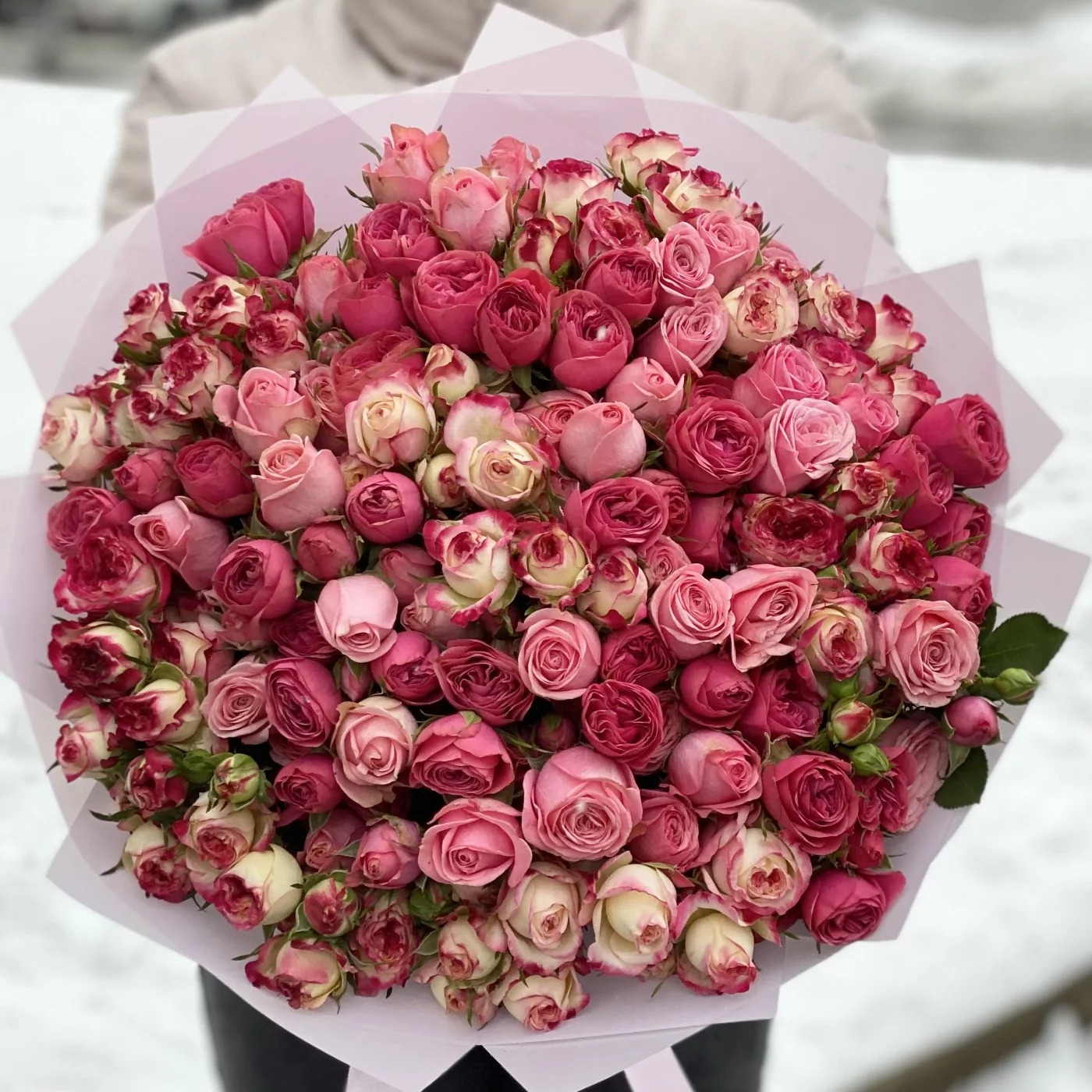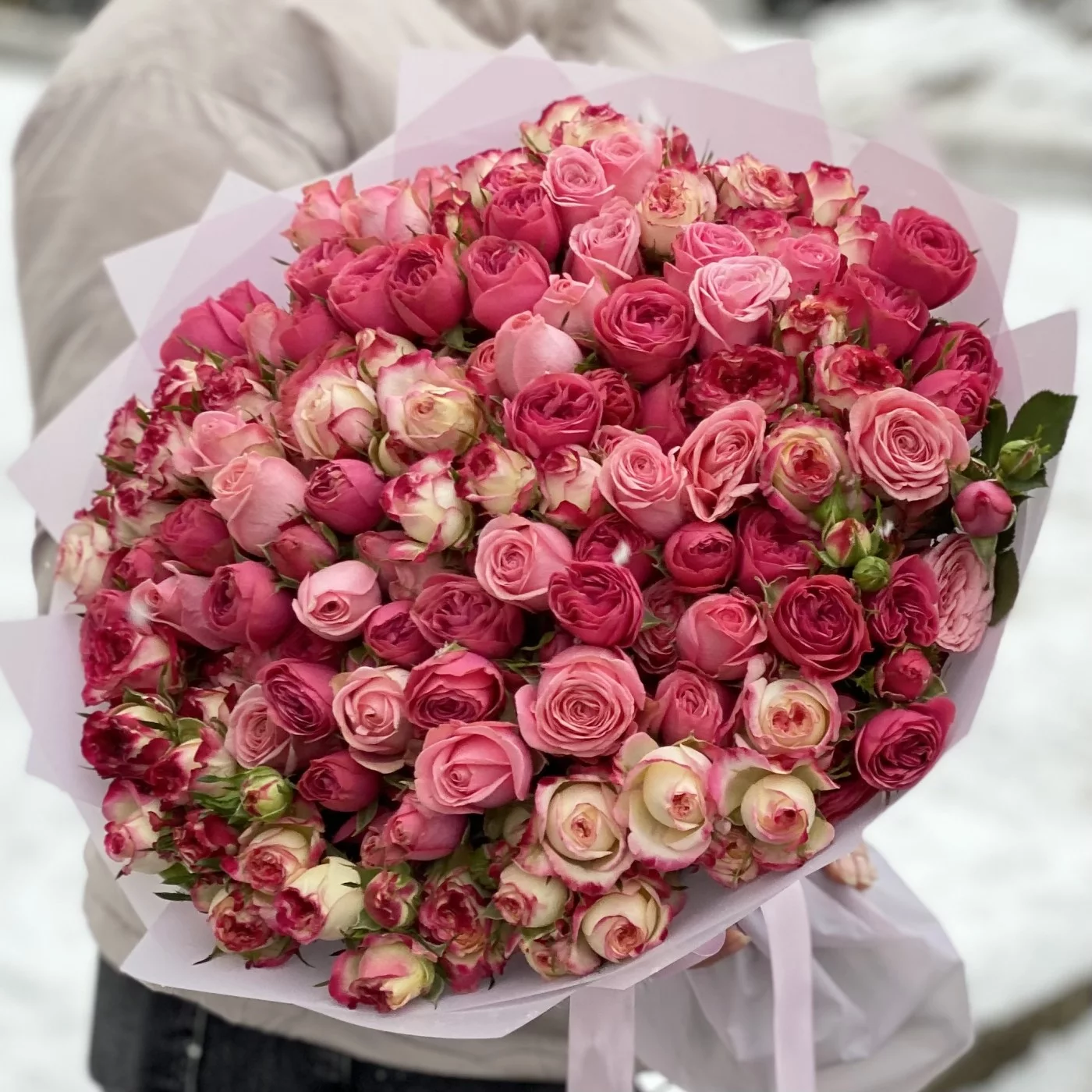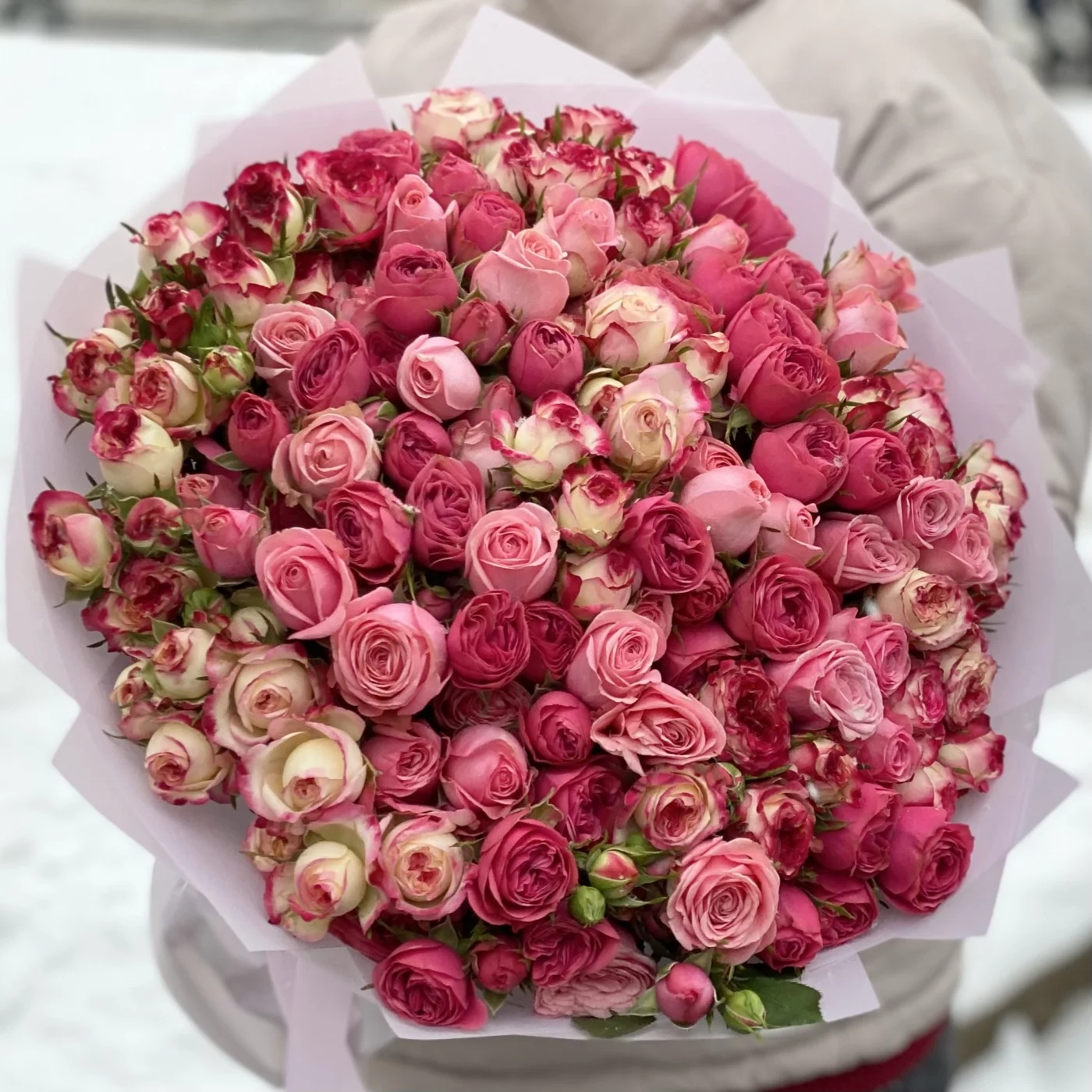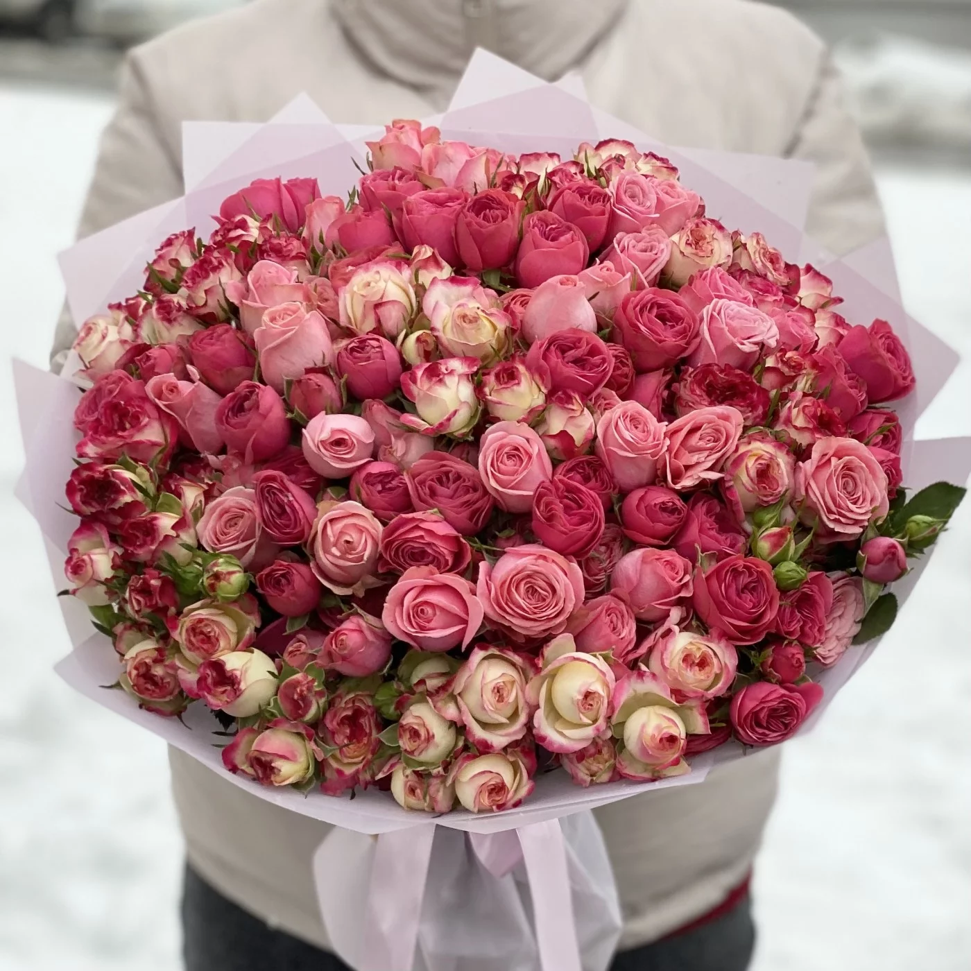 За три месяца мы доставили товар "Нежно-розовый микс из кустовых пионовидных роз" по следующим локациям: