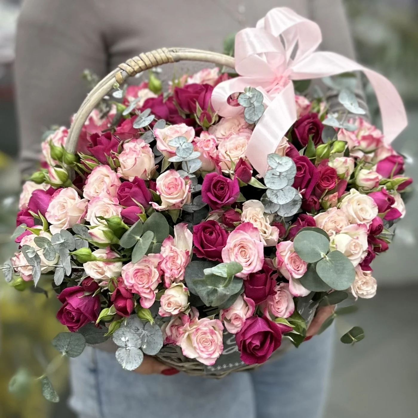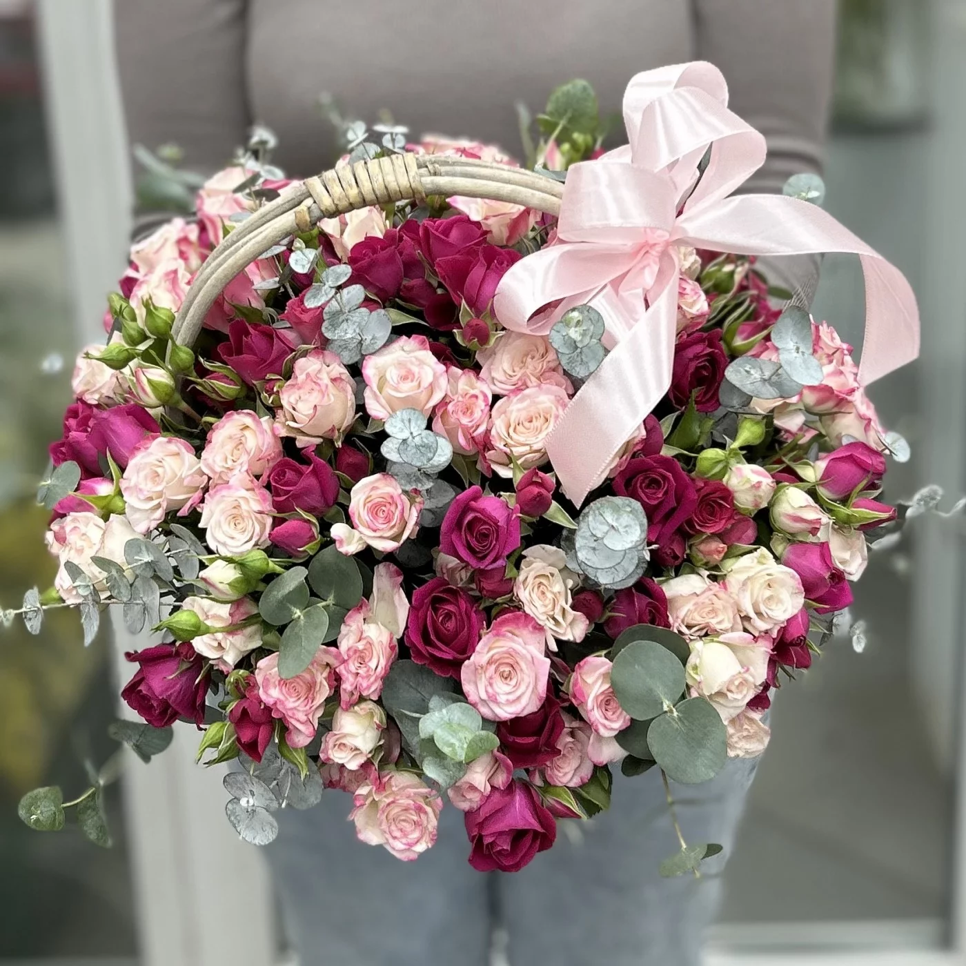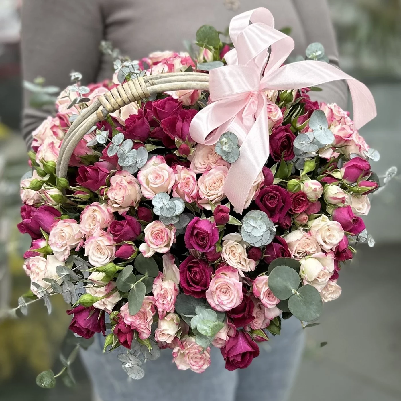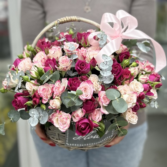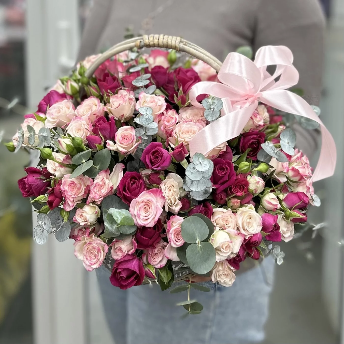 Корзина с нежными кустовыми розами и эвкалиптом — это изысканный и стильный подарок, который прекрасно подойдет для различных случаев. Кустовые розы известны своей компактной формой и множеством мелких бутонов, что делает их особенно привлекательными. Эвкалипт добавляет свежесть и текстуру, а также приятный аромат.