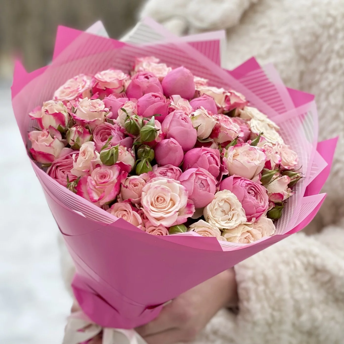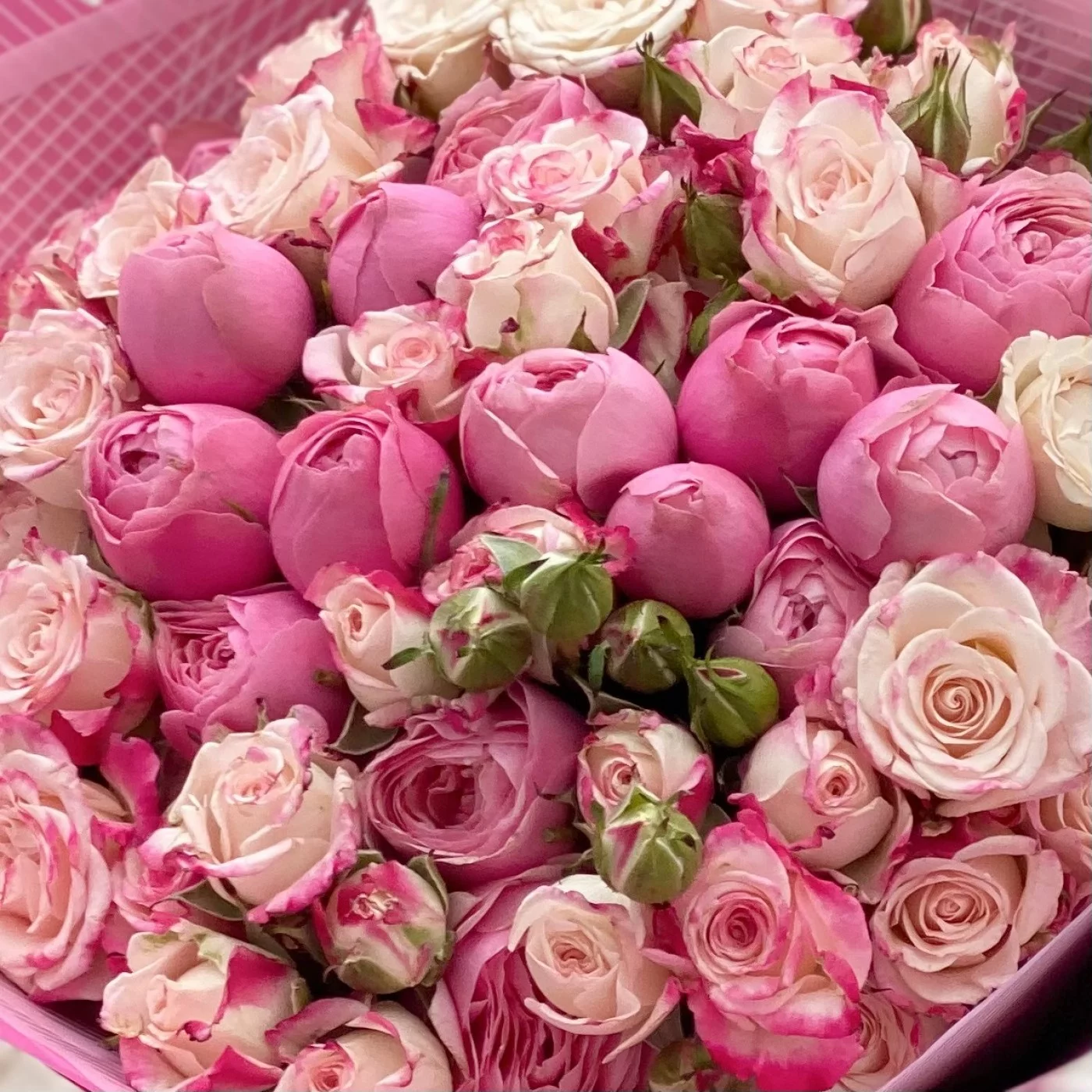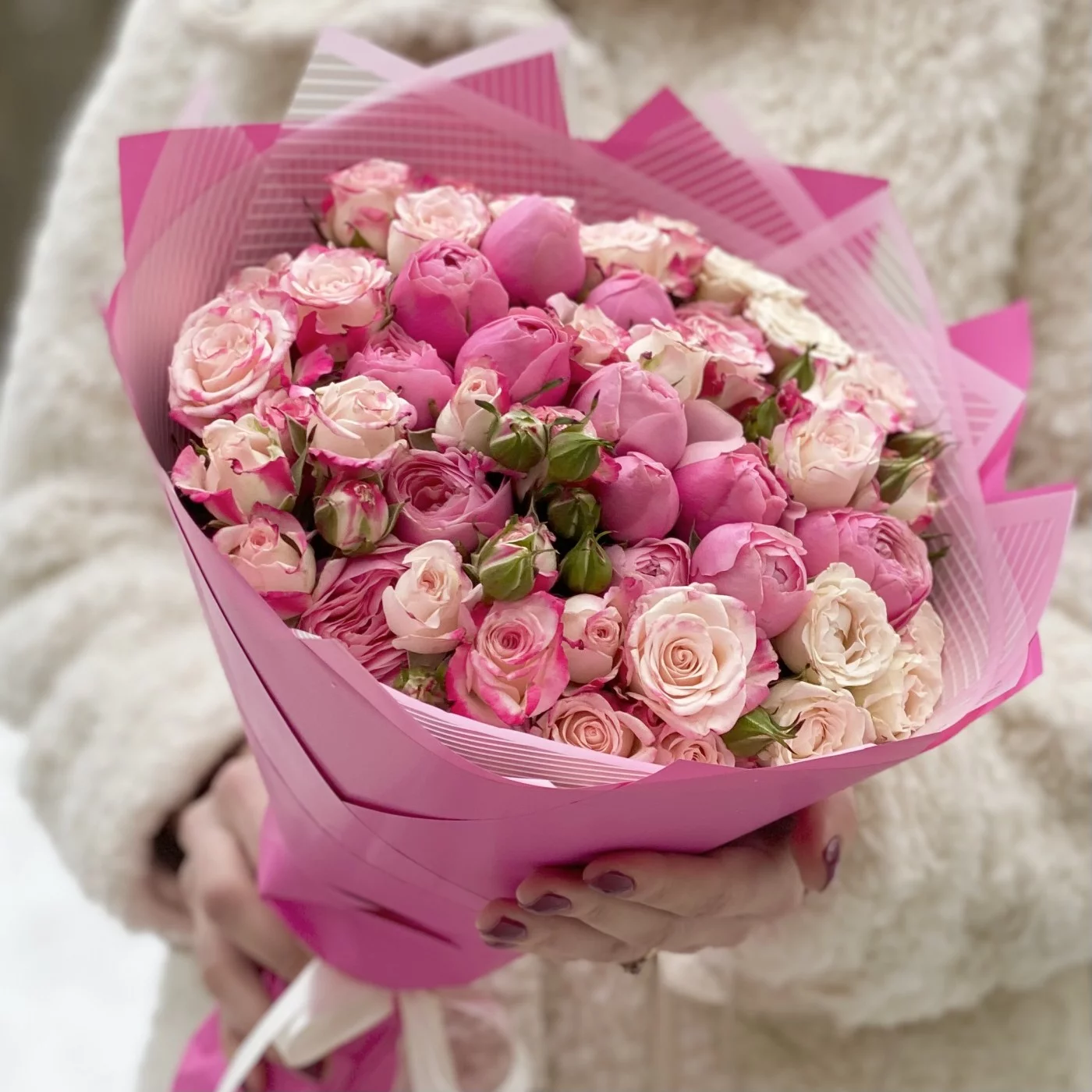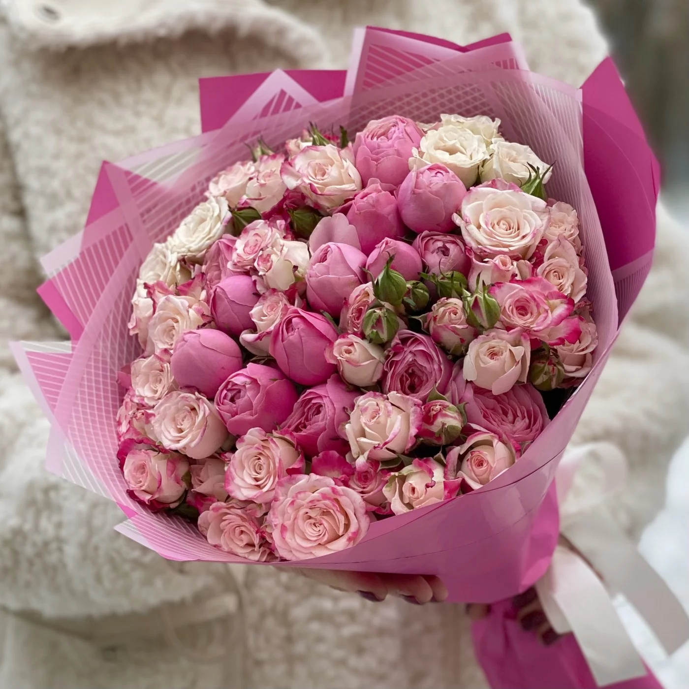 Роскошное соцветие миниатюрных розовых и малиновых бутонов свежесрезанных кустовых роз. Эта композиция словно шепчет: «Я влюблён». Идеальный букет для нежной девушки! Повод здесь не имеет никакого значения. Это может быть и День рождения юной особы, и День святого Валентина, и 8 Марта, и любой другой праздник или обычный день, который так хочется украсить и сделать счастливым. Тонкий аромат каждого цветочка и деликатный окрас всей композиции неизбежно заостряют на себе внимание, настраивая на романтичное настроение и привносят в момент неповторимые эмоции.