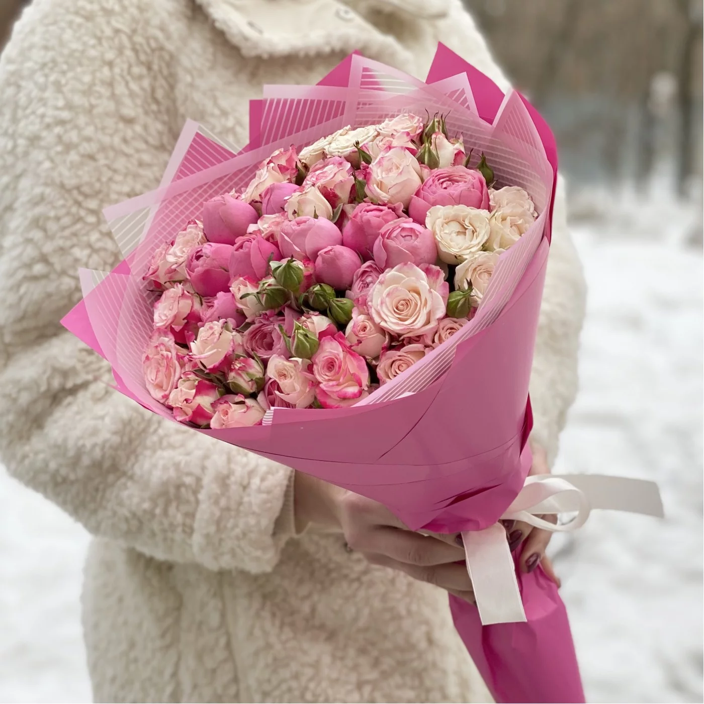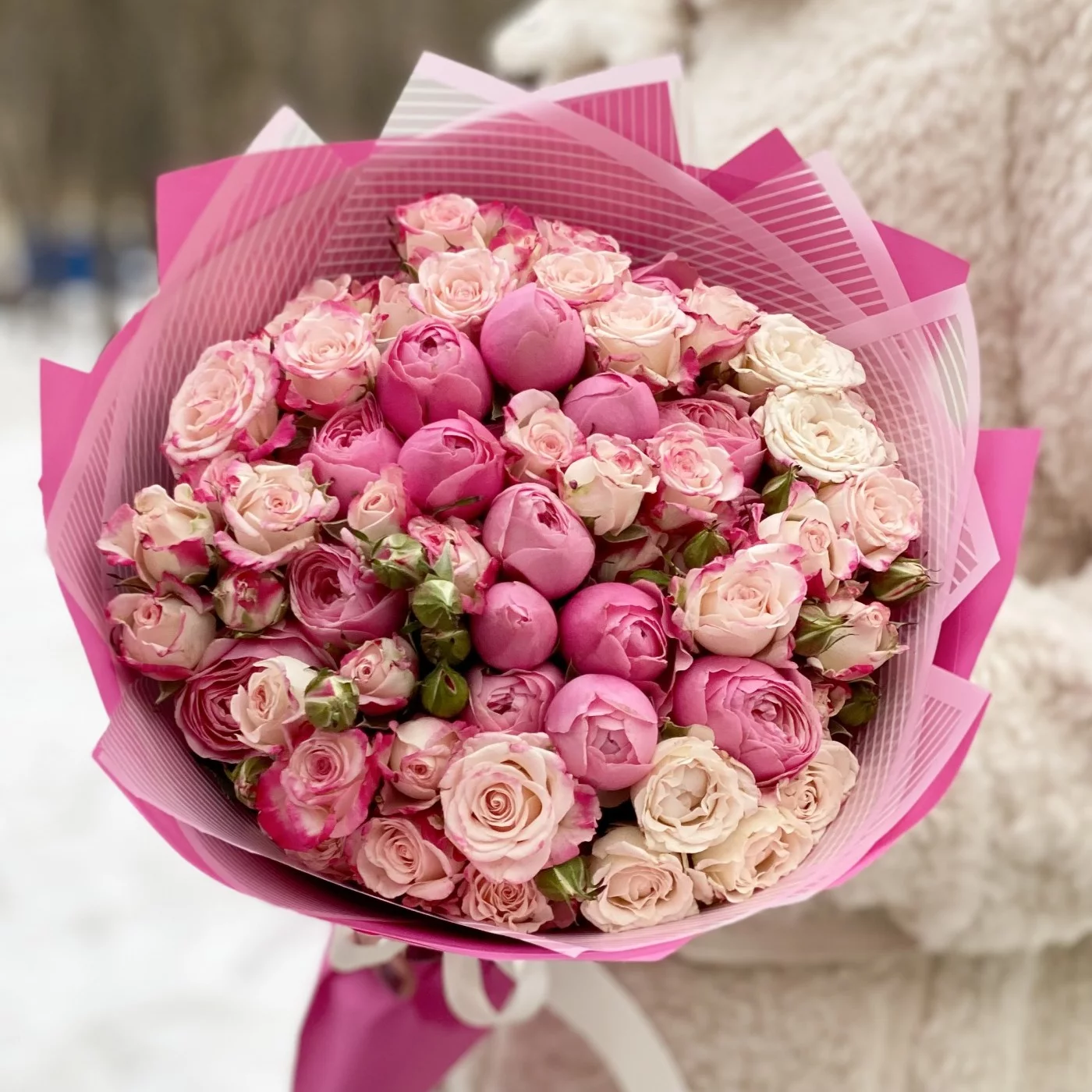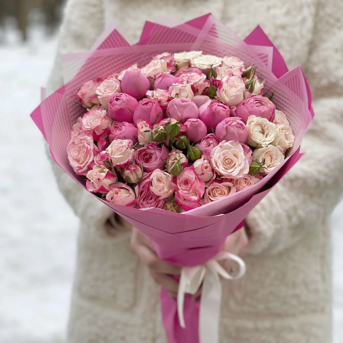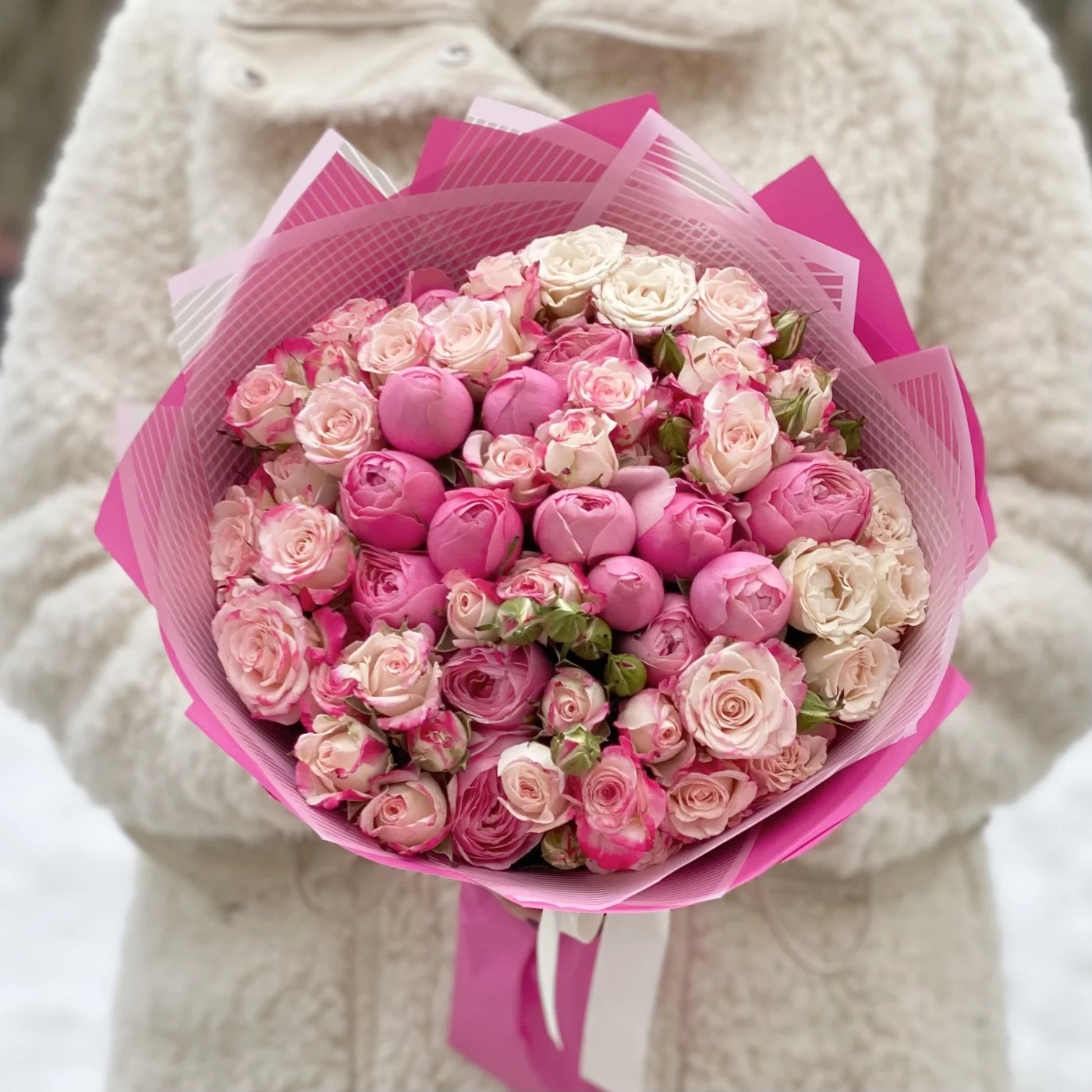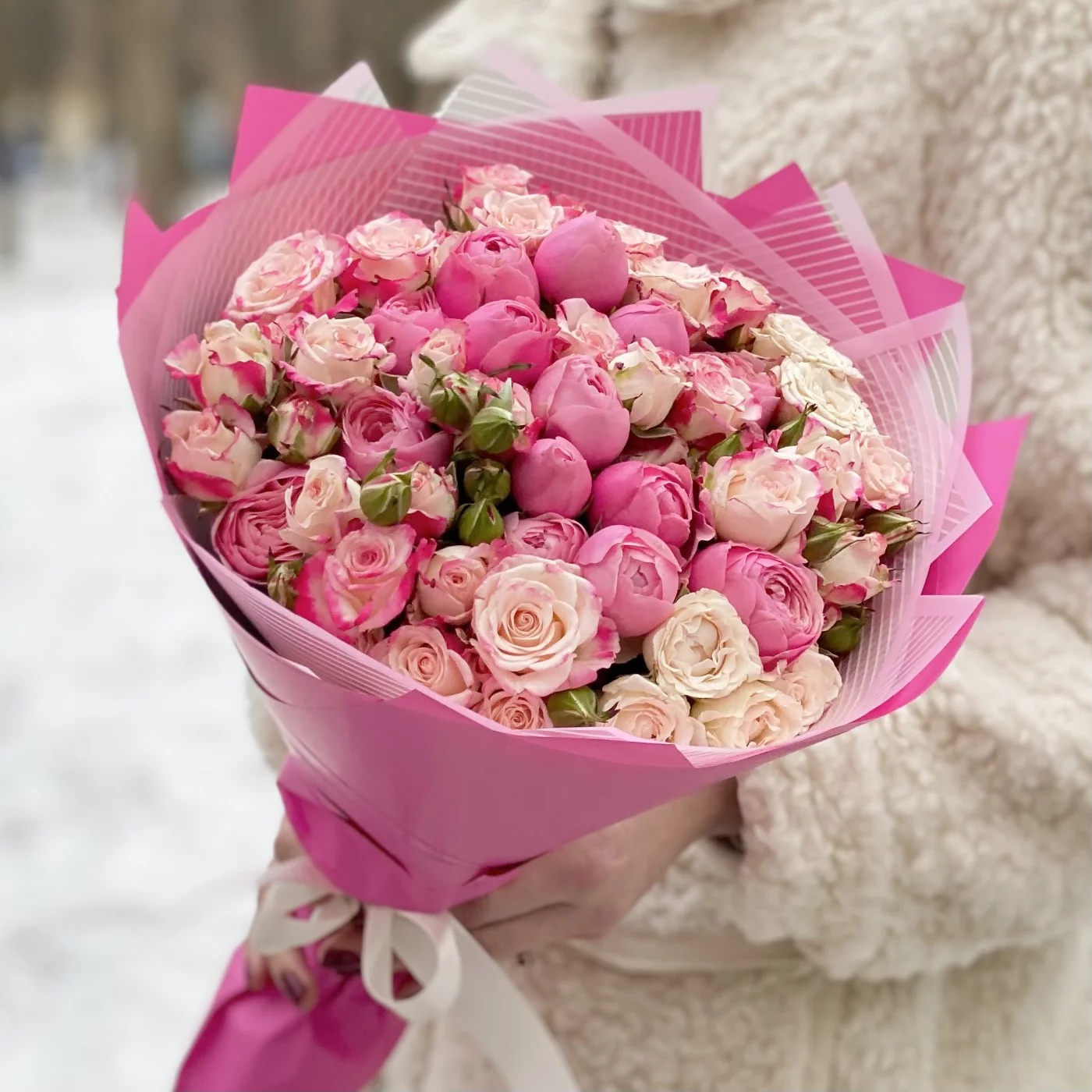 Роскошное соцветие миниатюрных розовых и малиновых бутонов свежесрезанных кустовых роз. Эта композиция словно шепчет: «Я влюблён». Идеальный букет для нежной девушки! Повод здесь не имеет никакого значения. Это может быть и День рождения юной особы, и День святого Валентина, и 8 Марта, и любой другой праздник или обычный день, который так хочется украсить и сделать счастливым. Тонкий аромат каждого цветочка и деликатный окрас всей композиции неизбежно заостряют на себе внимание, настраивая на романтичное настроение и привносят в момент неповторимые эмоции.
