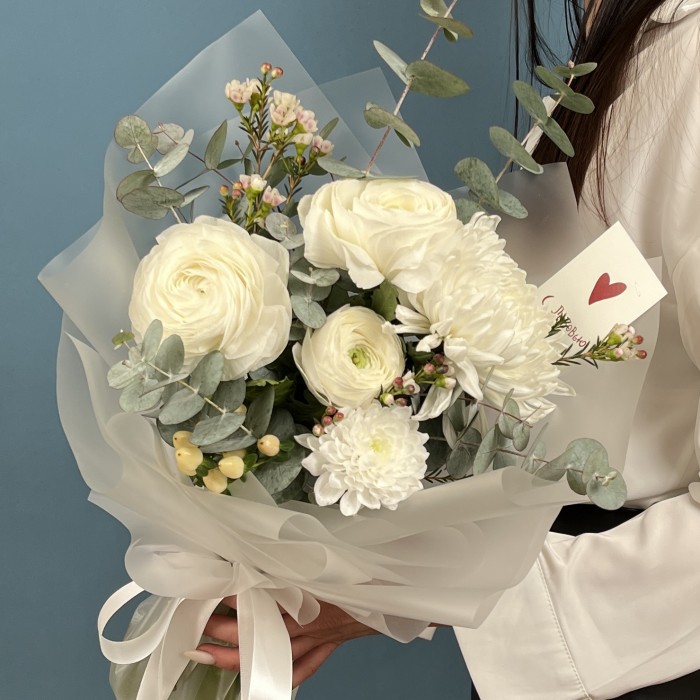 Букет Белый шелк — это изысканная композиция, в которой нежные ранункулюсы и воздушные хризантемы создают атмосферу утонченности и романтики.