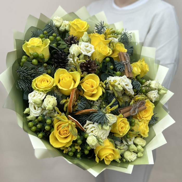 Новогодний букет с желтыми розами — это не только красивое, но и символичное оформление, которое принесет тепло и радость в зимние дни.