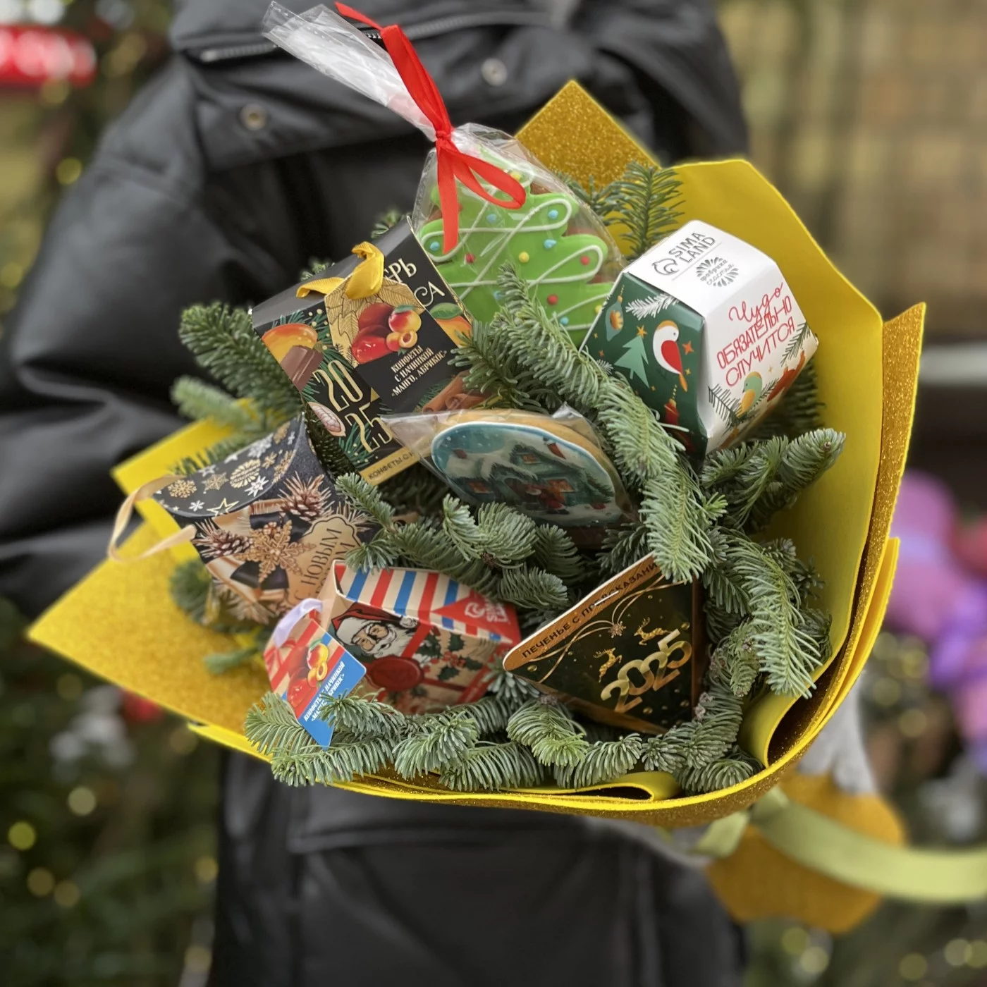 Букет с пушистым нобилисом и декором, станет оригинальным подарком на Новый Год или Рождество.