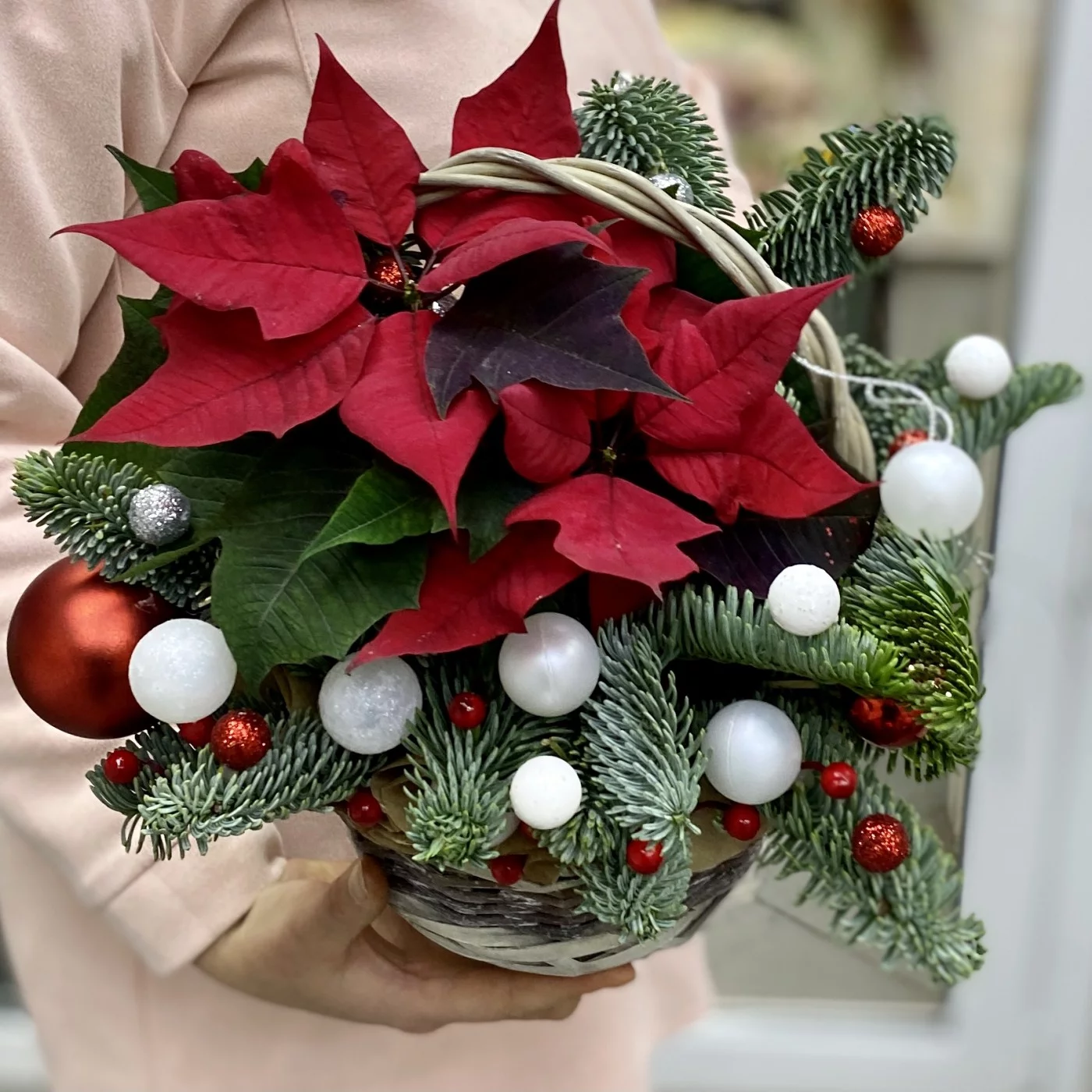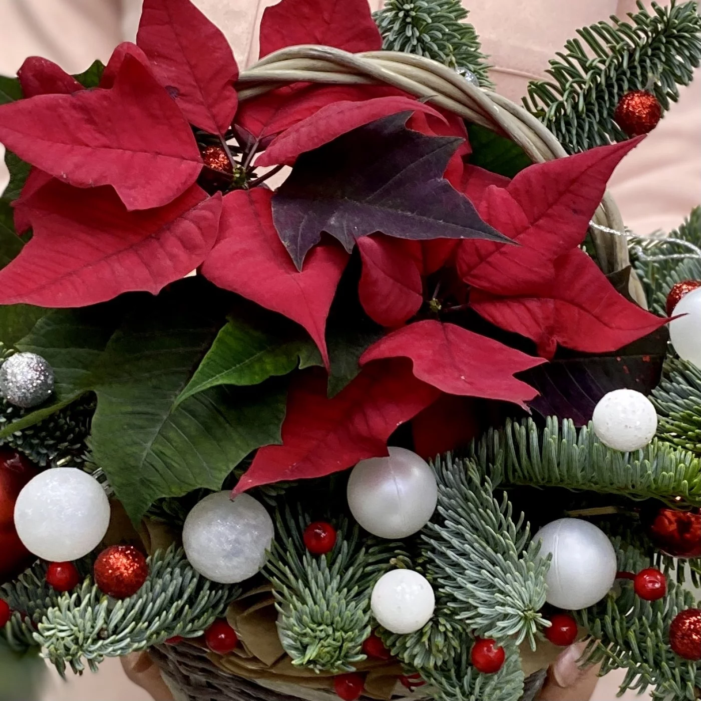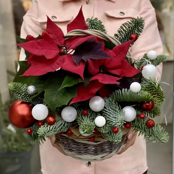 Новогодняя композиция с еловыми ветками, пуансетией и декором в корзине. Прекрасный вариант подарка к новому году если вы собираетесь в гости.