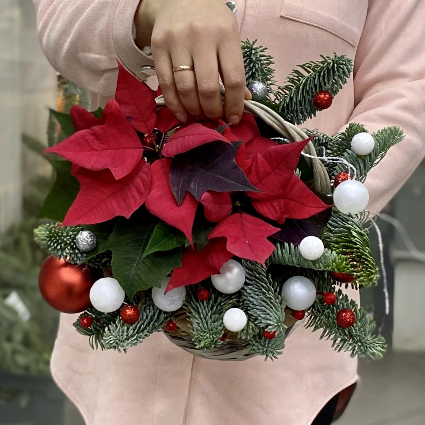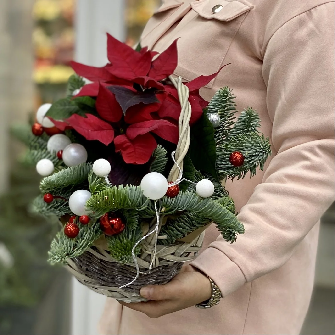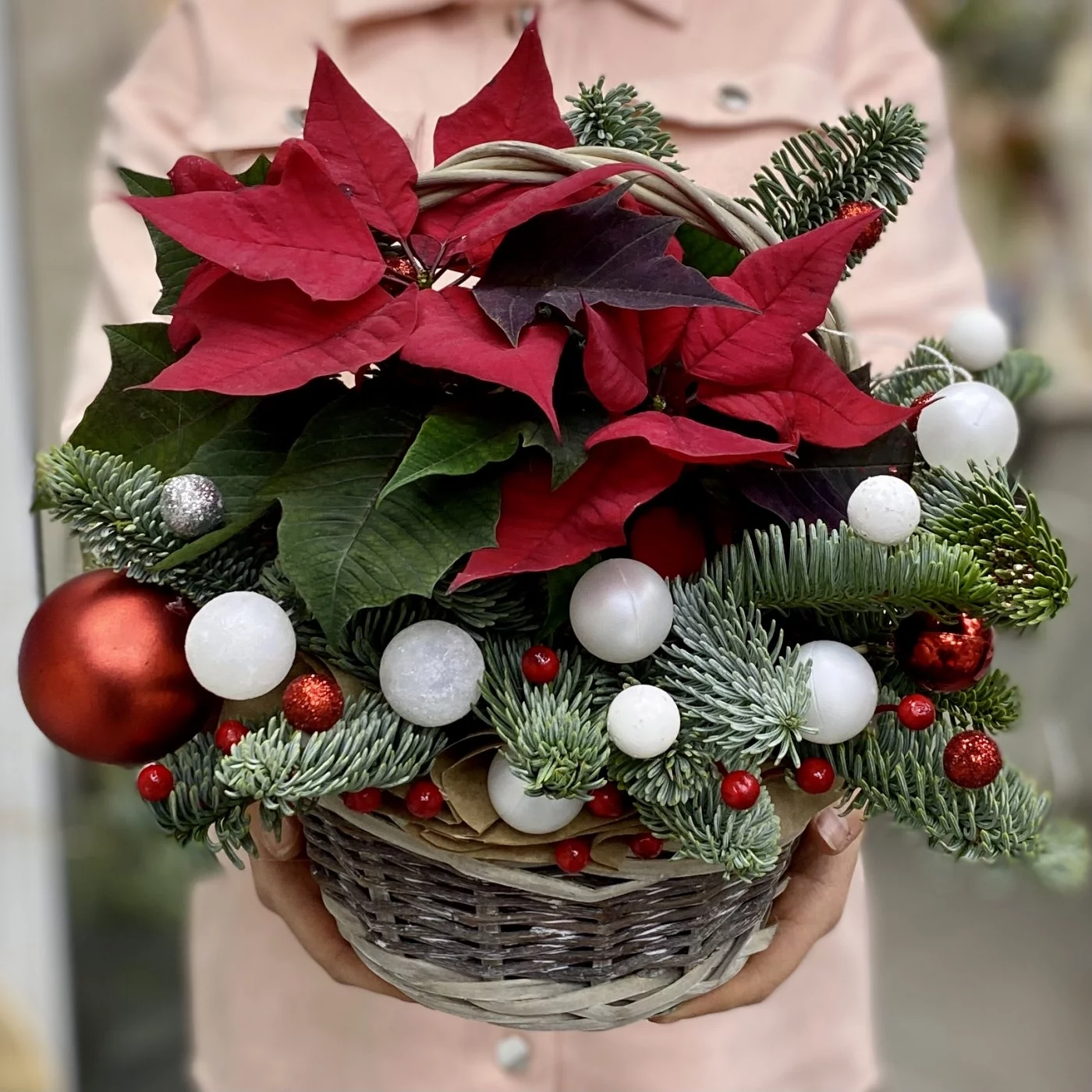 Новогодняя композиция с еловыми ветками, пуансетией и декором в корзине. Прекрасный вариант подарка к новому году если вы собираетесь в гости.