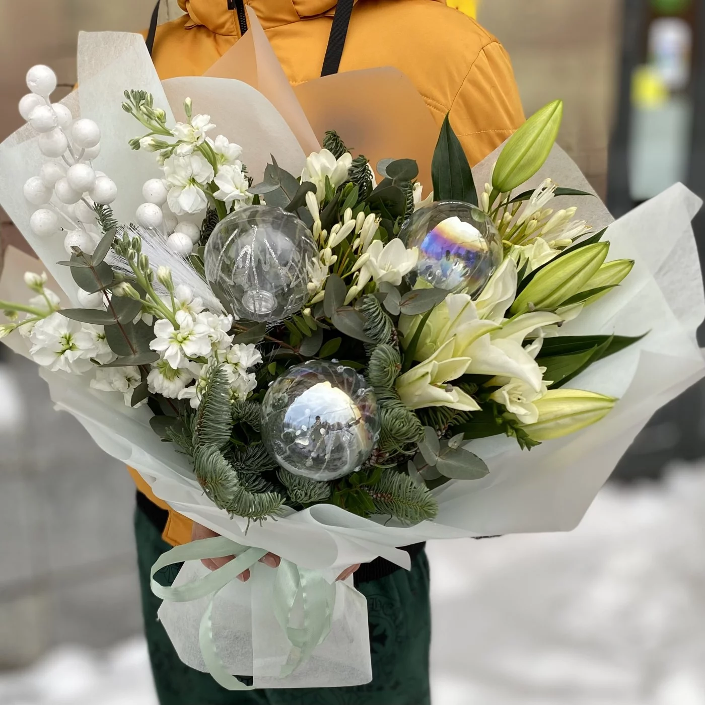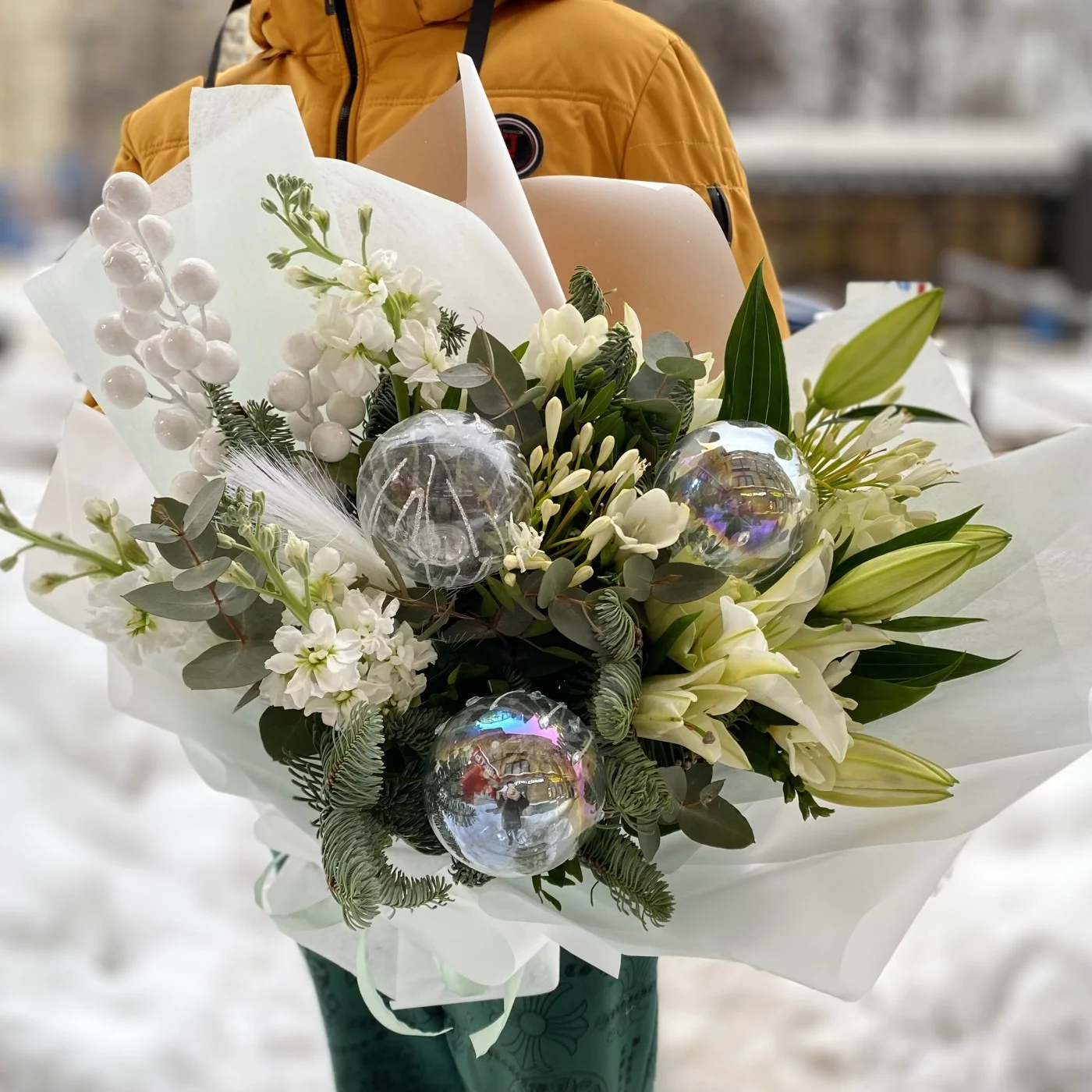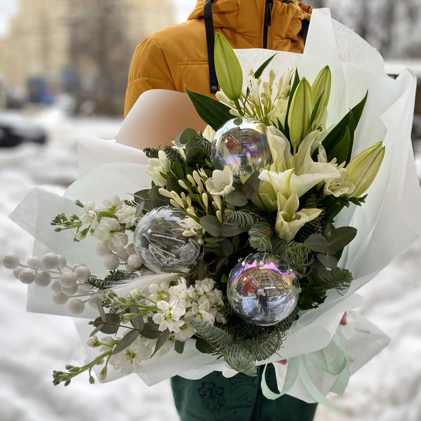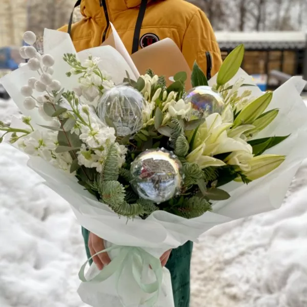 Подарочный букет на Новый год "Морозное утро". Стильный букет с натуральным нобилисом, ароматными лилиями и маттиолой подарит хорошее настроение своей получательнице.