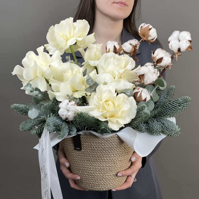Новогодняя композиция в кашпо с белой розой