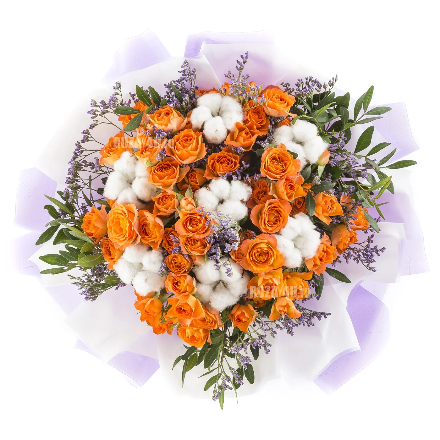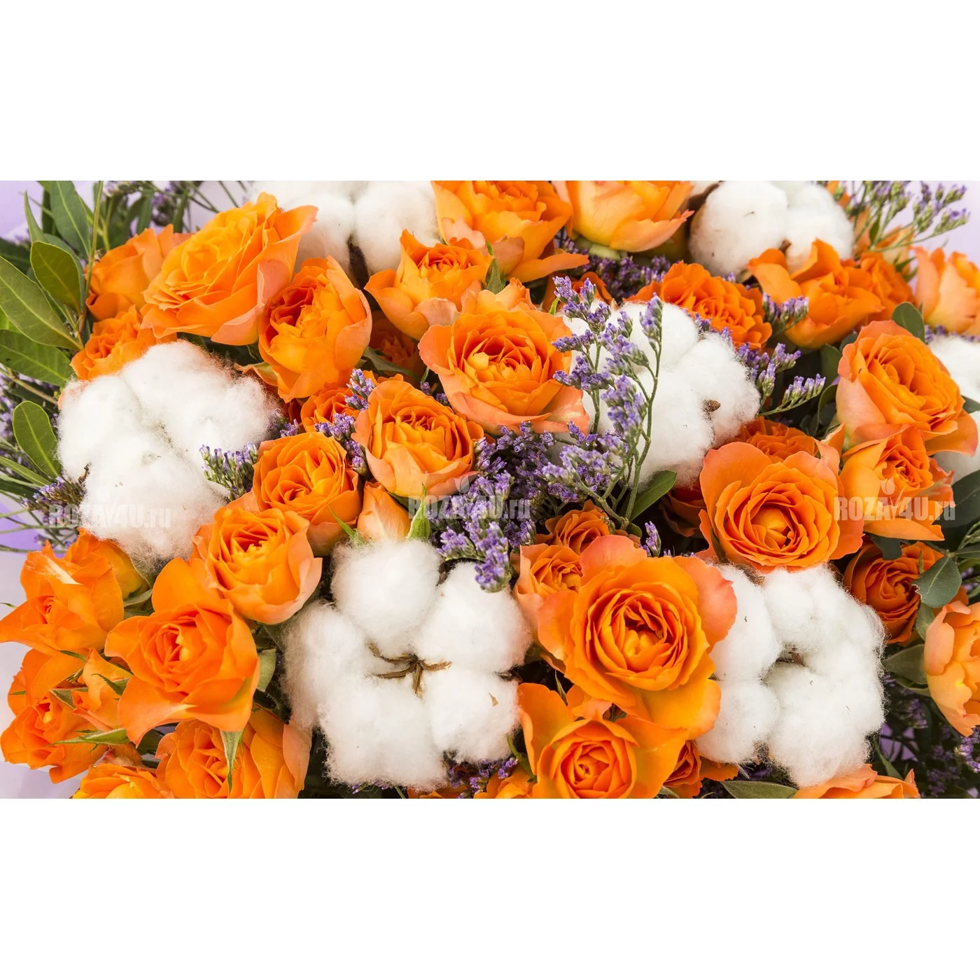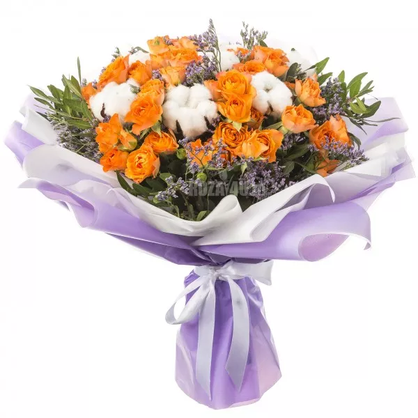 Нежнейший авторский букет с хлопком создан для особенных моментов Вашей жизни. Оранжевые розы в сочетании с белоснежным хлопком и ароматным лимониумом создают атмосферу радости и оптимизма.
