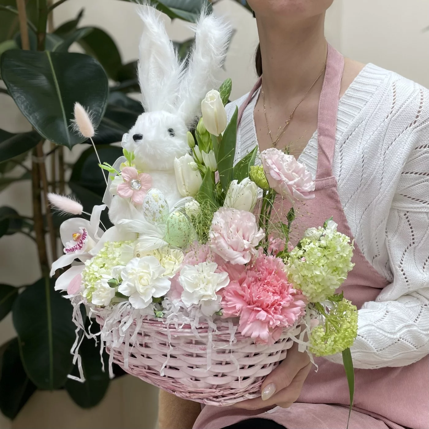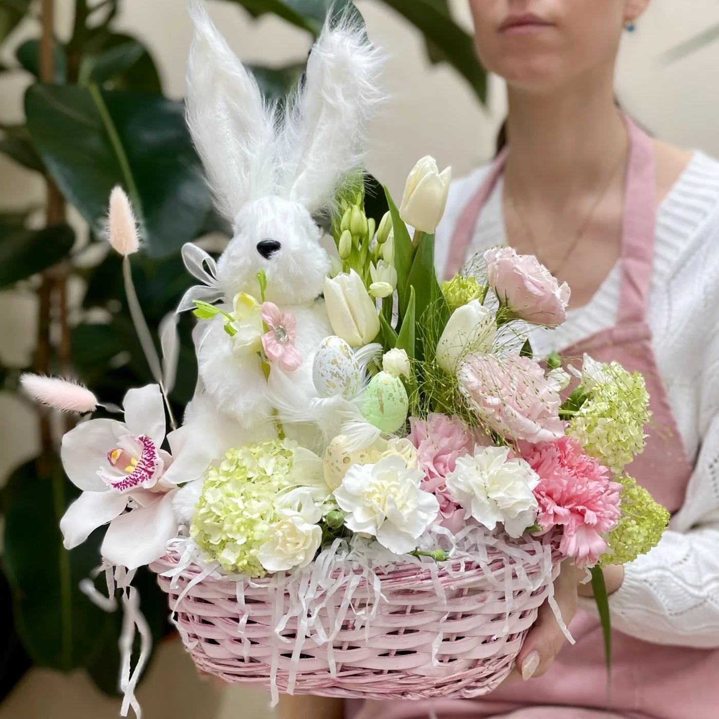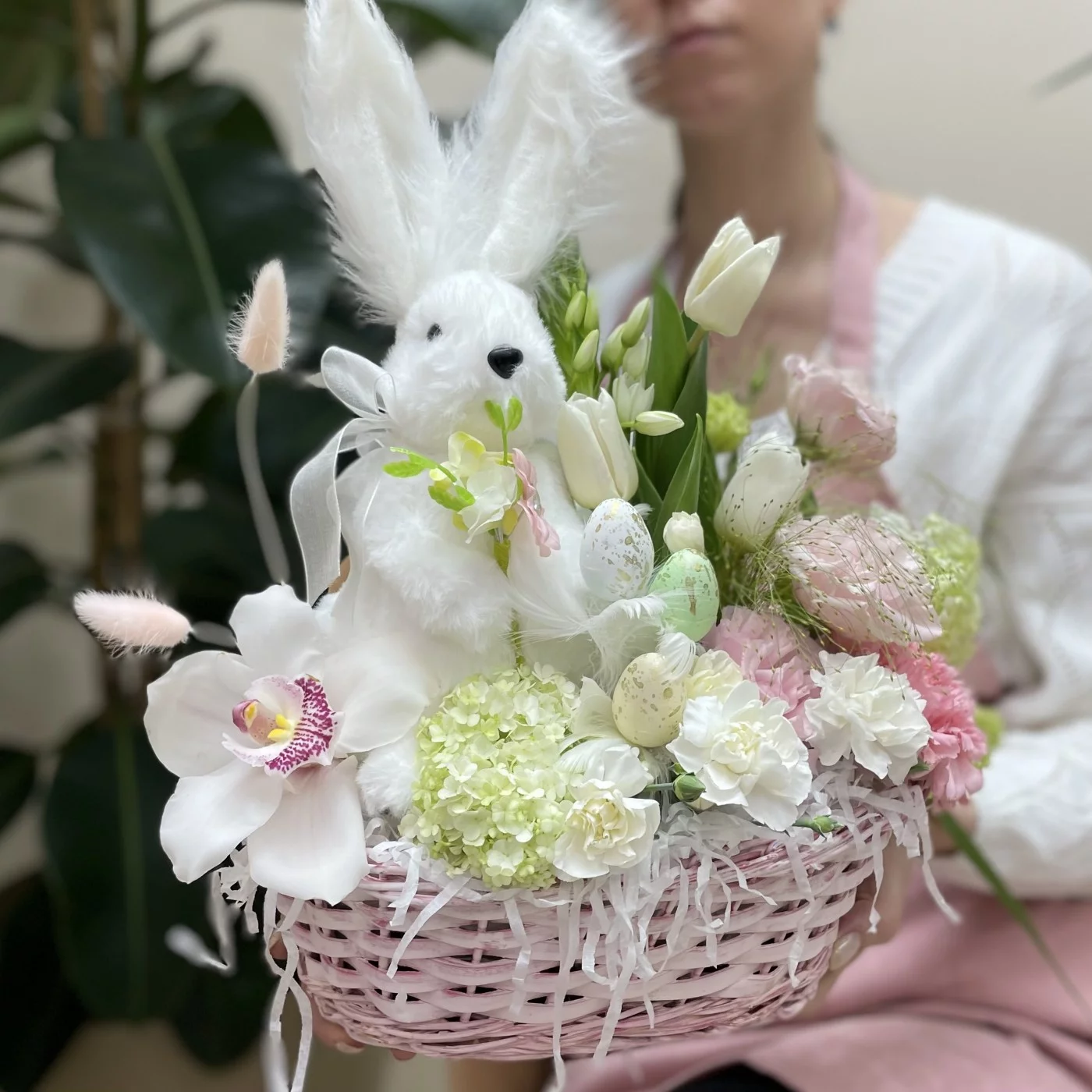 Нежная весенняя композиция на пасхальную тематику. Махровая эустома с белыми тюльпанами и соцветием орхидеи украсит праздничный стол, задаст настроение и просто сделает праздник немного красивее и светлее.