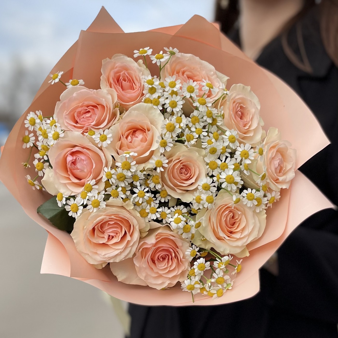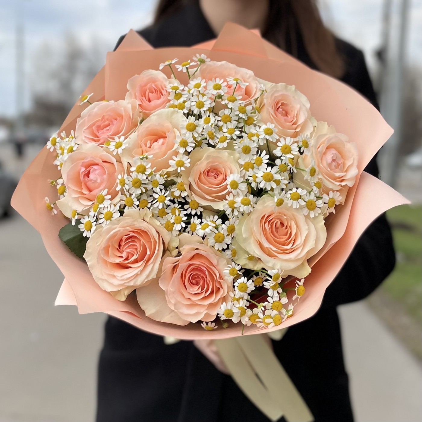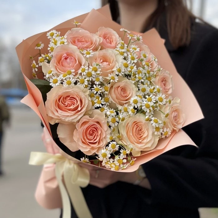Этот букет представляет собой нежнейшую композицию из девяти пионовидных роз кремово-розового оттенка, дополненных веточками танацетума — милыми ромашками небольшого размера.