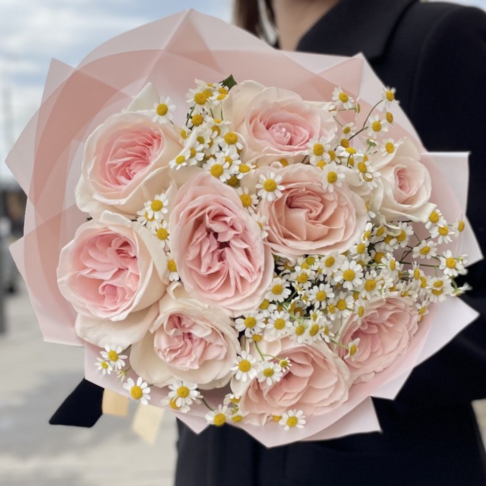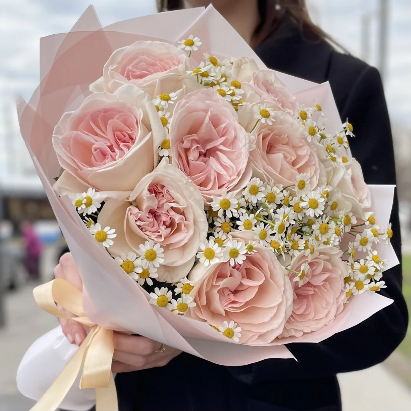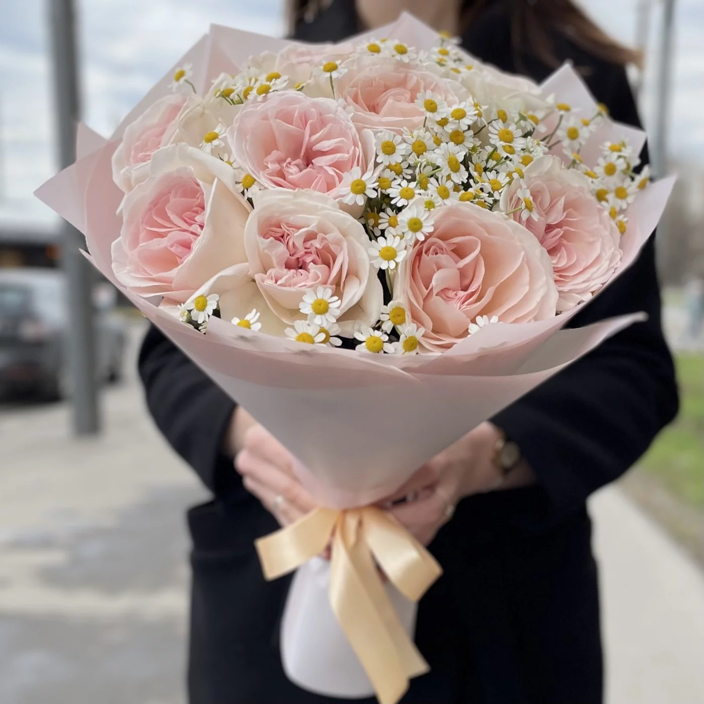 Букет из нежных и ароматных роз сорта Принц Жардиньер с ромашками. Ромашки добавляют этому букету легкости и нежности. Преподнесите красивый букет своим родным и близким.