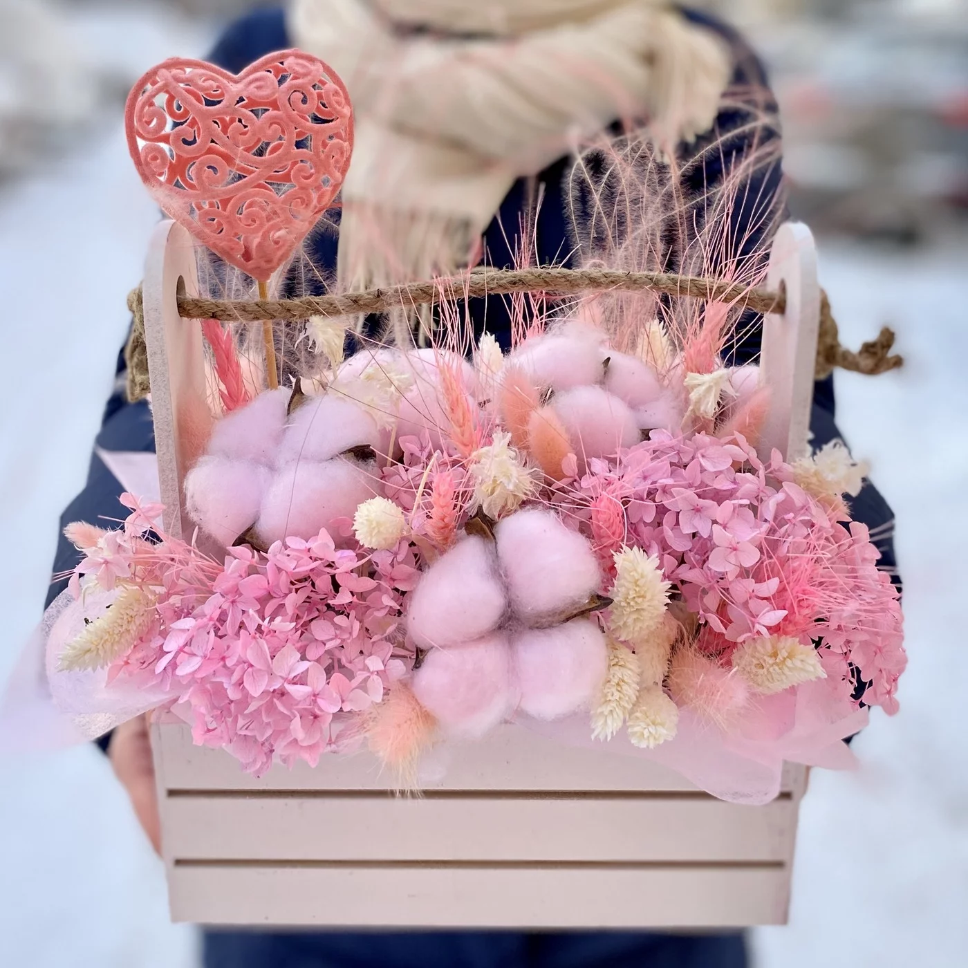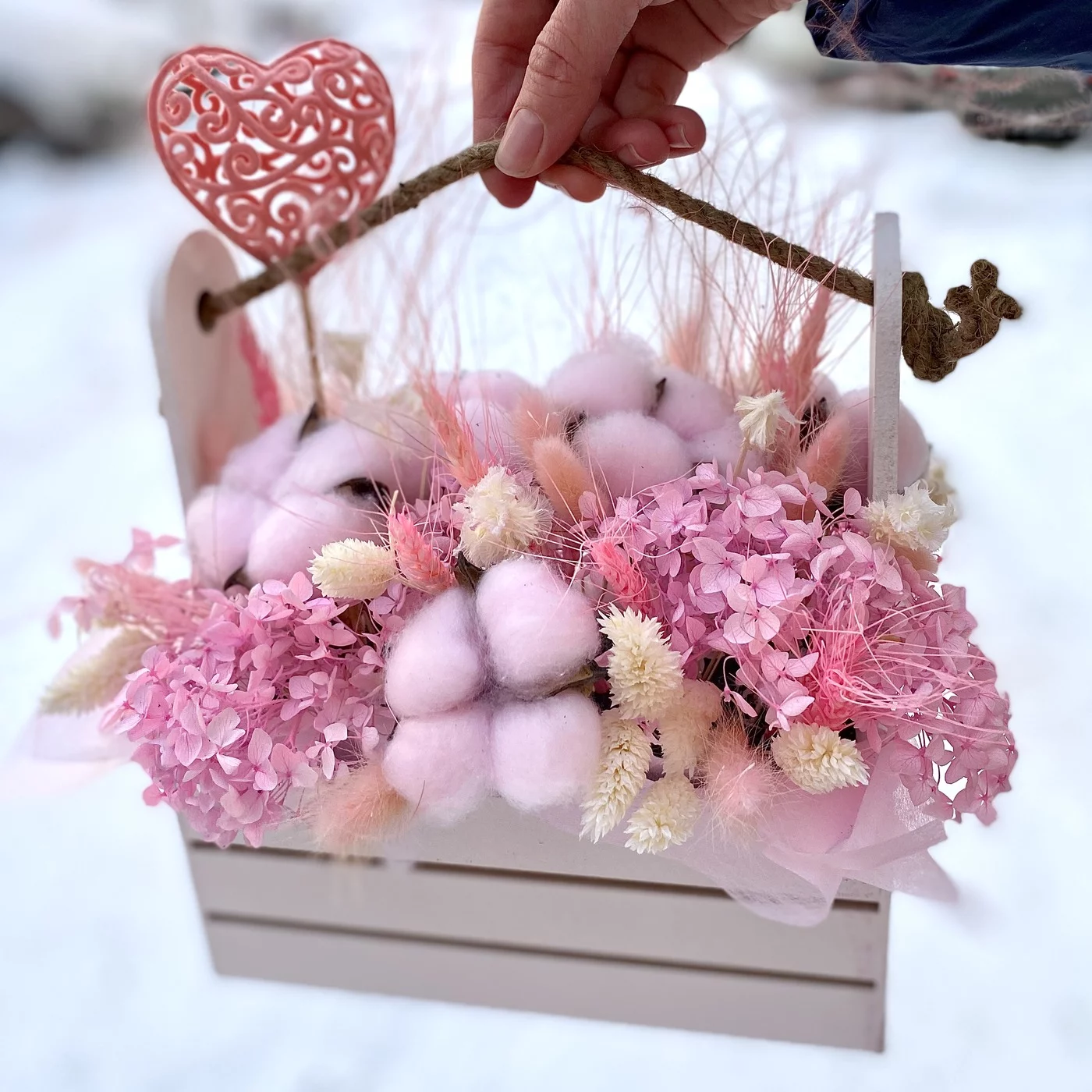 Композиция в деревянном ящике с ручкой, из натурального хлопка и других сухоцветов в розовых оттенках, будет радовать вас долгое время.