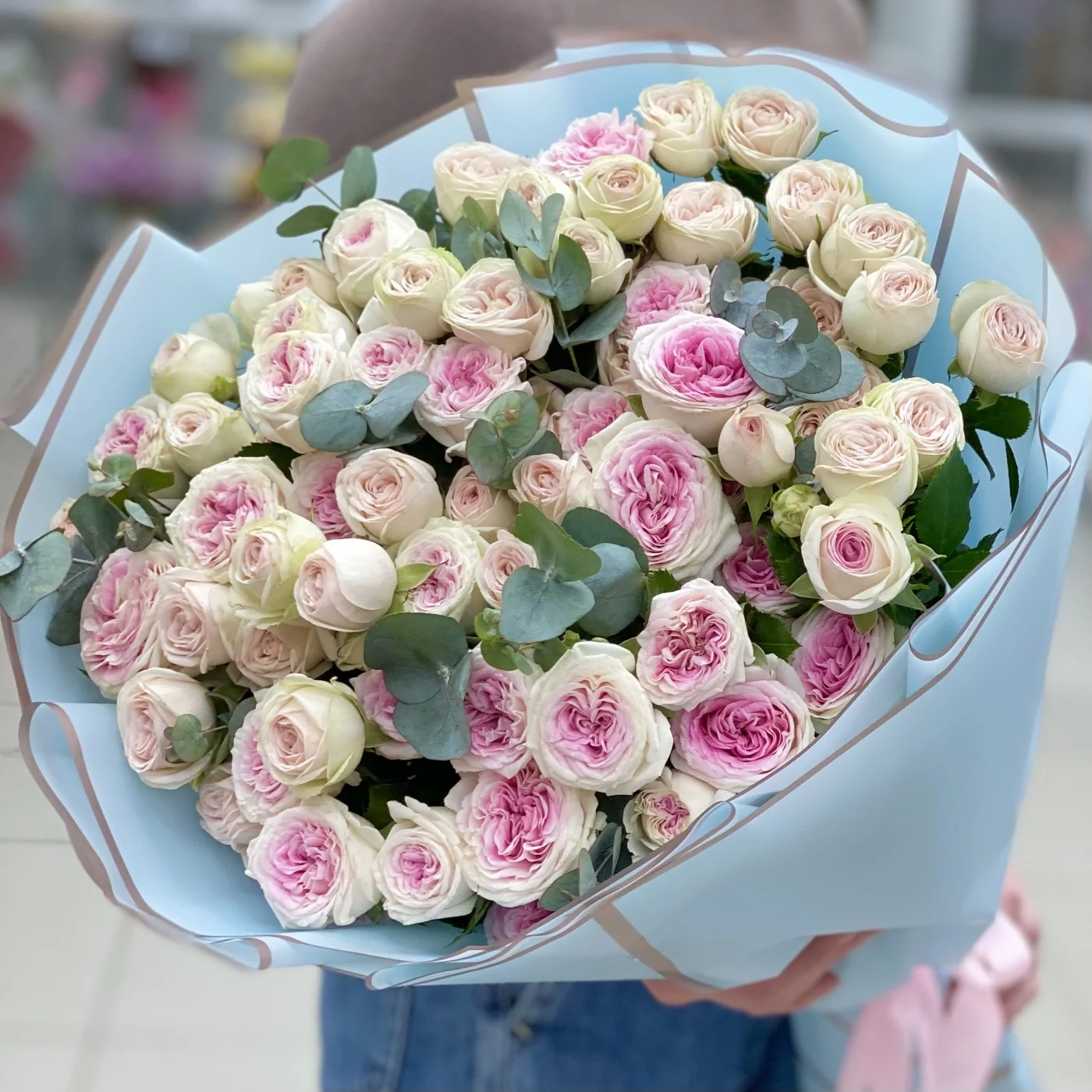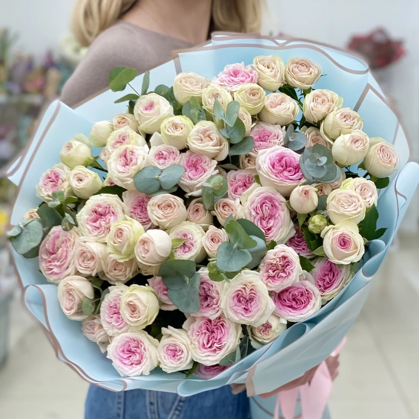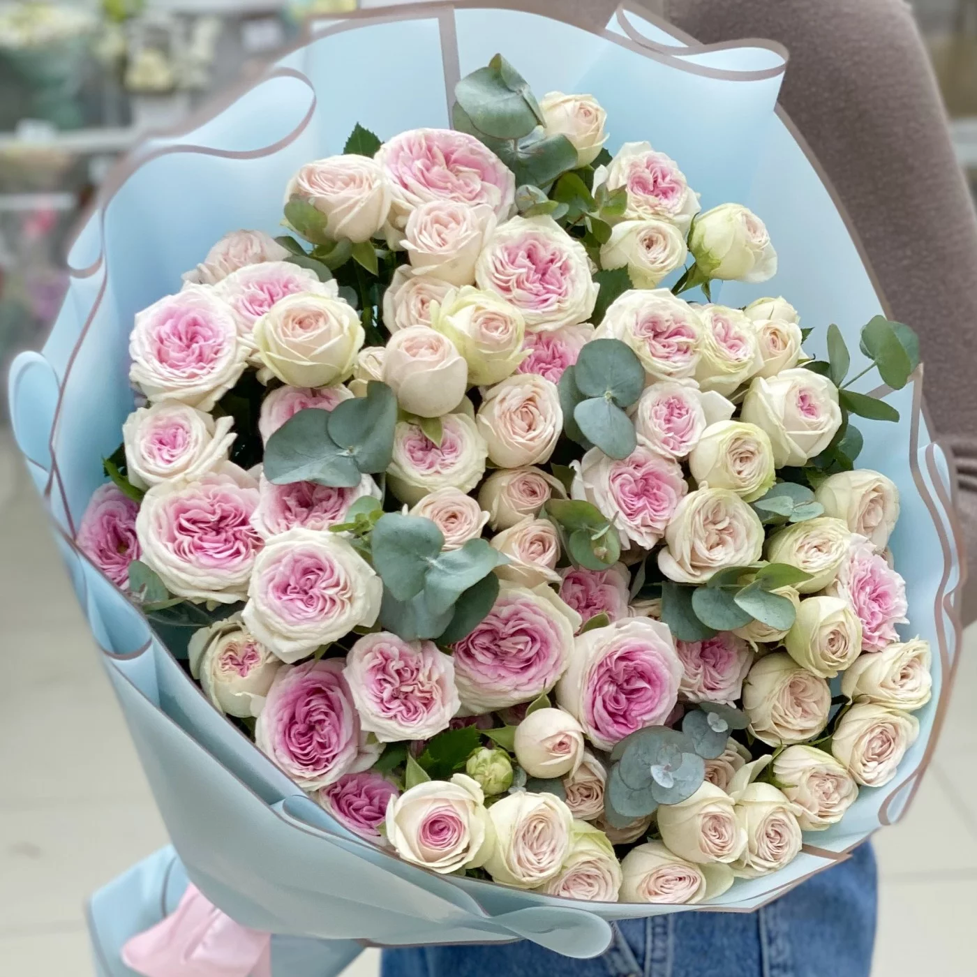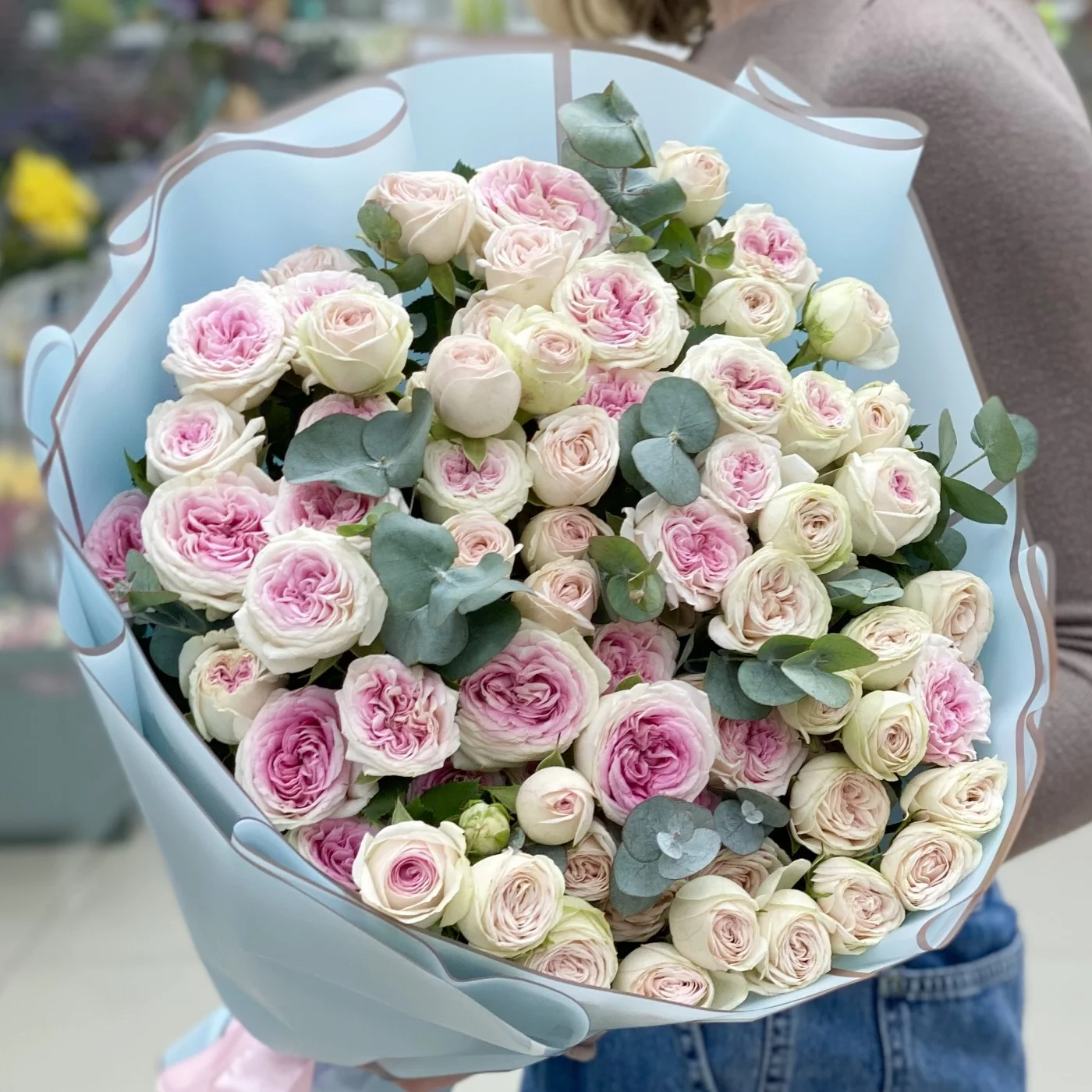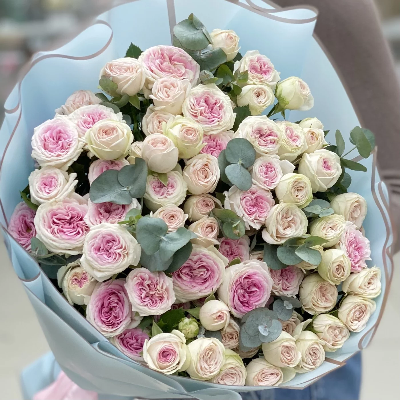 Красивый букет из двух сортов пионовидных роз из линейки Джелато.