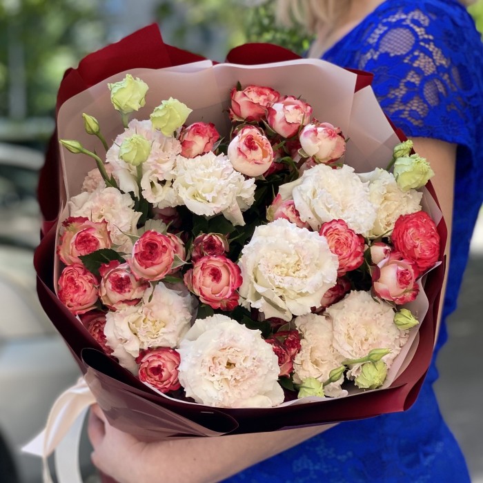 Букет пионовидных роз Сансет Мэджик и белых махровых эустом. Стильный и красивый букет для любого мероприятия. Кустовые розы Сансет Мэджик впечатляют своей красотой, нежным переливом красного и розового цвета на атласных лепестках. А пышные головки махровых эустом наполняет букет роскошной прелестью летнего утра.