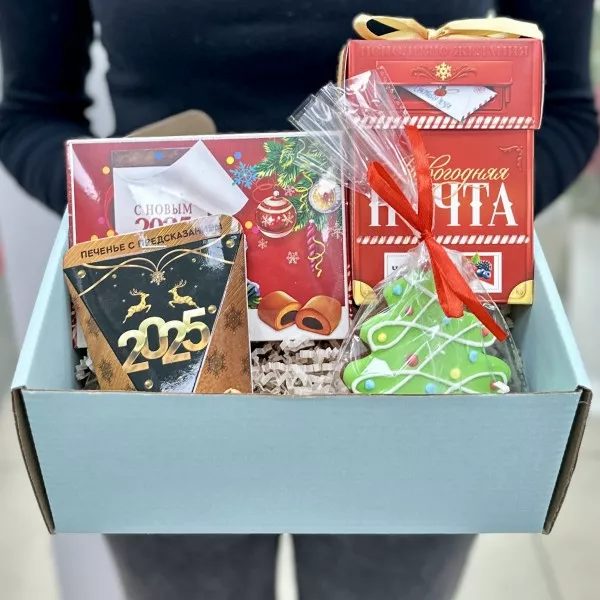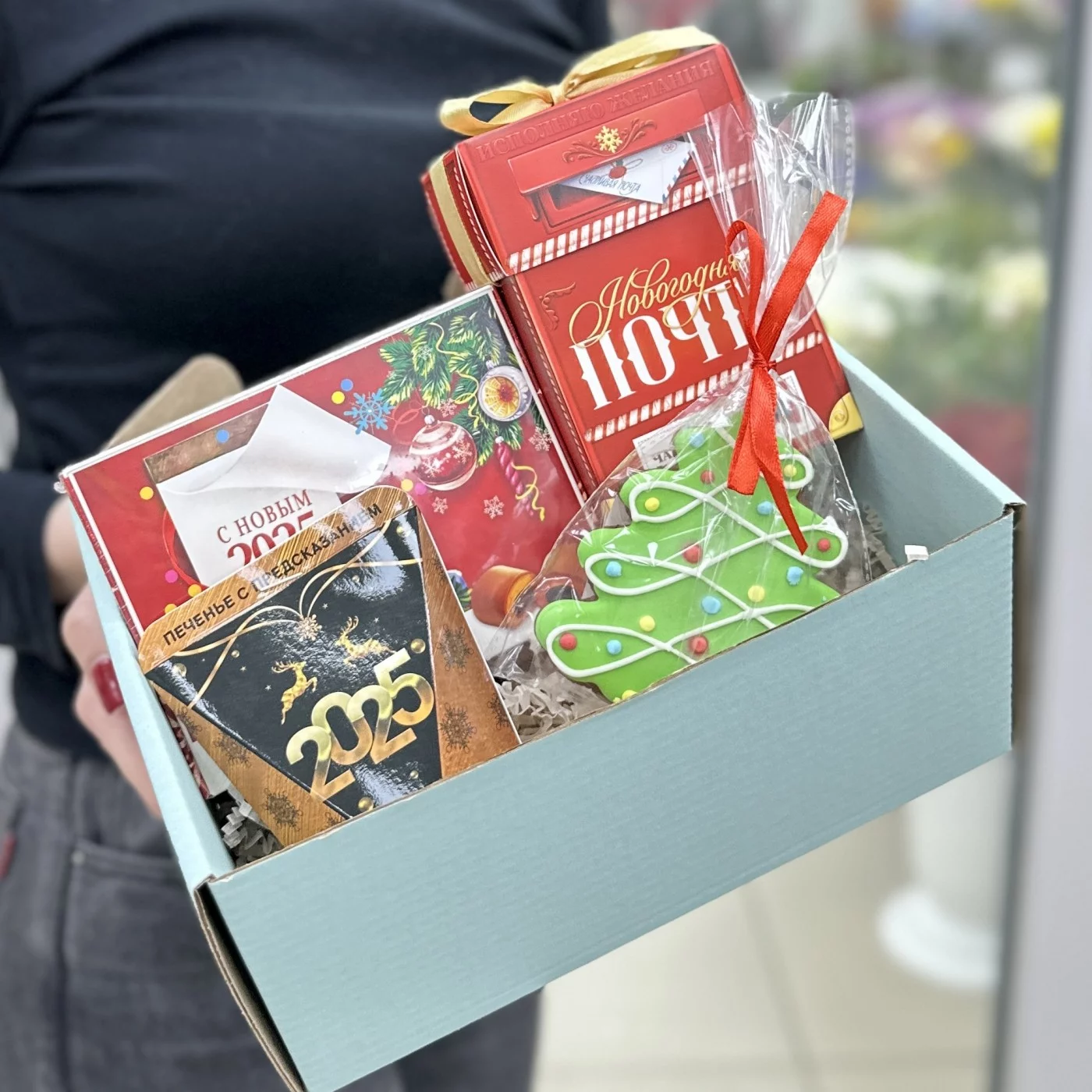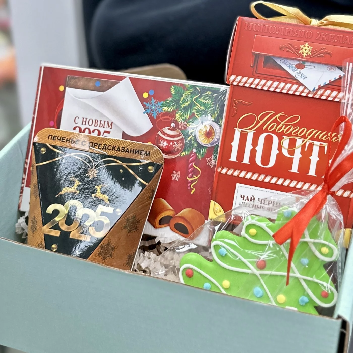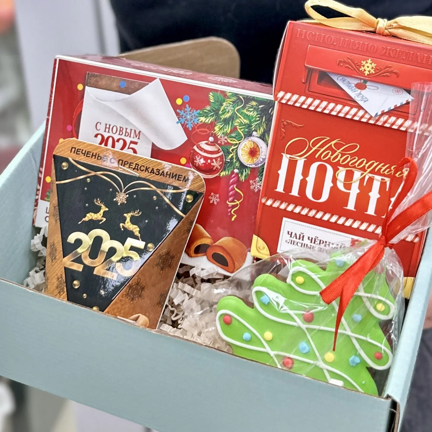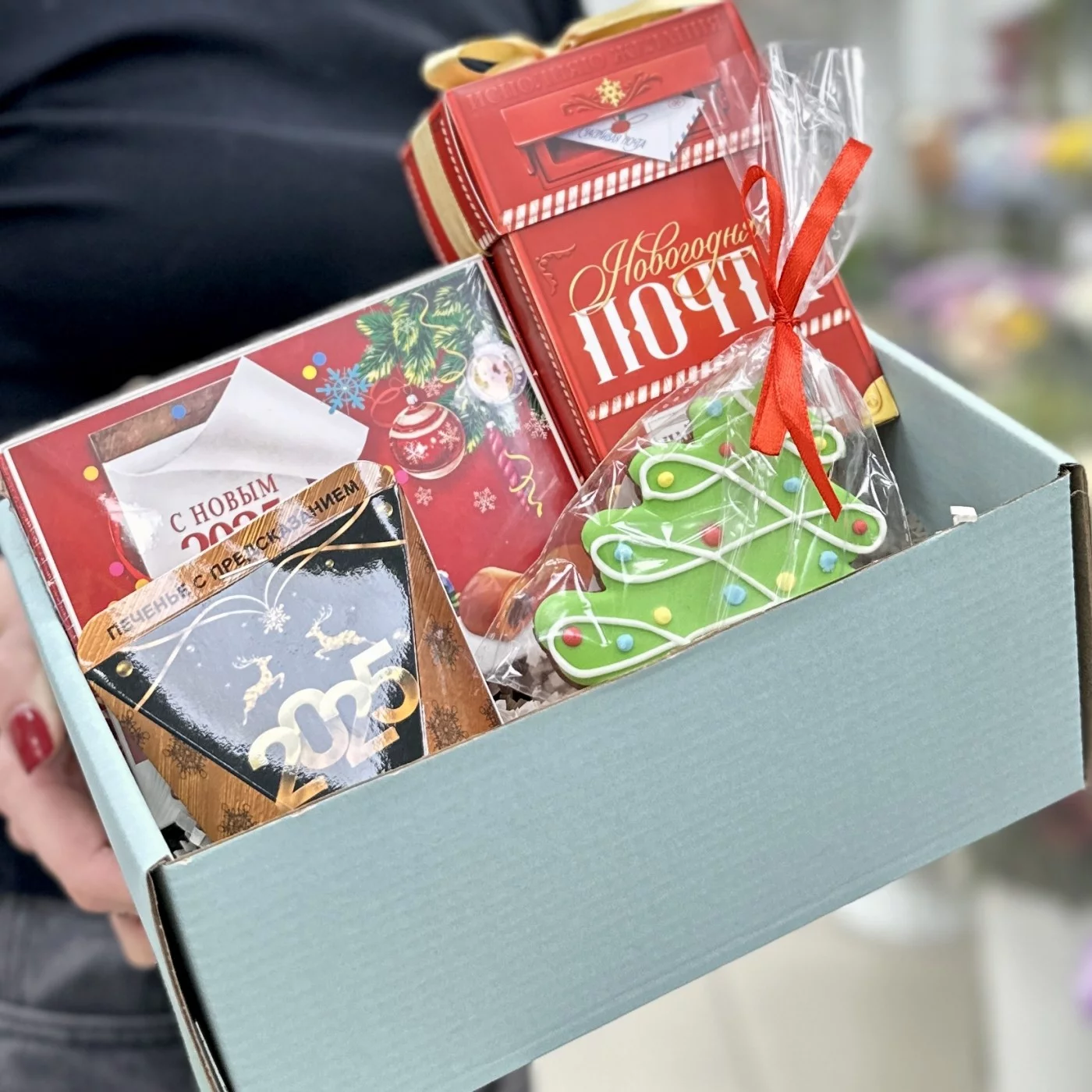 Подарочный набор с пряником, чаем и конфетами идеально подойдет для поздравления с Новым годом родных и коллег.