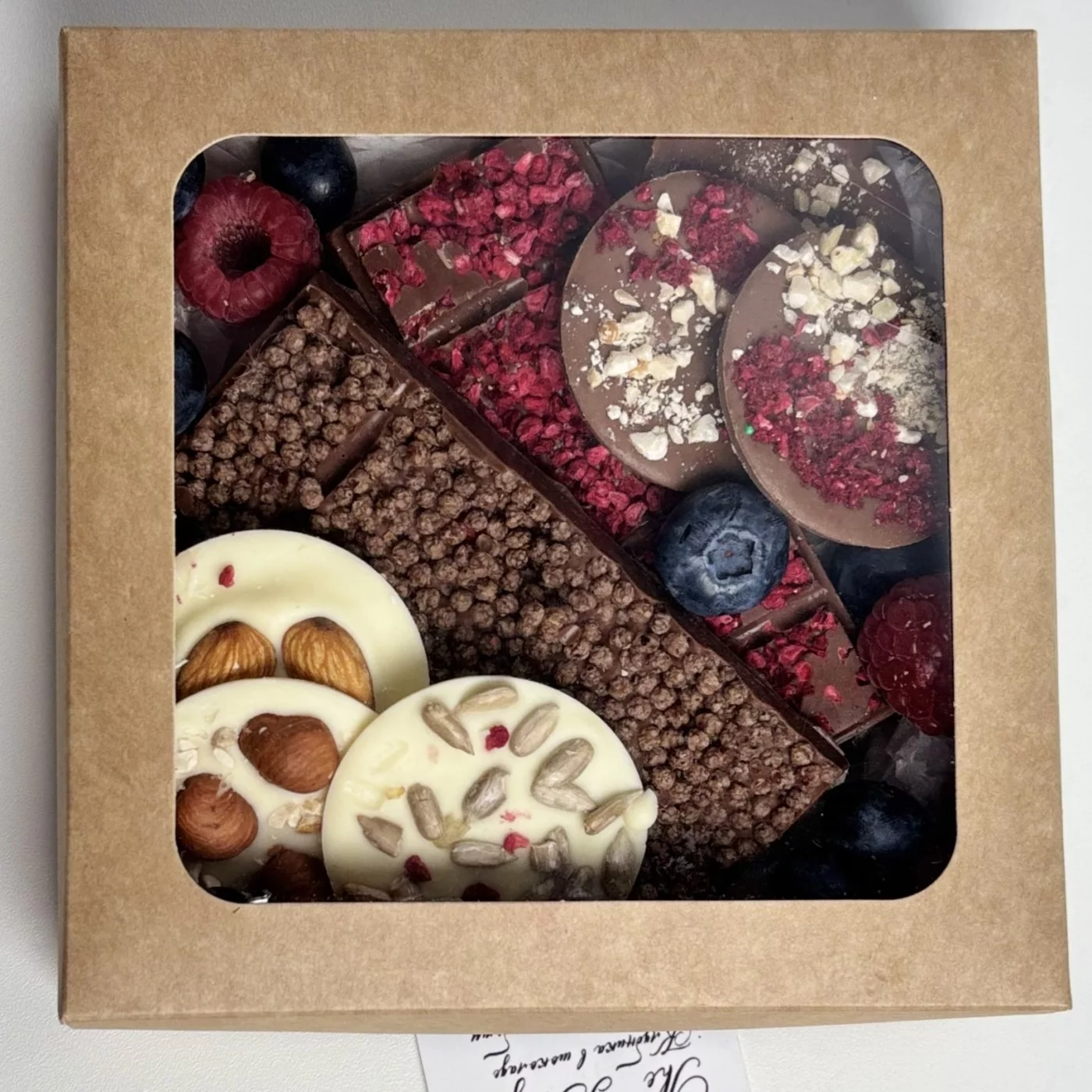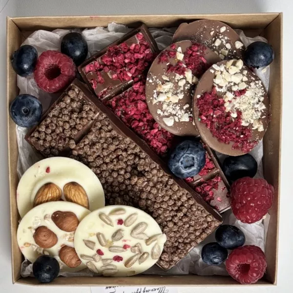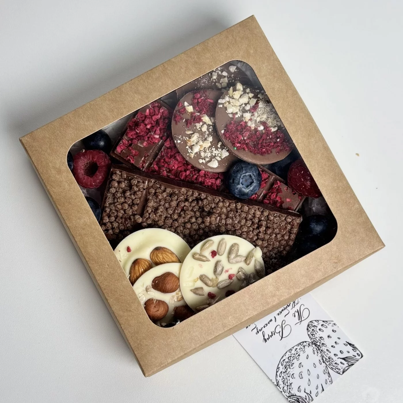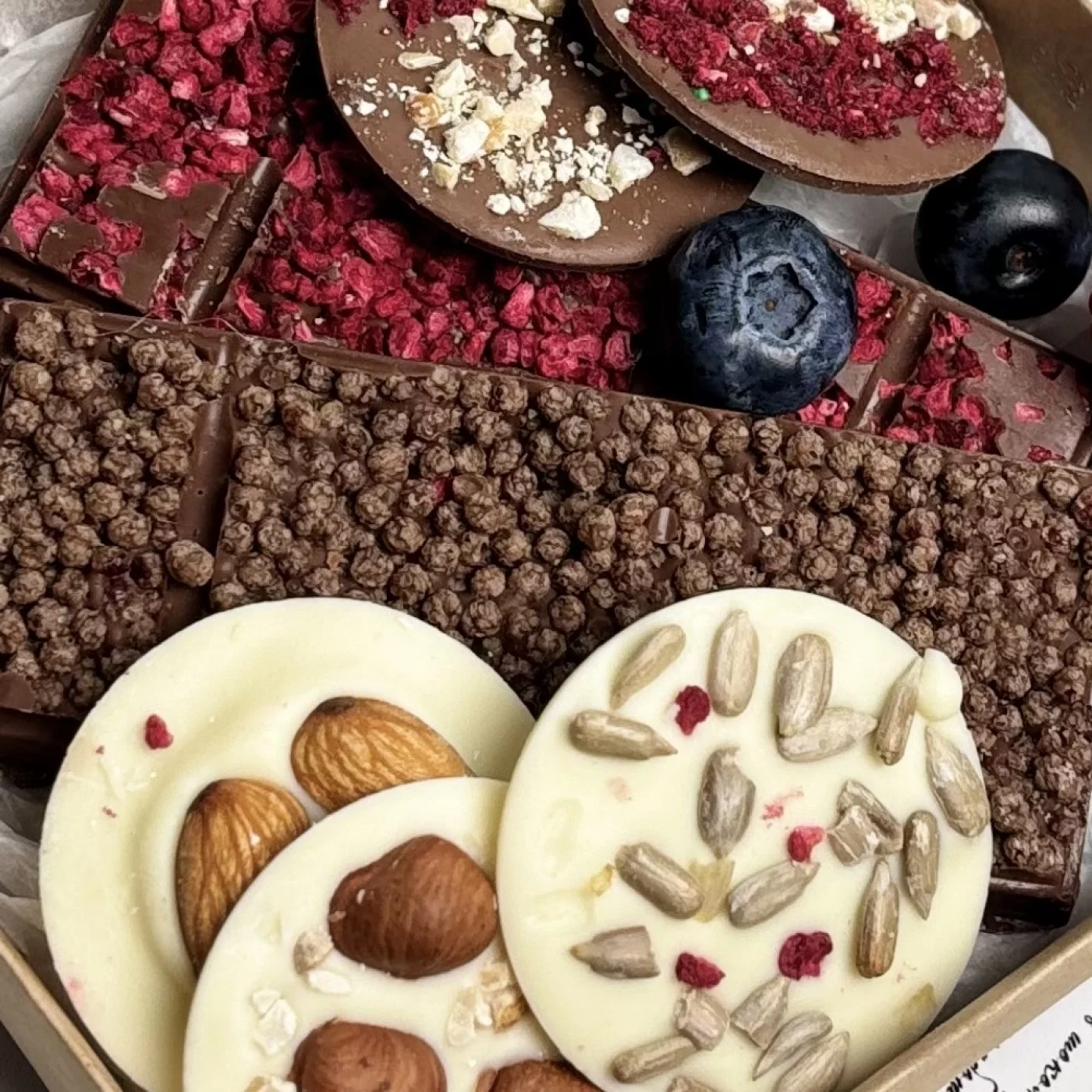Подарочный набор шоколада ручной работы. Молочный и белый бельгийский шоколад с орехами и посыпкой из сублимированной малины.