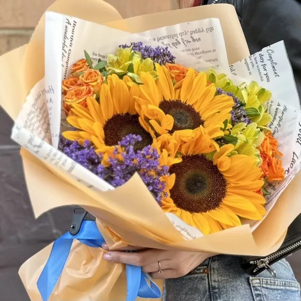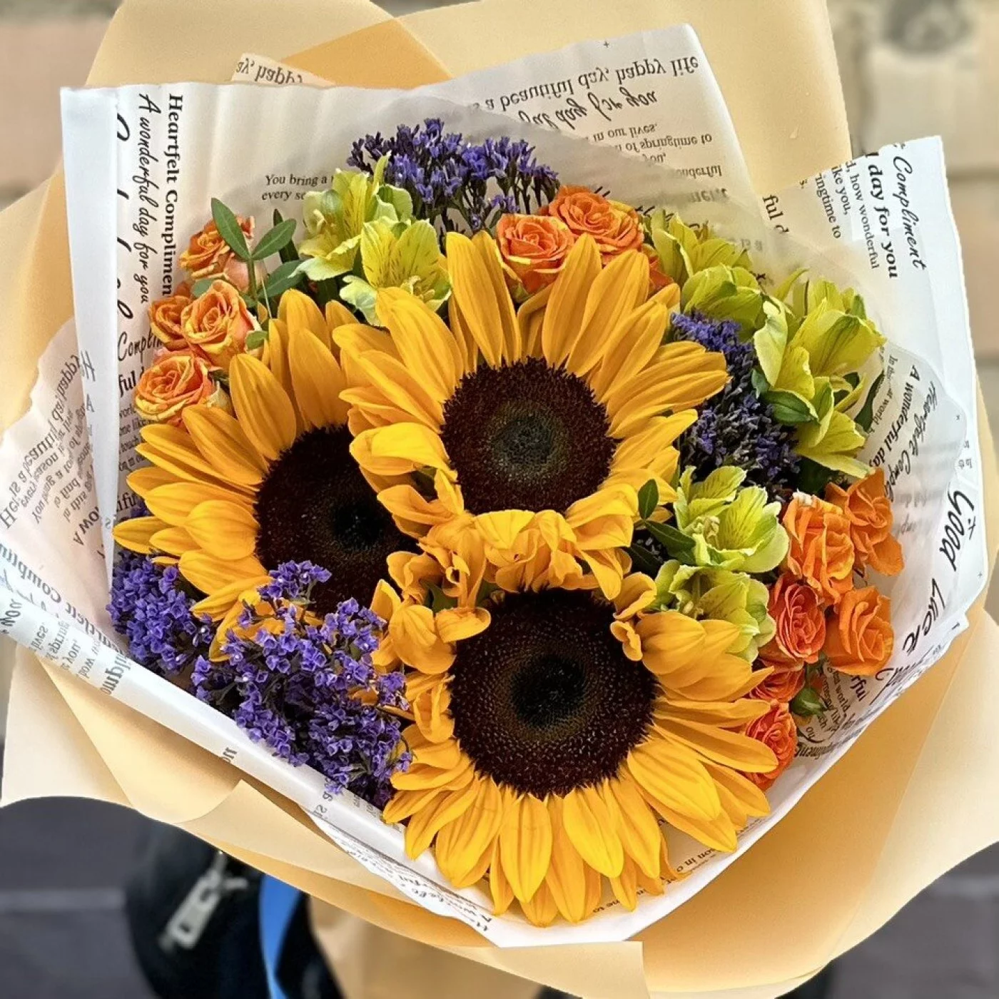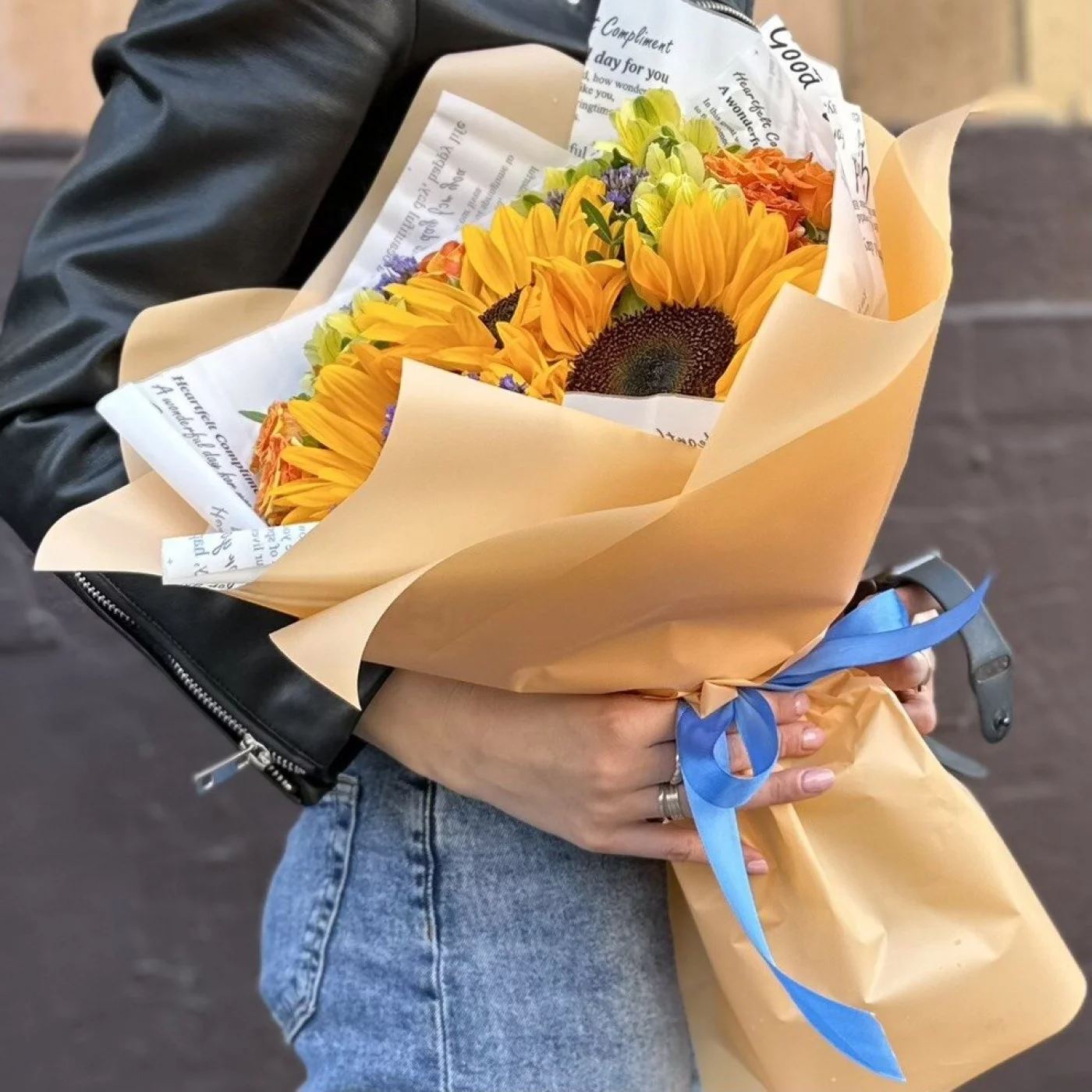 Букет из ярких подсолнухов и альстромерии, солнечный букет с яркими эмоциями.