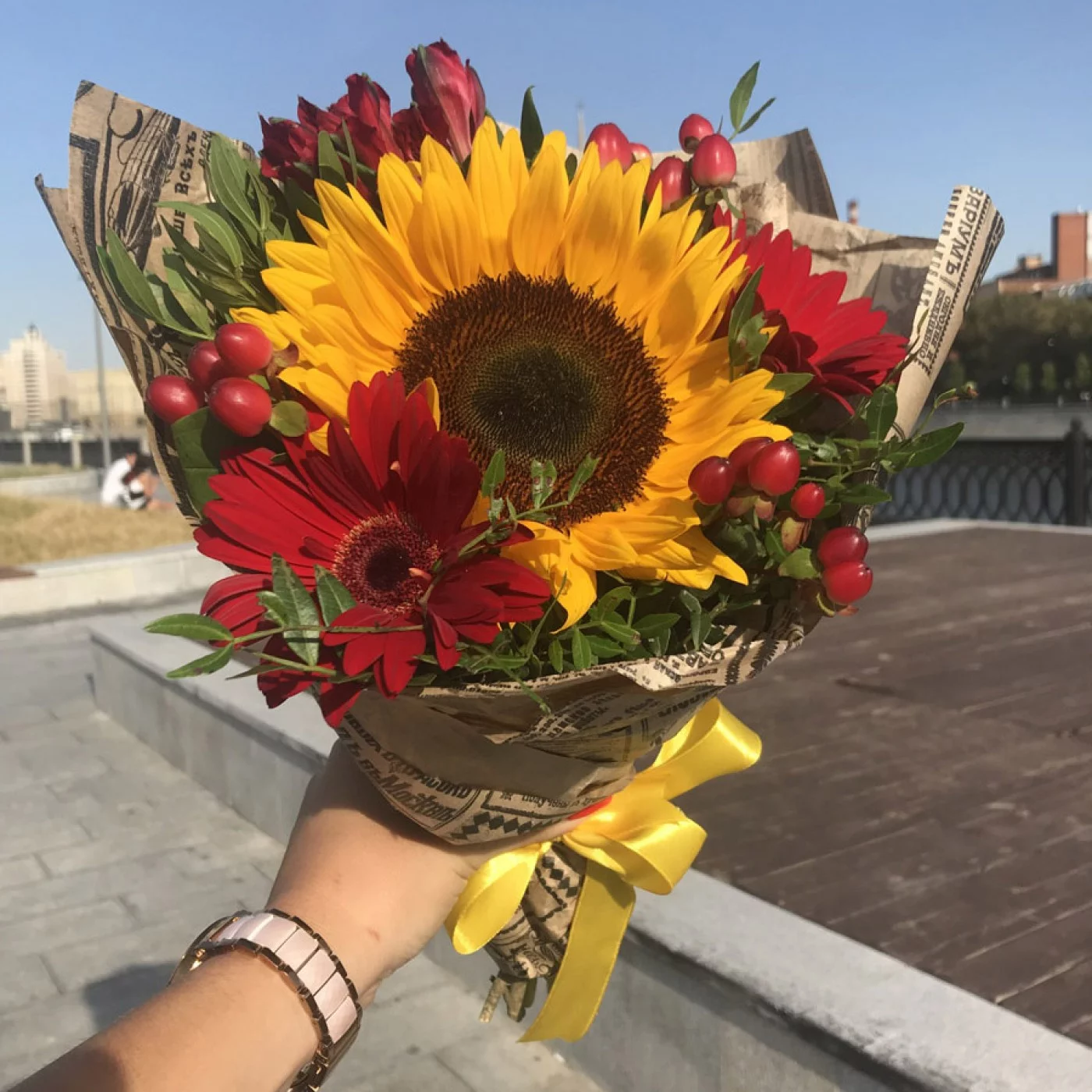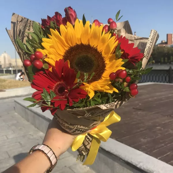Мини-букет из солнечных подсолнухов, красных гермини, альстромери и ягод гиперикума дарит воспоминания о теплом лете. Задорная композиция из цветов и нежной зелени – это настоящий фейерверк в мини-упаковке. Радостный и позитивный настрой дарят жизнерадостные оранжевые лепестки подсолнуха. Их отлично обрамляют сочные красные герберы.