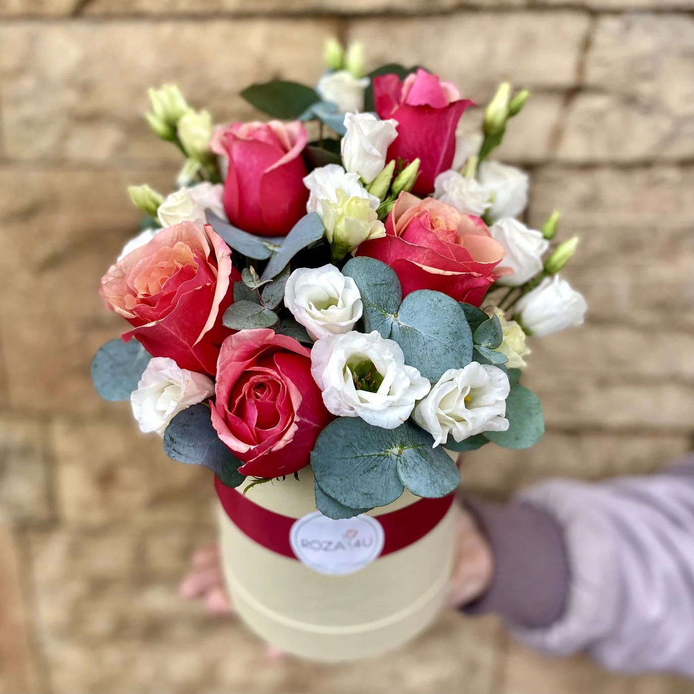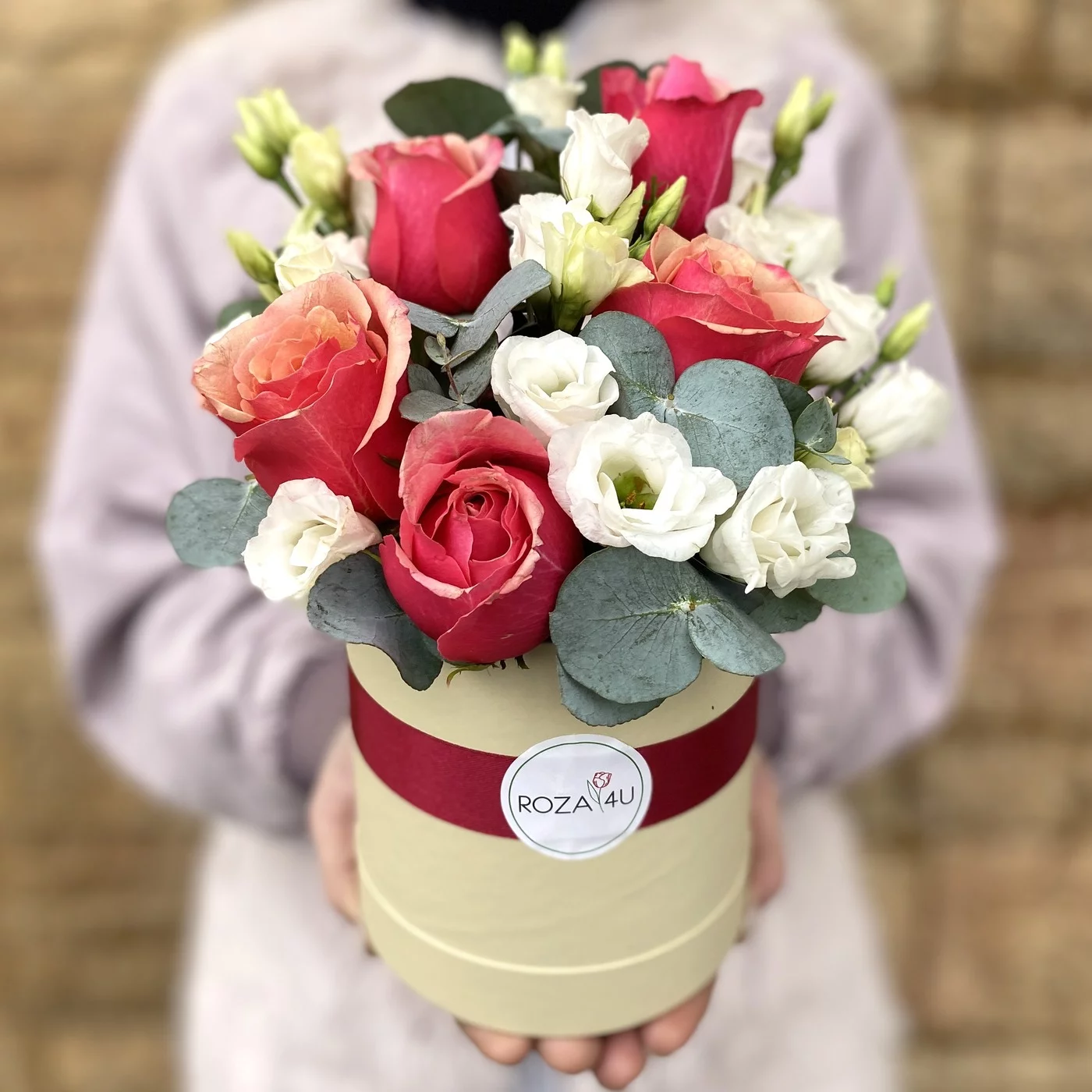 Состав букета: роза сорта Pompidou - 5 шт., эустома – 3 шт, эвкалипт, шляпная коробка для цветов