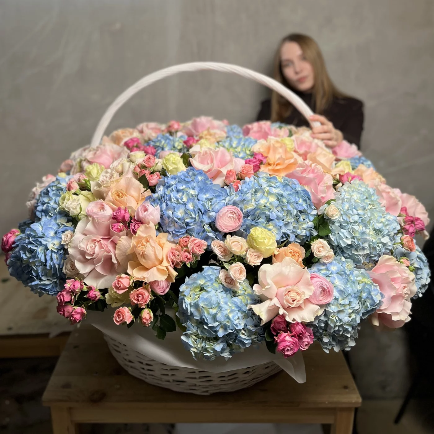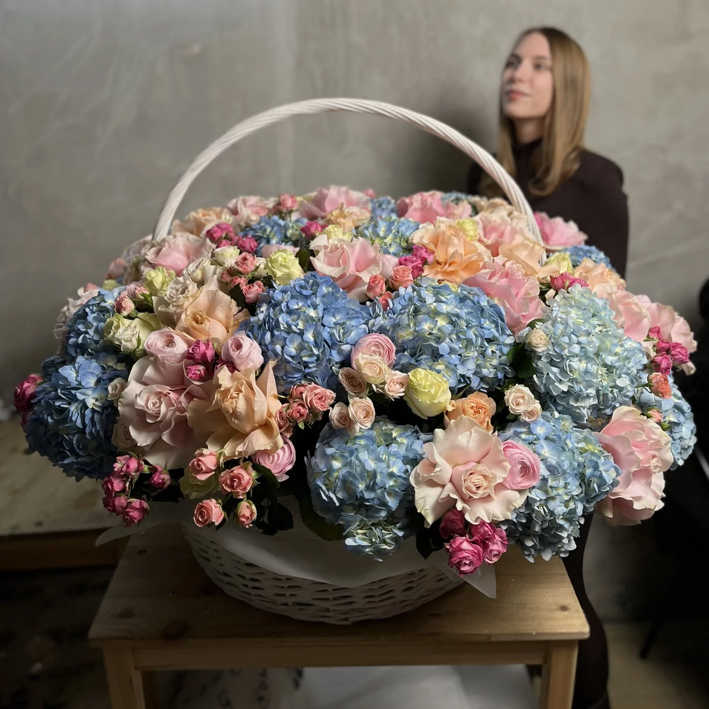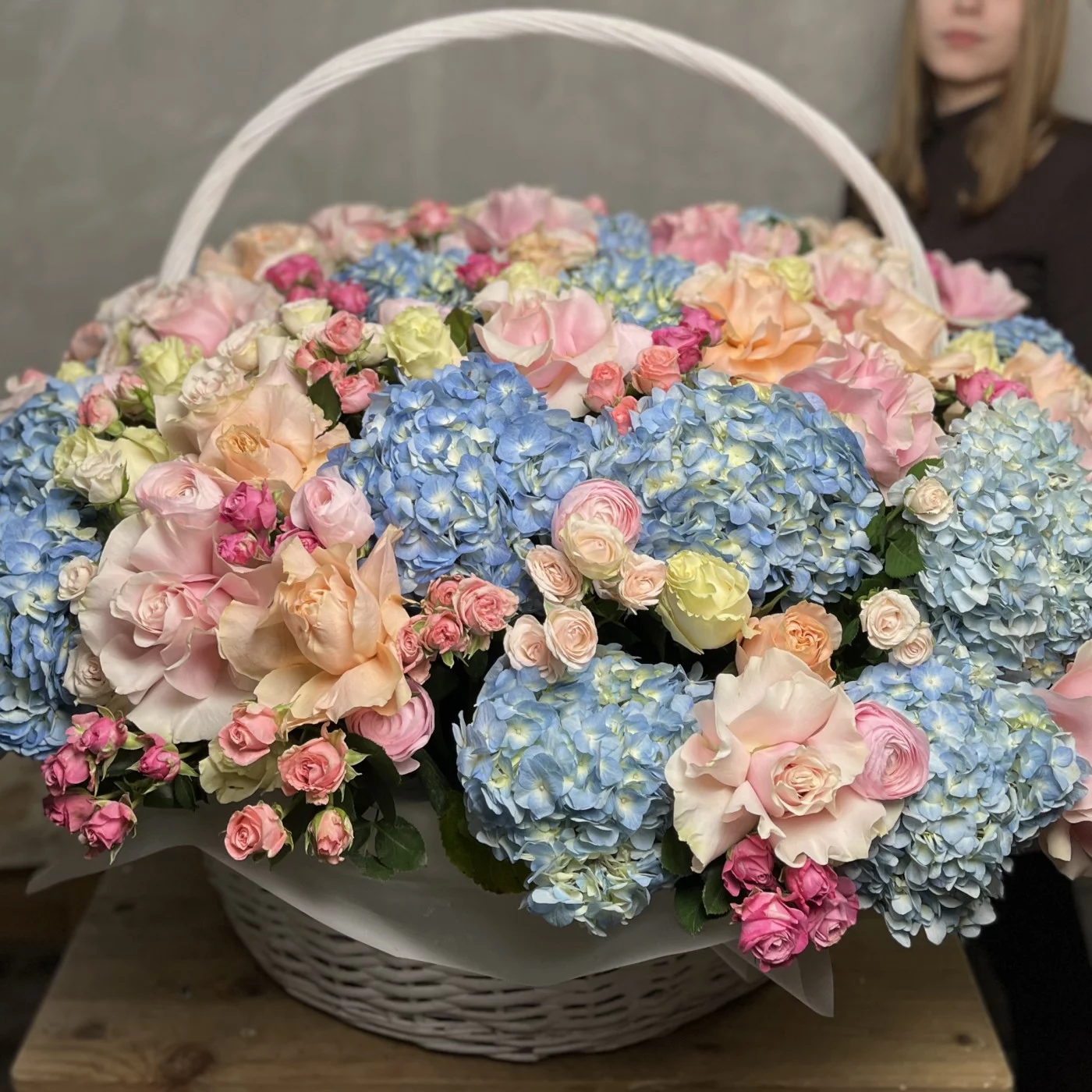Эта роскошная корзина Сказочный Сад — идеальный подарок для тех, кто ценит красоту и изящество цветов. Сочетание гортензий, роз и ранункулюсов создает неповторимую композицию, которая станет настоящим украшением любого пространства.