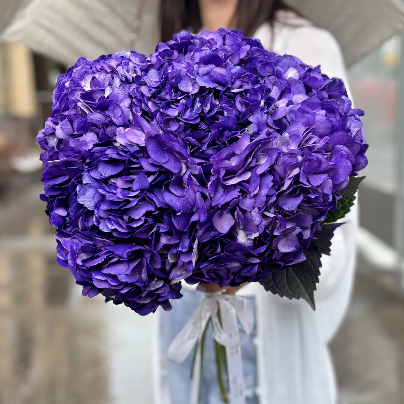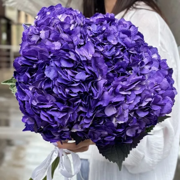 Пурпурные гортензии создают пышную и воздушную композицию, напоминающую облако. Каждый цветок состоит из множества мелких лепестков, образующих плотные и объемные соцветия.