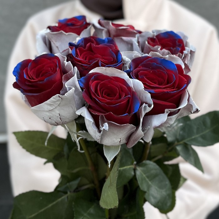 Радужная бело-сине-красная роза высотой 70 см — это не только красивый цветок, но и символ ярких эмоций и праздника.