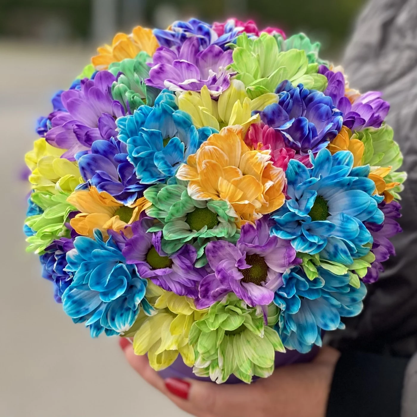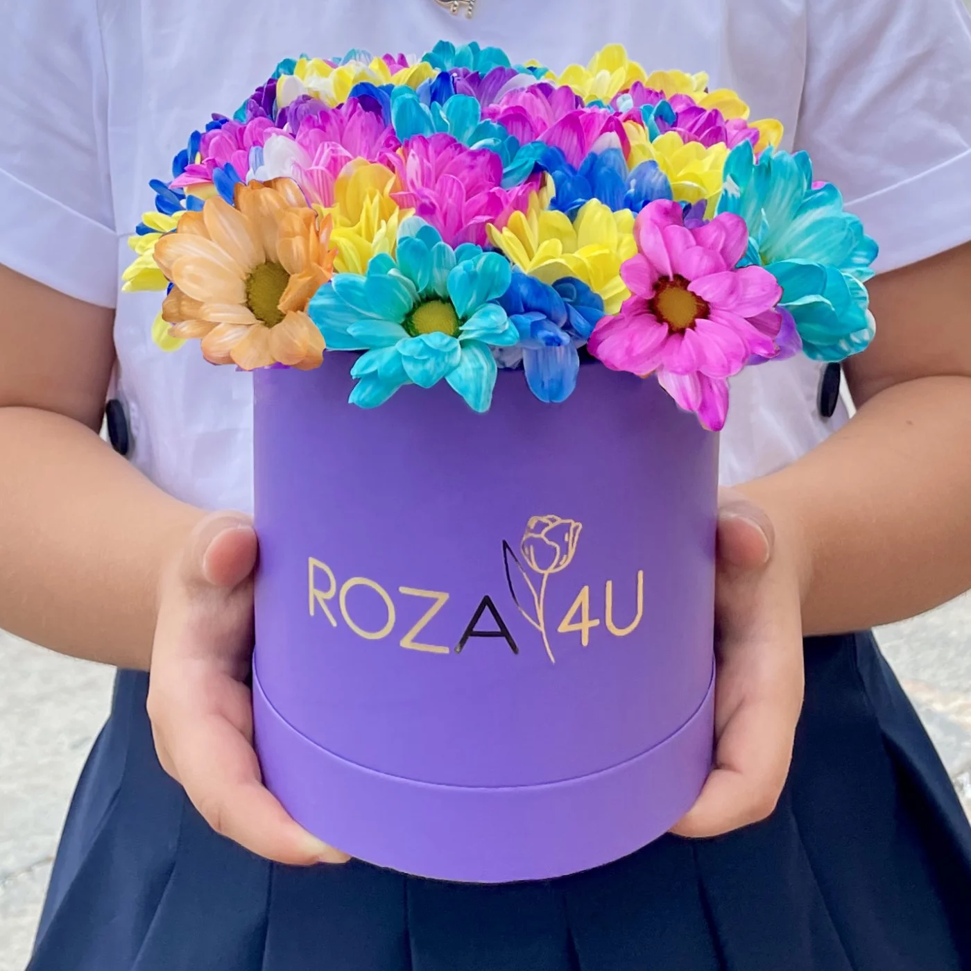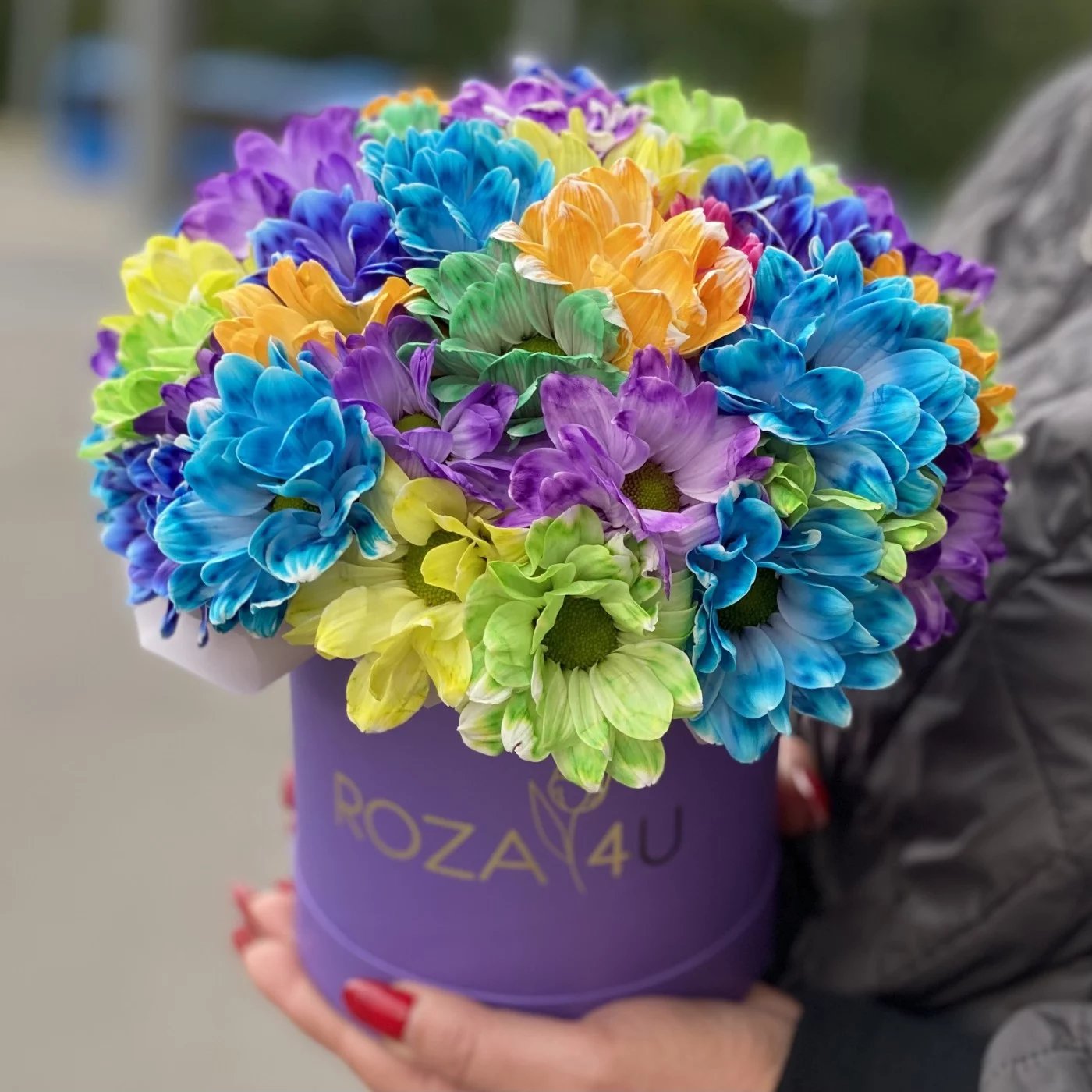 Радужная композиция из хризантем в шляпной коробке - хороший способ поднять настроение своим близким или напомнить о своих чувствах второй половинке. Кроме того, все цвета радуги, собранные в единой композиции, станут гармоничным украшением как детского праздника, так и заурядного визита в гости. Благодаря низкой стоимости, композиция пользуется особой популярностью у наших клиентов. Хризантемы в шляпной коробке - универсальный подарок,ведь этой очаровательной композиции будет рада любая девушка.