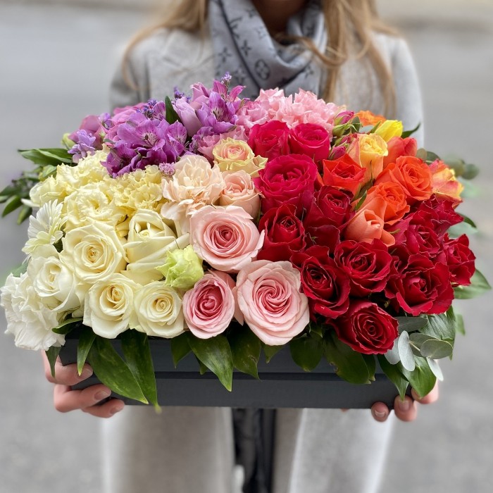 Состав композиции: роза “микс” – 35 шт., эустома – 2 шт., альстромерия – 3 шт, лимониум – 1 шт, эвкалипт, рускус, гермини – 2 шт, ящик.