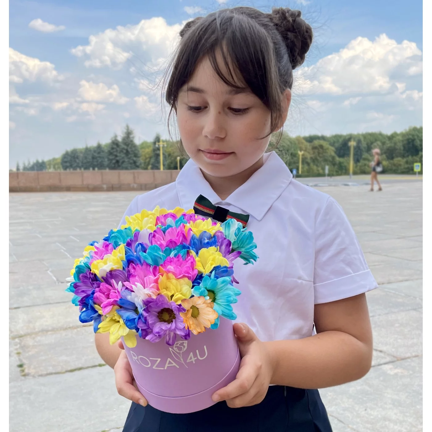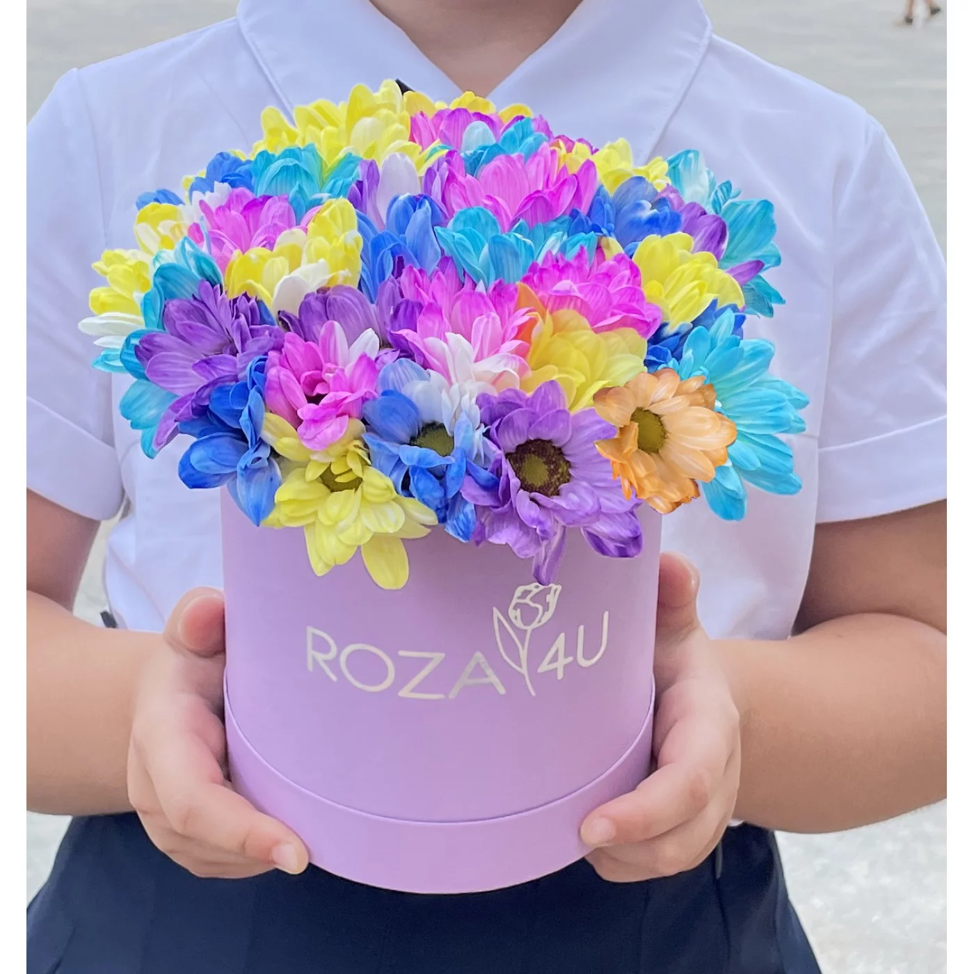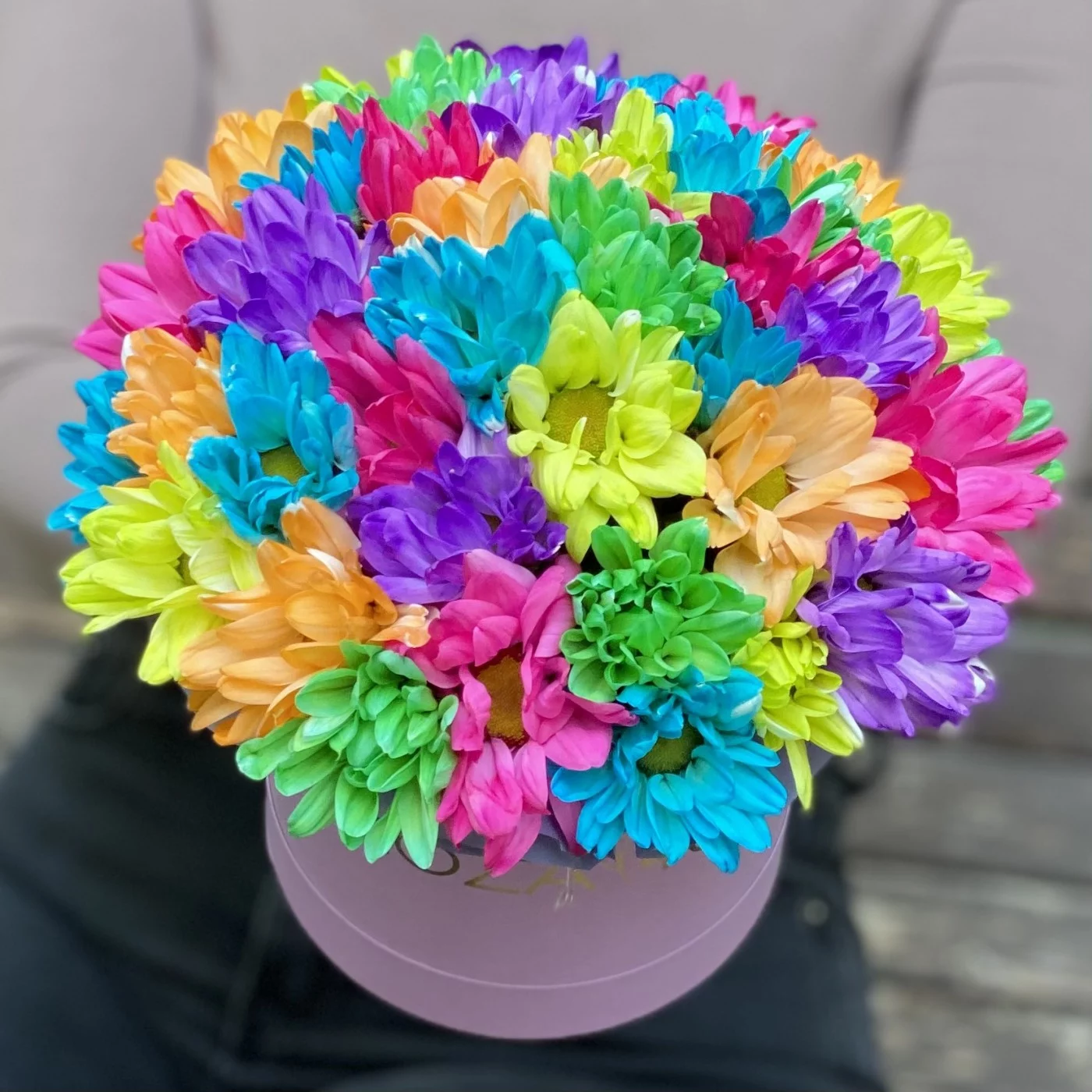 Лиловая коробка радужных хризантем - насыщенное сочетание всех цветов радуги в лаконичной, стильной упаковке - шляпной коробке нежного трендового цвета. Хризантемы в шляпной коробке - универсальный подарок, этой очаровательной композиции будет рада любая девушка.