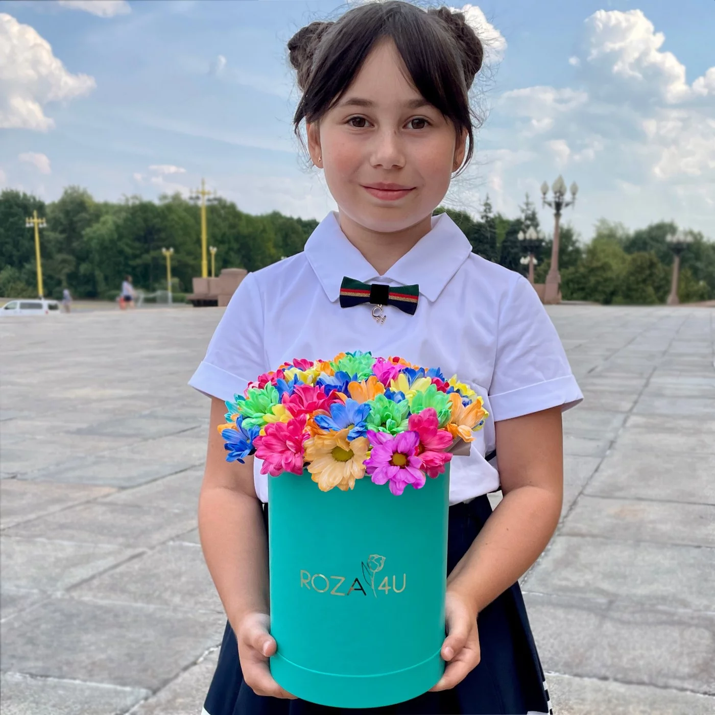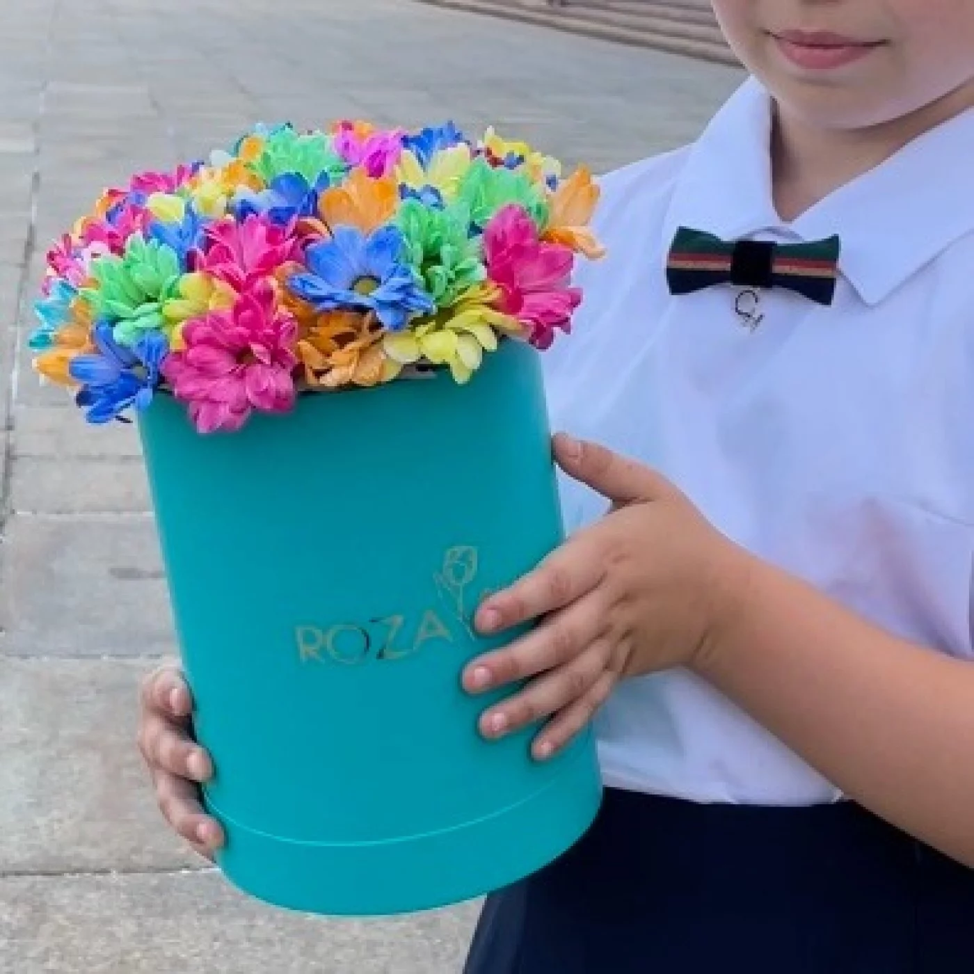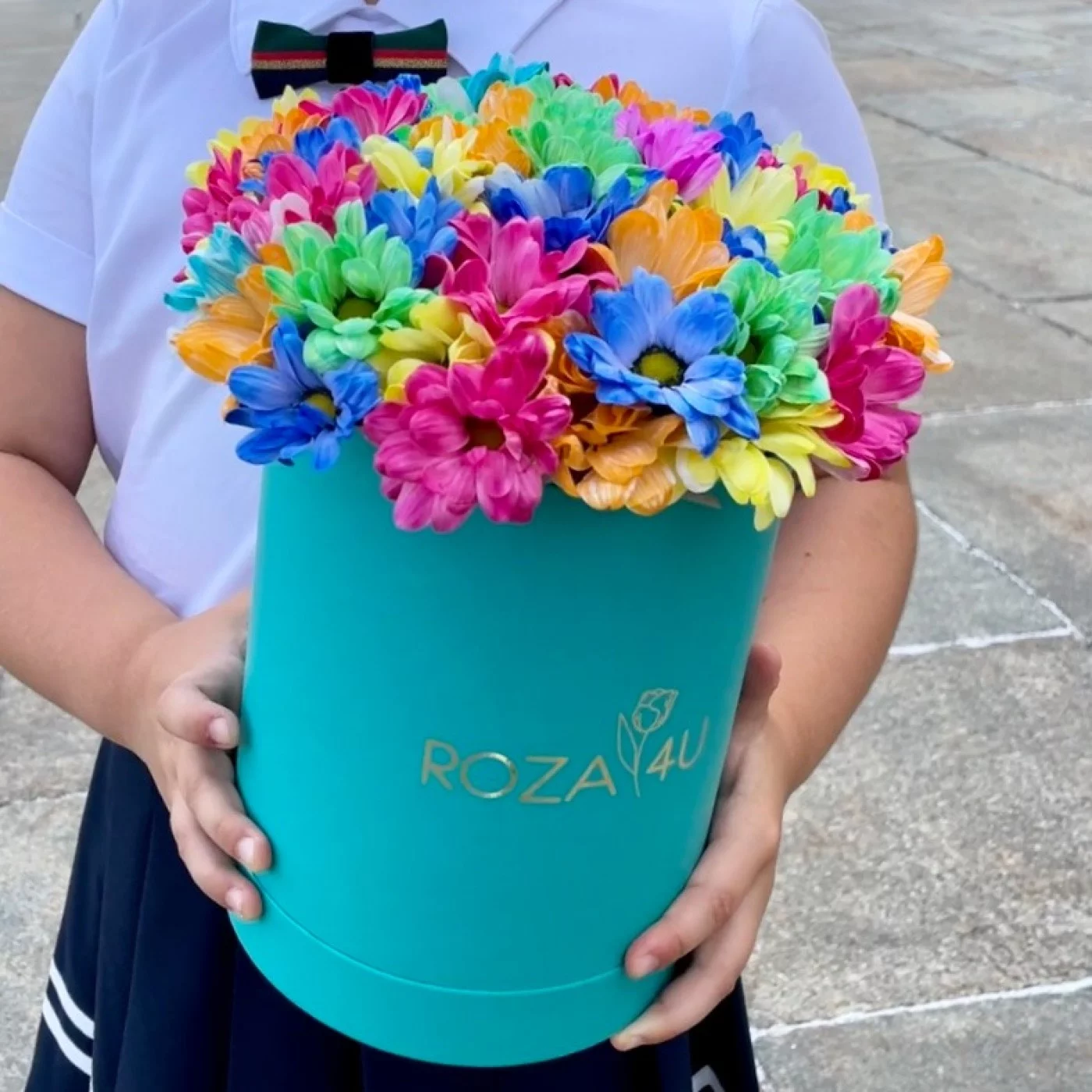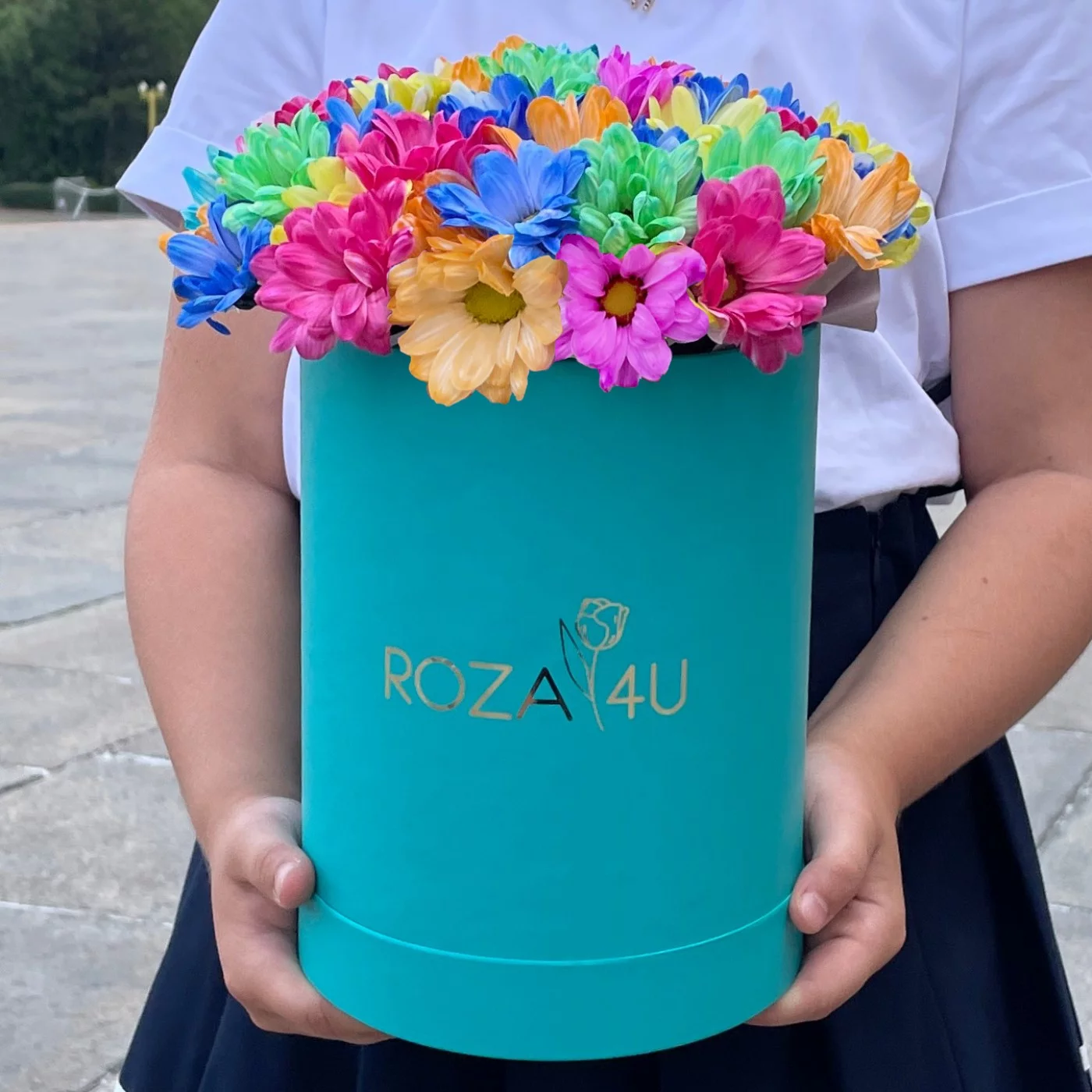 Яркая бирюзовая коробка с композицией из радужных хризантем - насыщенное сочетание всех цветов радуги! Хризантемы в стильной шляпной коробке трендового цвета - универсальный подарок, такой очаровательной композиции будет рада любая девушка.