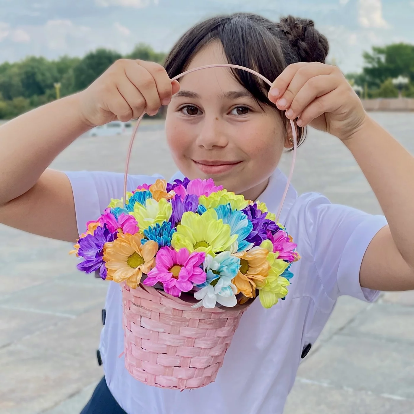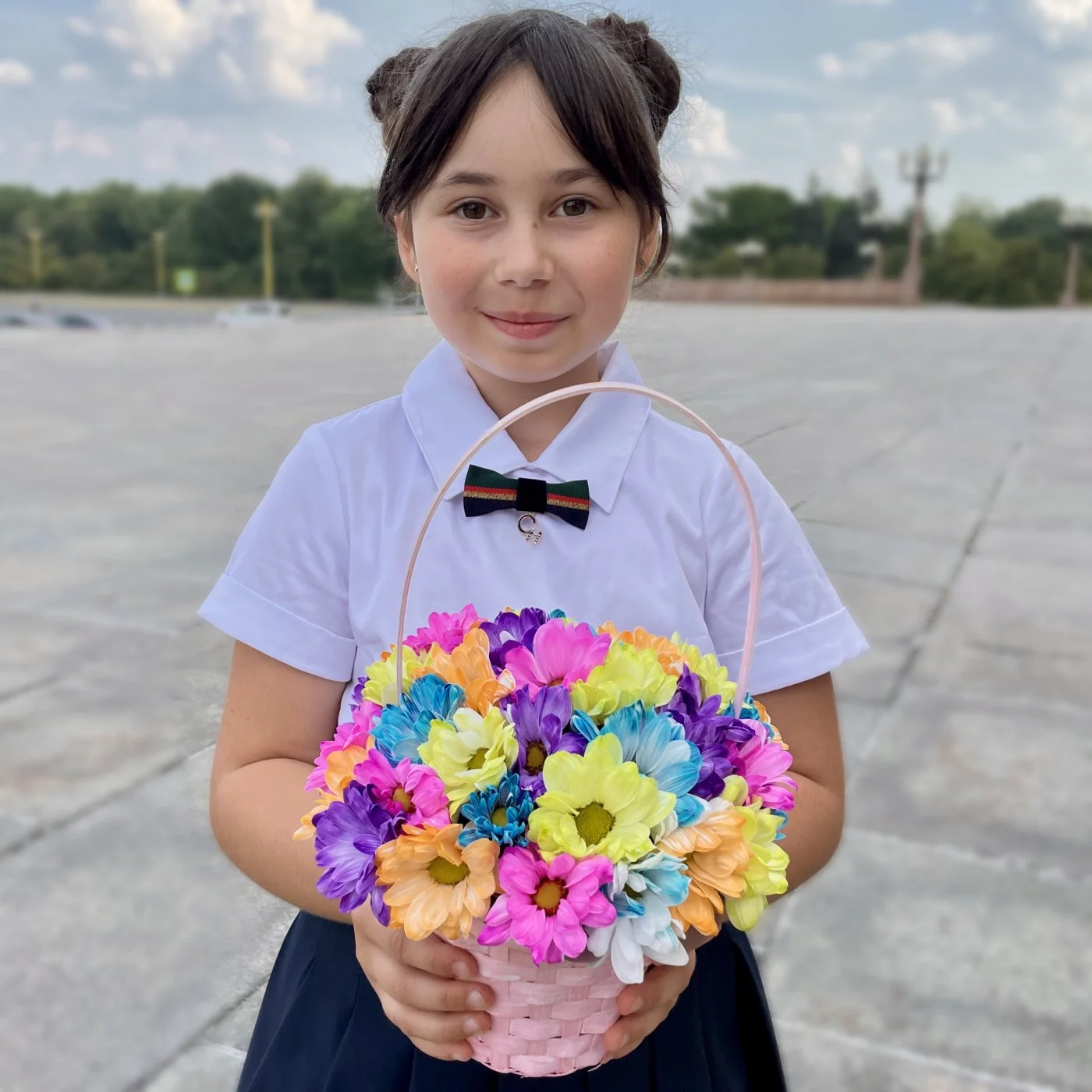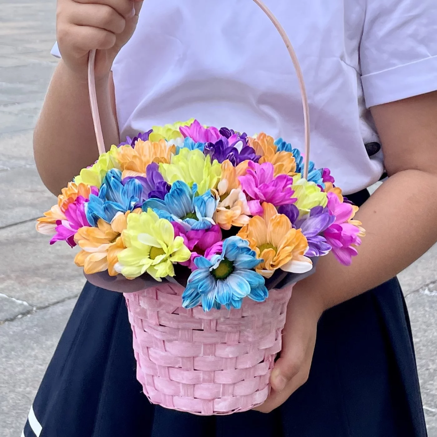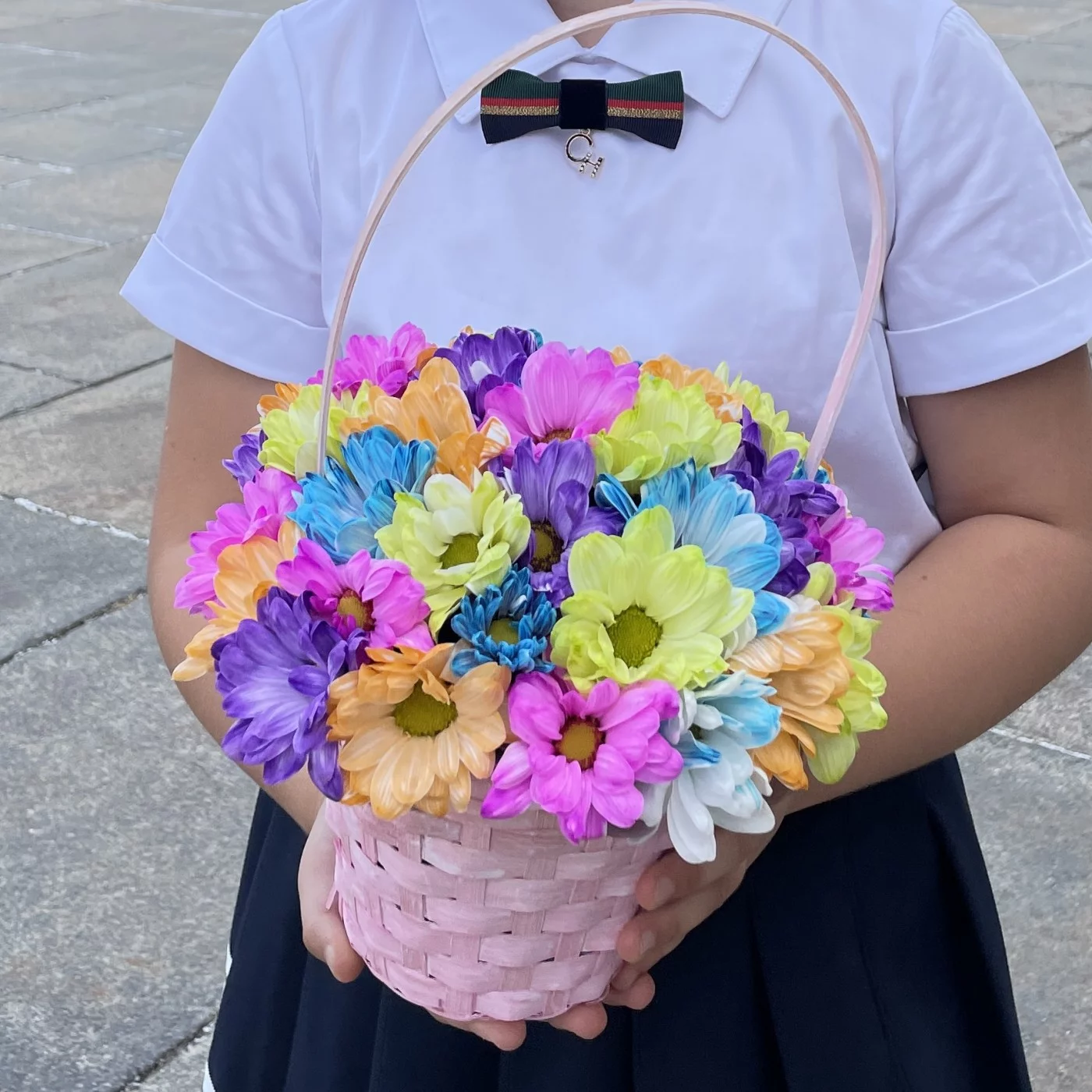 Композиция из ярких радужных хризантем в плетёной корзинке розового цвета. Прекрасный подарок педагогу, уместный комплимент яркой личности, превосходный способ сделать пасмурный день ярче!