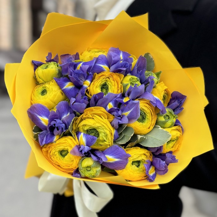 Яркие ранункулюсы в сочетании с синими ирисами – интересное дизайнерское решение, которое немедленно привлекает внимание. Такой букет не оставит равнодушным, ведь он вызывает ощущение нежности, воздушности, чувственности.