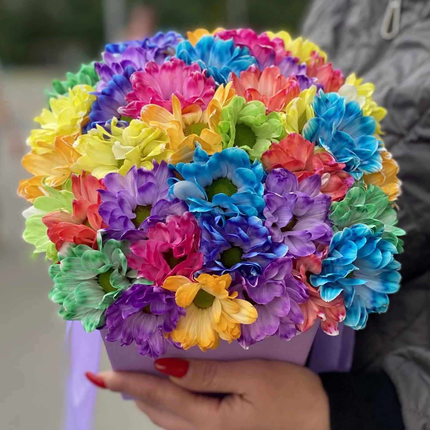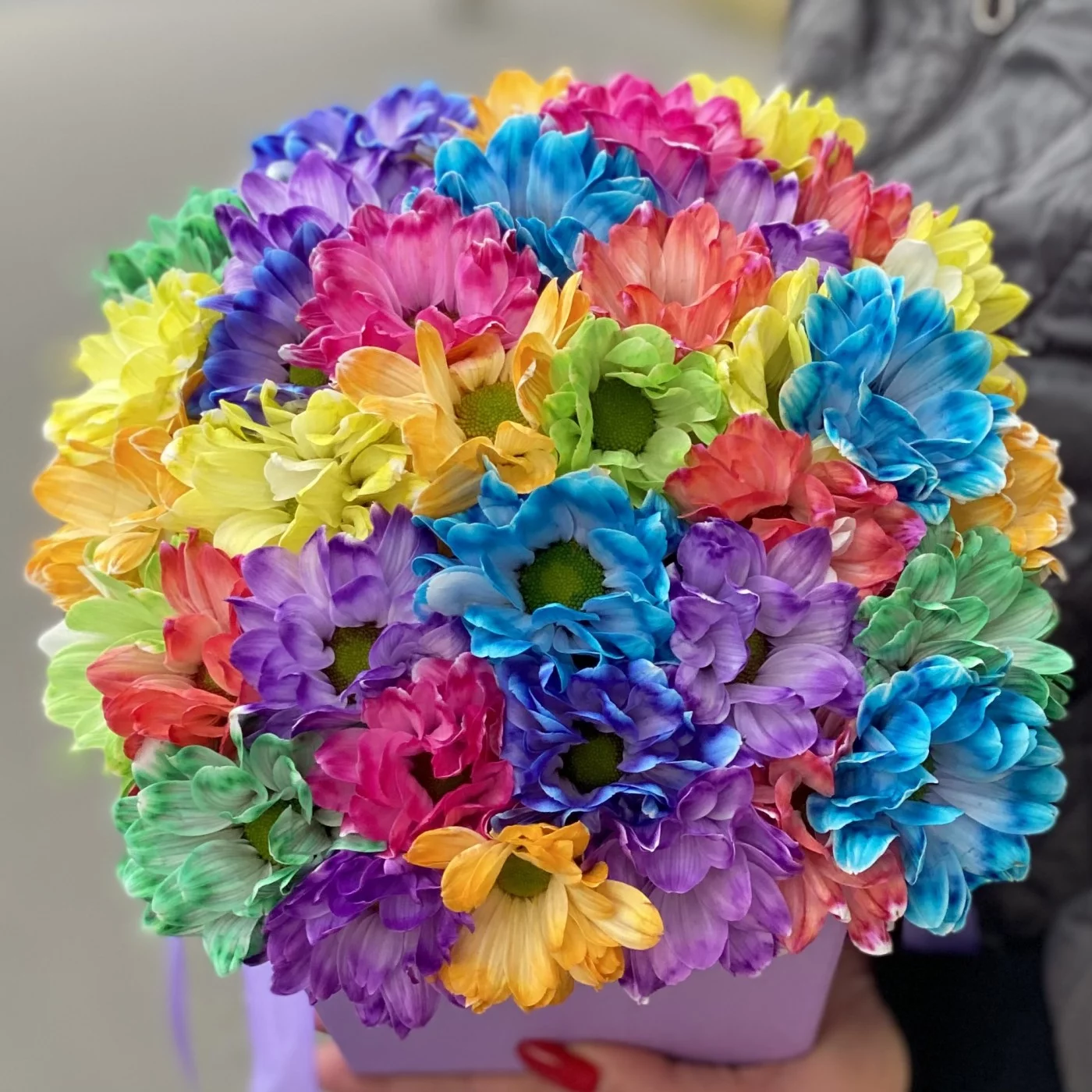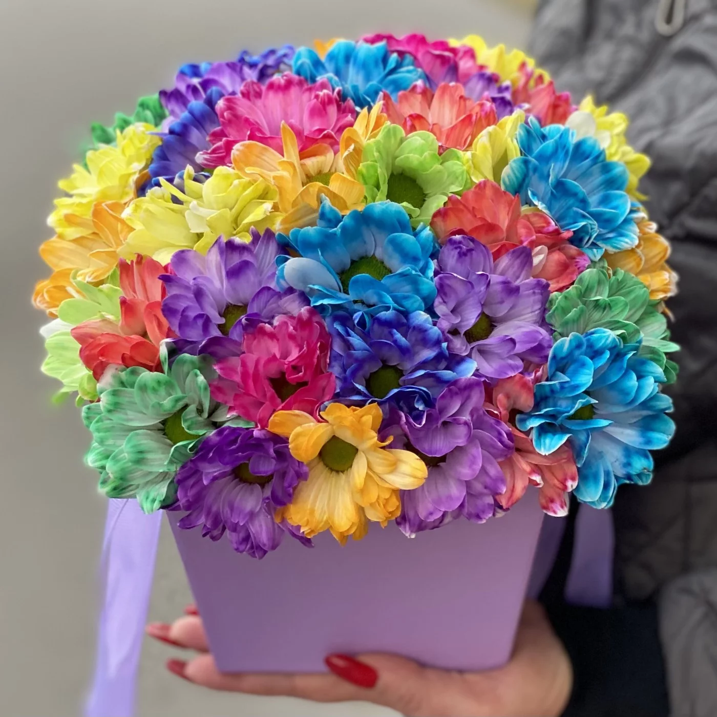 Композиция с цветами радужной расцветки в коробке с ручками. Прекрасный подарок педагогу, уместный комплимент яркой личности, превосходный способ сделать пасмурный день ярче =)