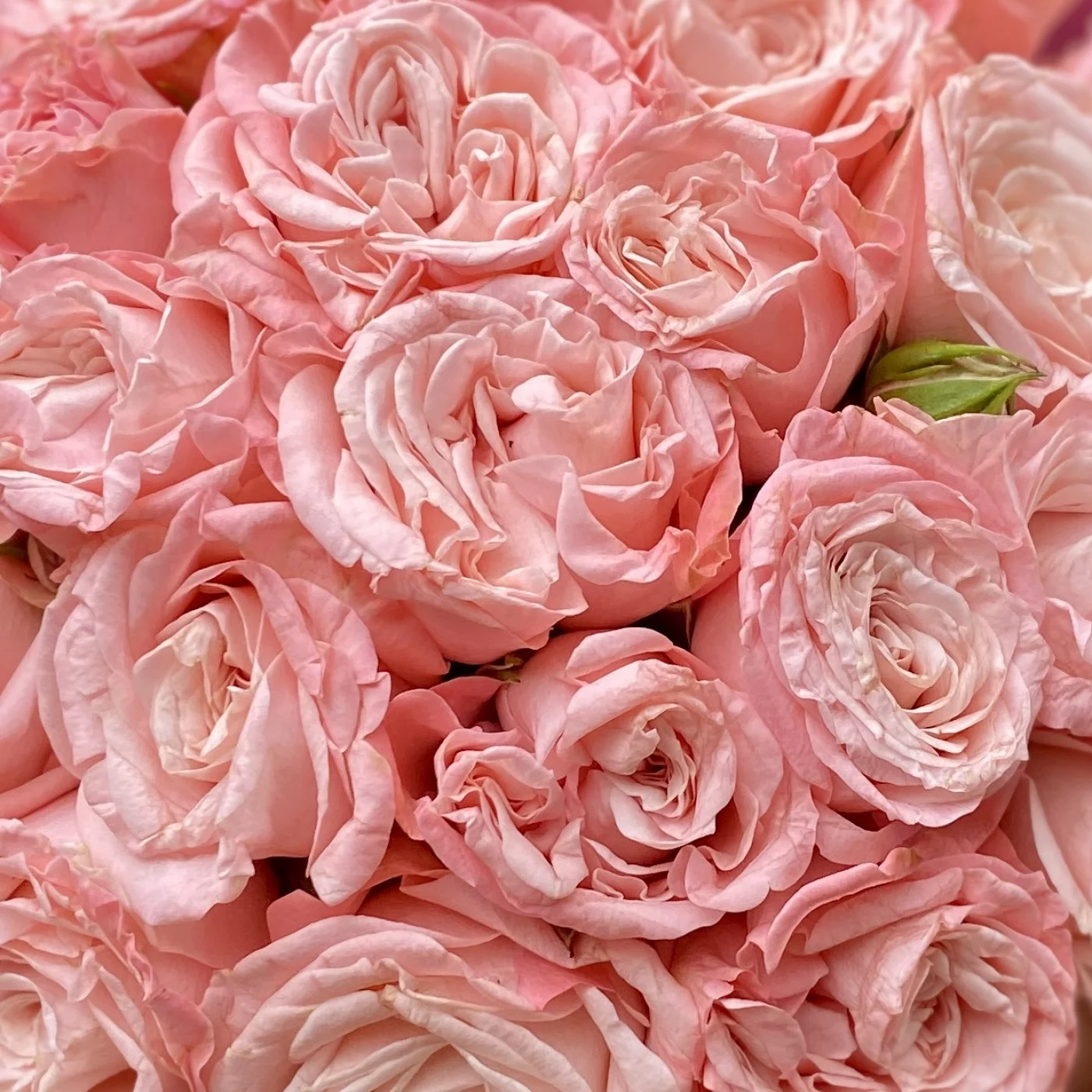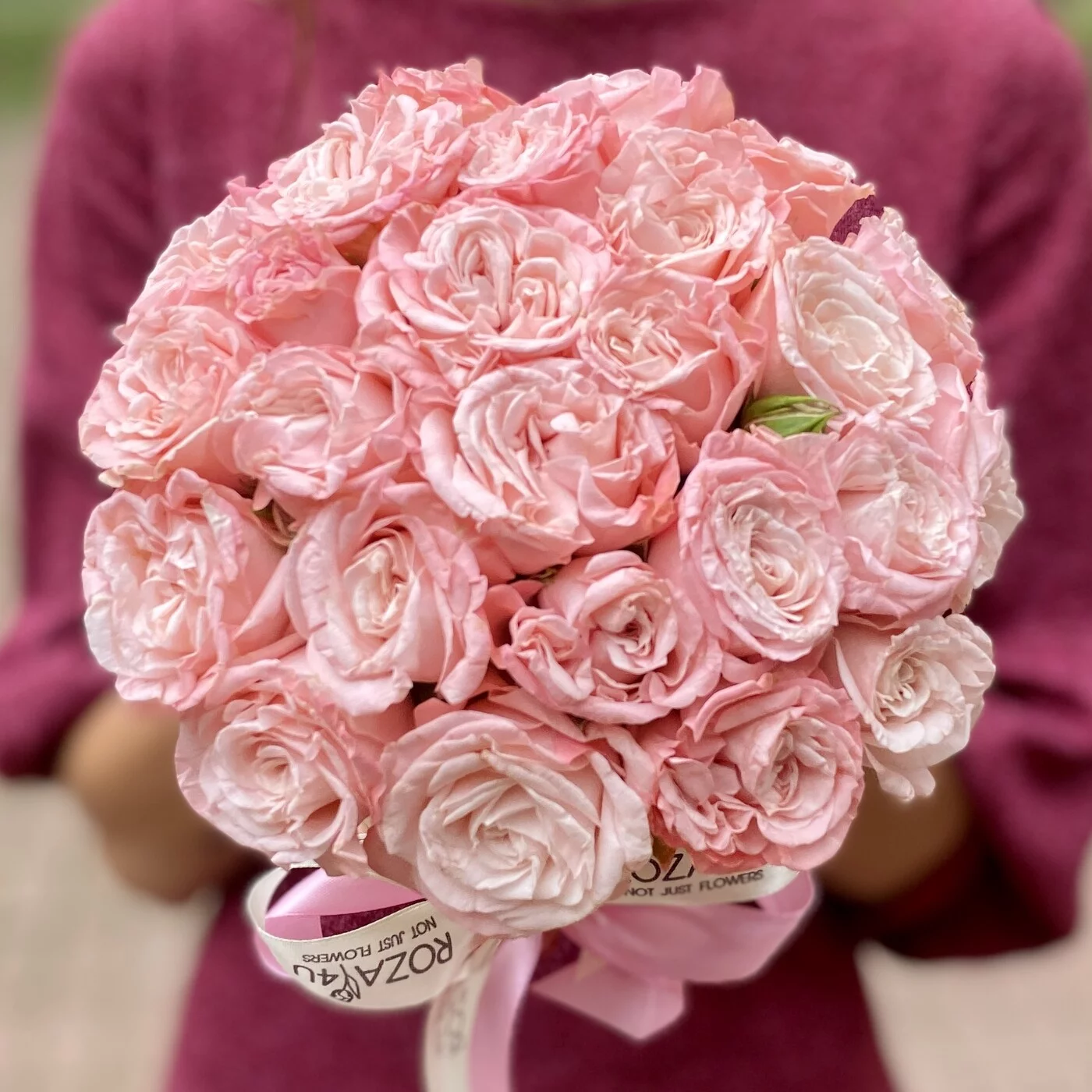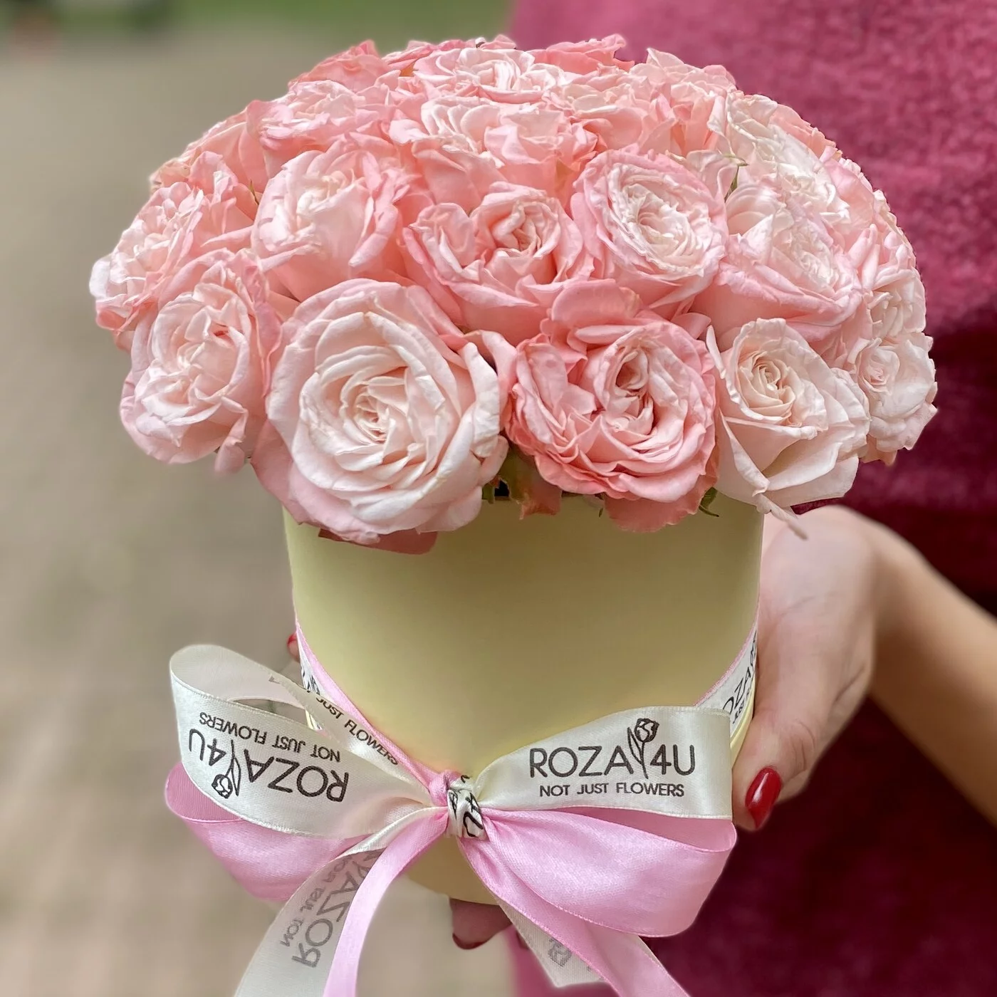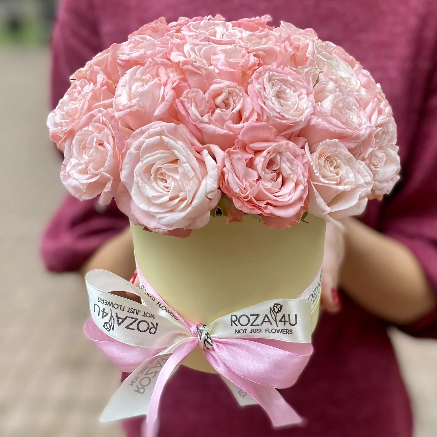 Нежная коробочка из кустовых пионоыидных роз сорта Мадам Бомбастик. Красивый комплимент для любимых.