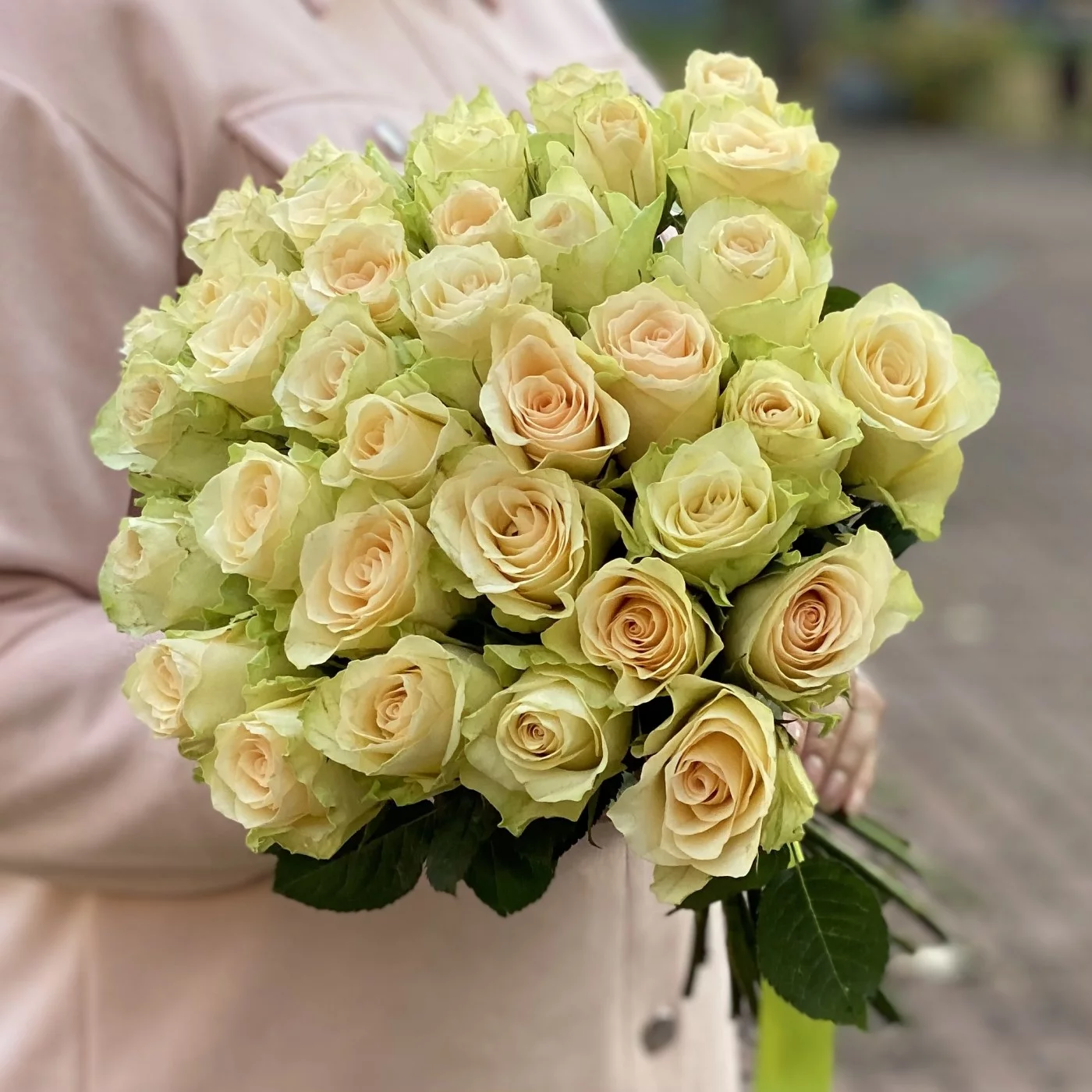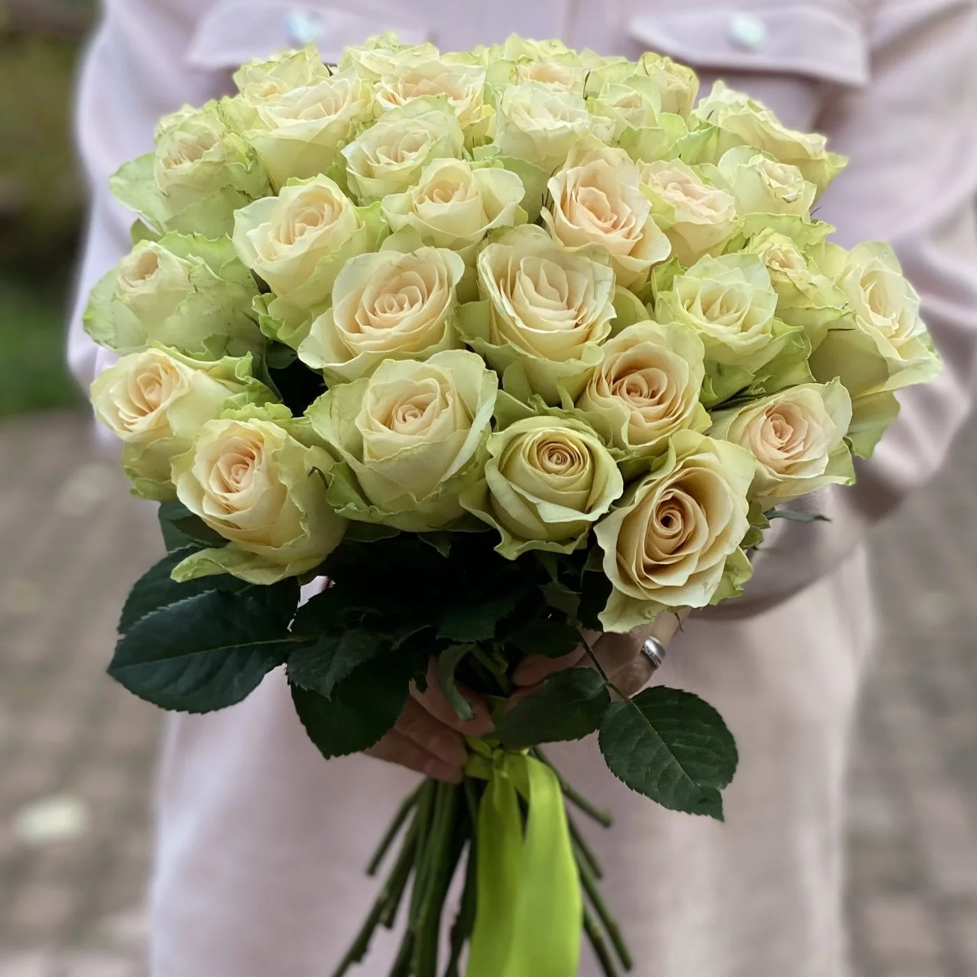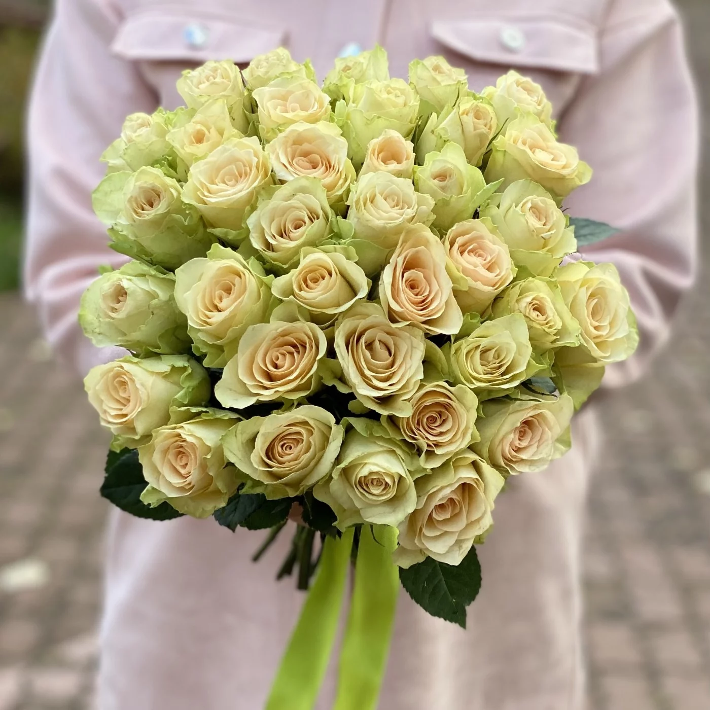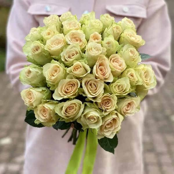 Розы сорта Киви отличаются нежностью желто-зеленых лепестков. Их необычный окрас переходит градиентом от салатового к нежно-лососевому, что делает эту оригинальную розу особенно любимой среди девушек.